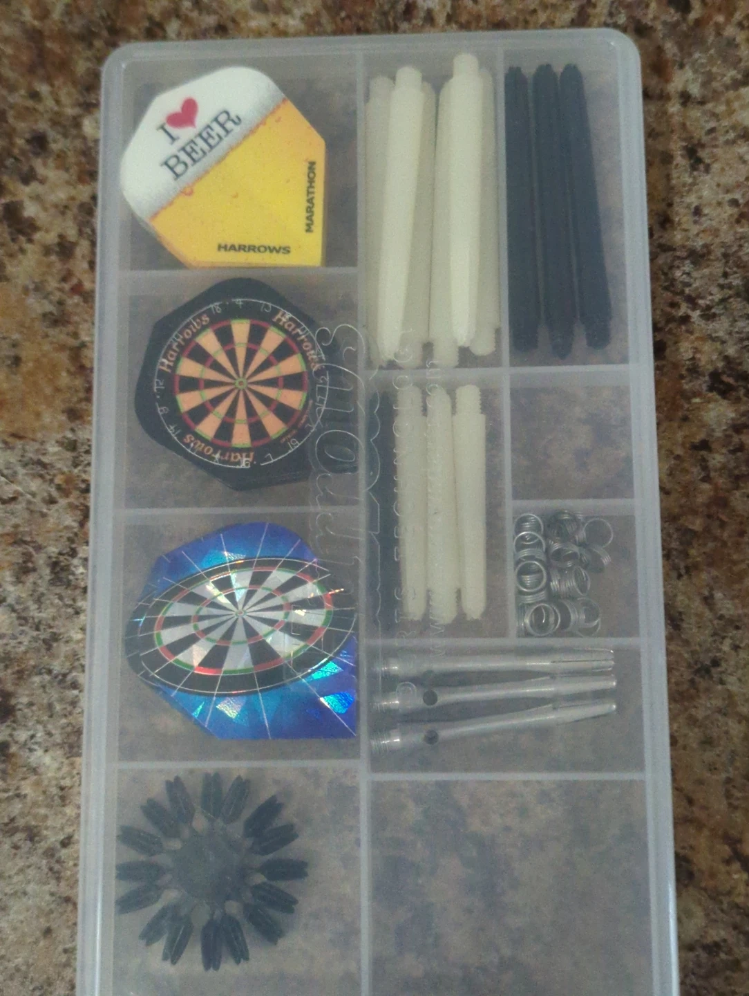 Selling a kit of dart accessories. Includes dart flights, shafts, and other small parts. Great for anyone who plays darts and needs replacement parts or wants to customize their darts.As is.
