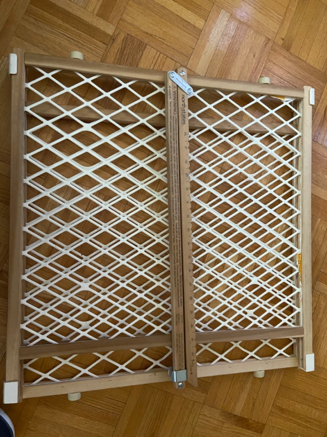 Selling a wooden baby gate. It's in great condition and ready to keep your little one safe! The gate is made of wood with a white plastic mesh.