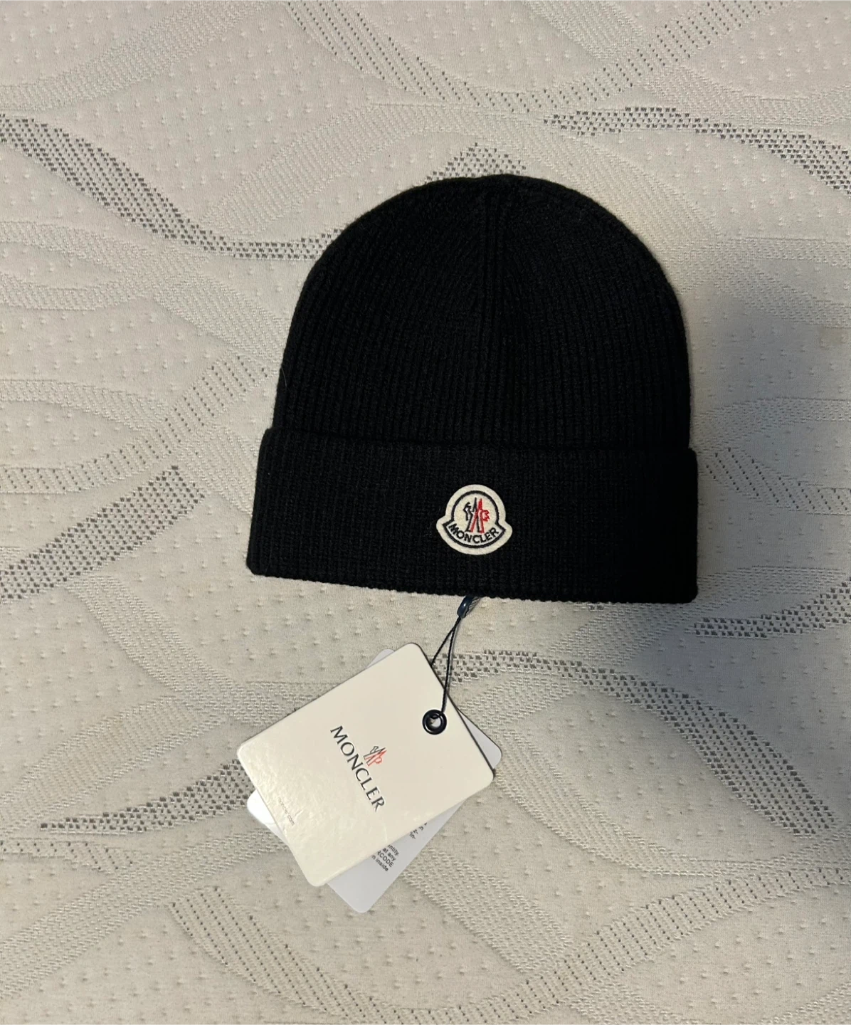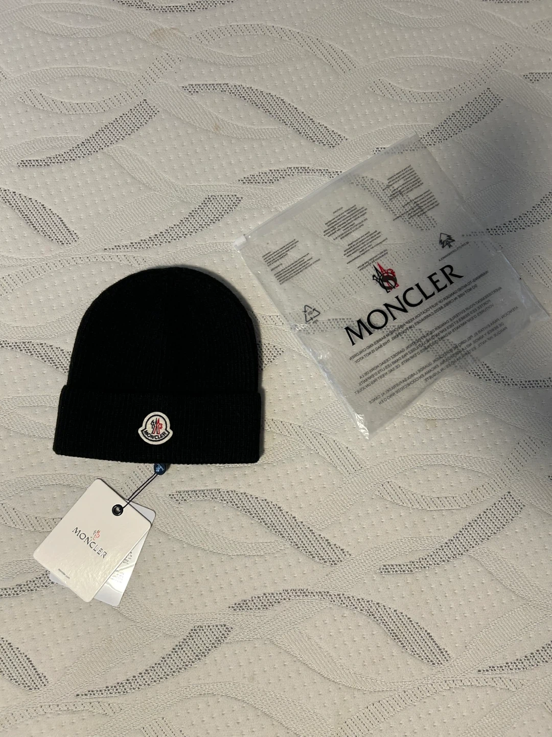 Selling a brand new with tags and the bag Moncler black knit beanie. It's in perfect condition and comes with the original packaging. A stylish and warm addition to your wardrobe for the colder months