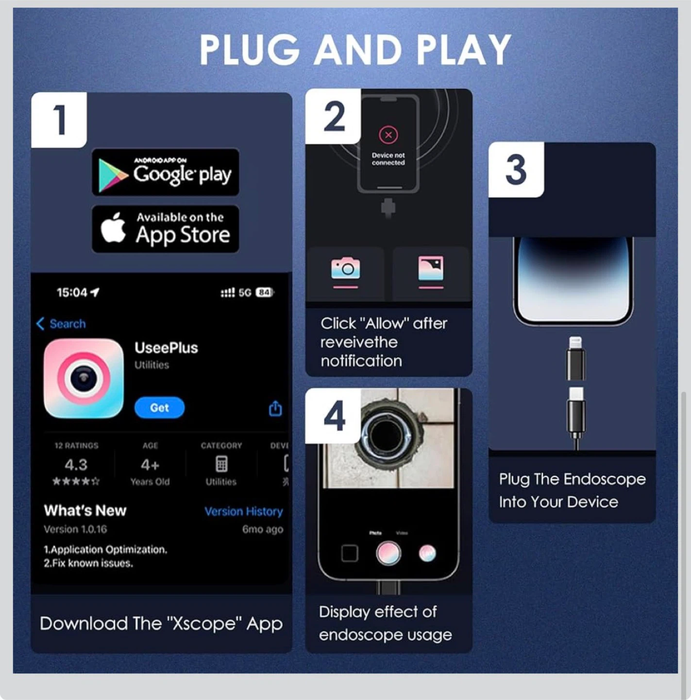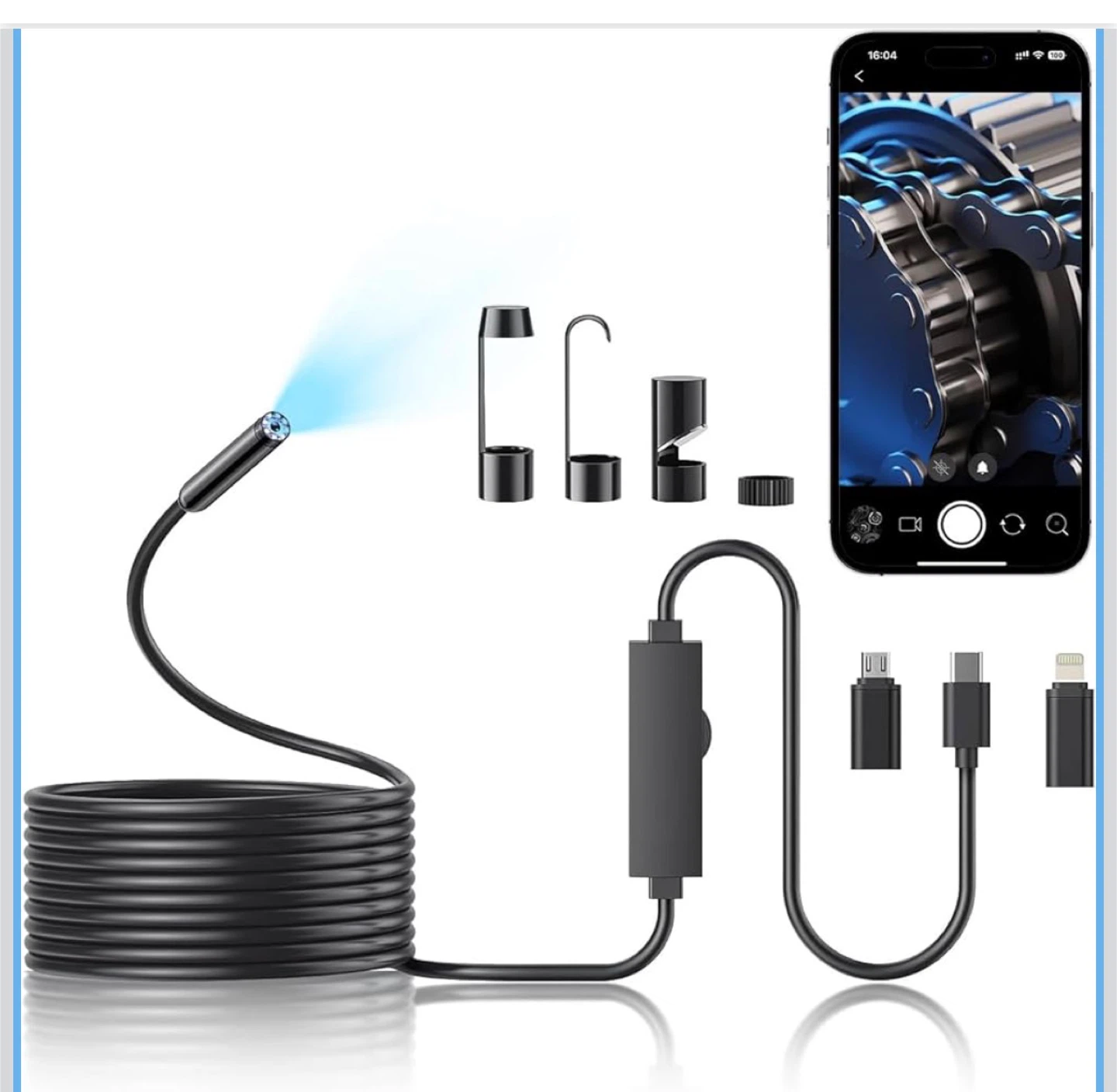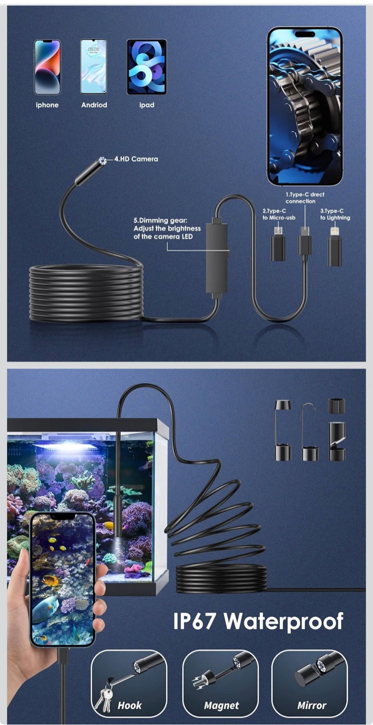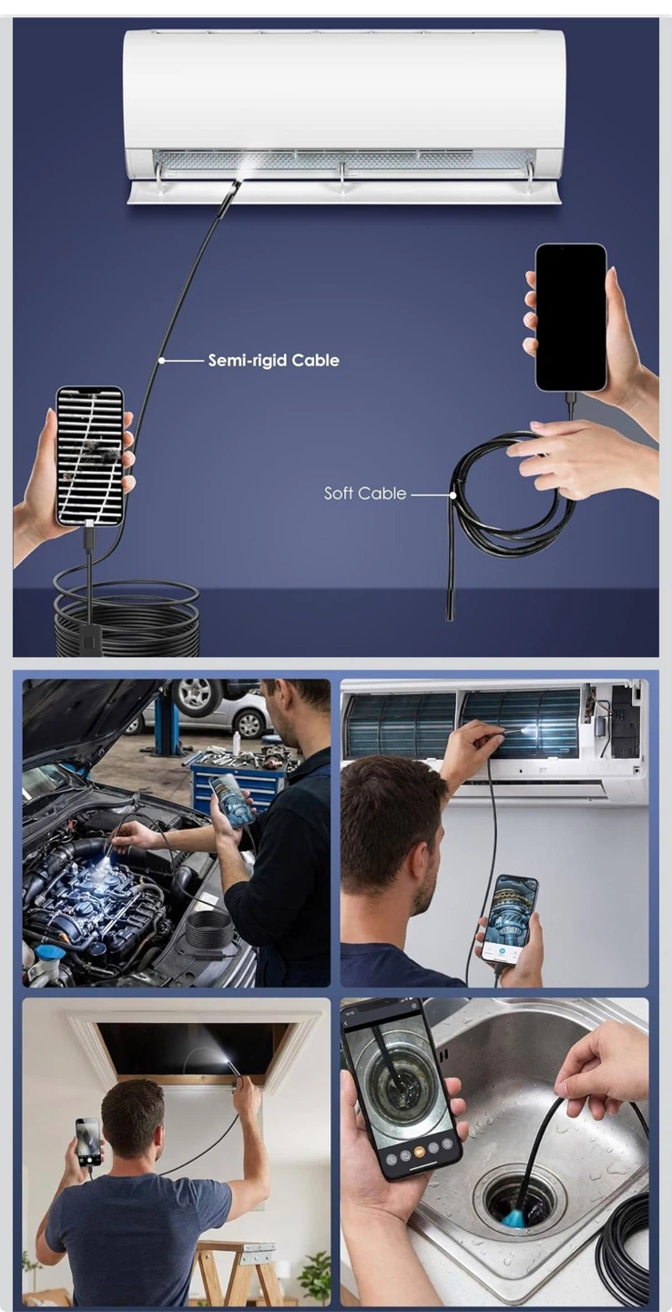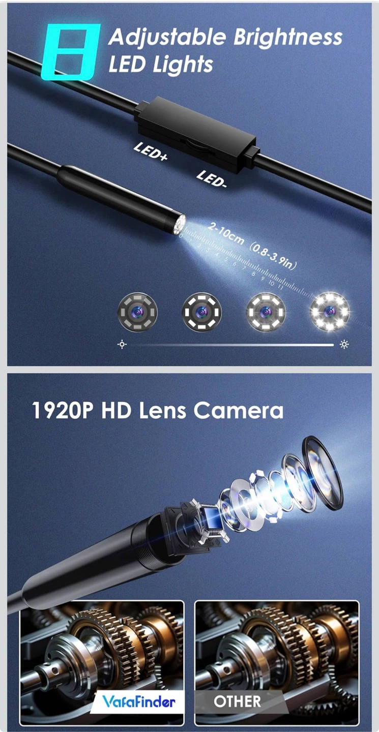 Endoscope Camera with Light, 1920P HD Borescope Camera with 8 Adjustable LED, 16.4FT Semi-Rigid Snake, IP67 Waterproof 8mm Inspection for iOS and Android (Single-Lens)