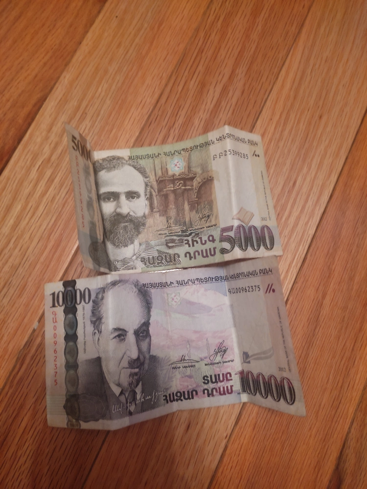 if you happen to be going to Armenia anytime soon I have Armenian dram. since I can't find anywhere to exchange it in Canada I thought I'd see if anyone on karrot needs it? currently 15000 dram is worth about 51$ Canadian so I'm setting this at 40$