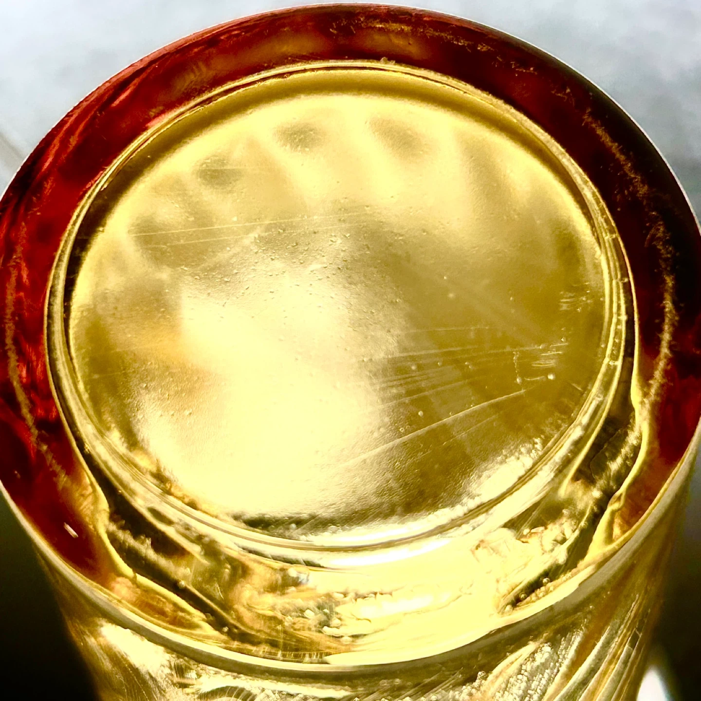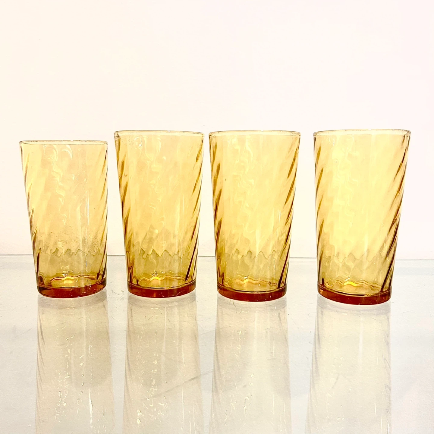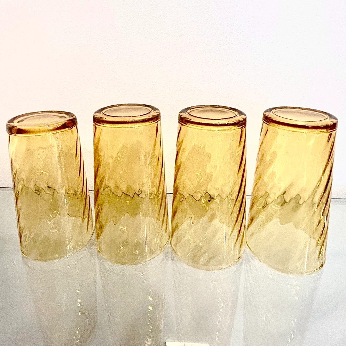 Offered is a matched set of four vintage amber/yellow tumblers with a twist/swirl optic and an applied amber foot/ring base. The glass has that classic mid-century “hand-worked” look—subtle waviness, lively light refraction, and visible swirl movement that collectors chase in barware and studio-style production glass.