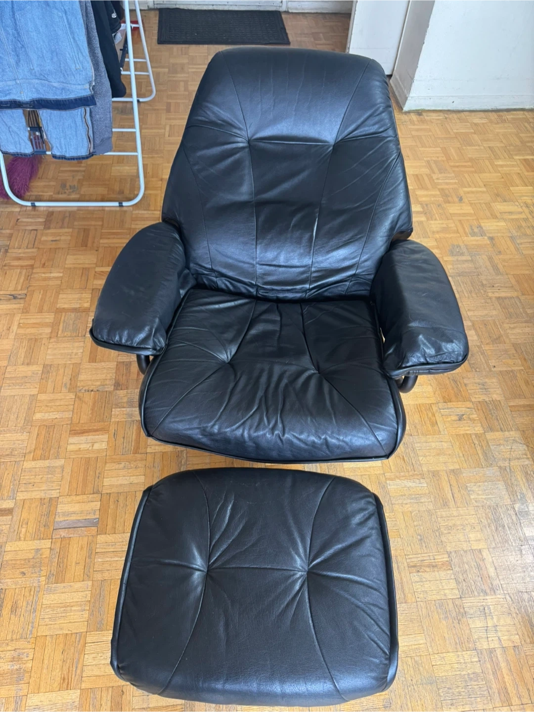 Here's a comfy black leather swivel chair with a matching ottoman. It's in good condition and would be a great addition to any living room or den. The chair swivels smoothly and the ottoman provides extra support for your legs. Perfect for relaxing after a long day!