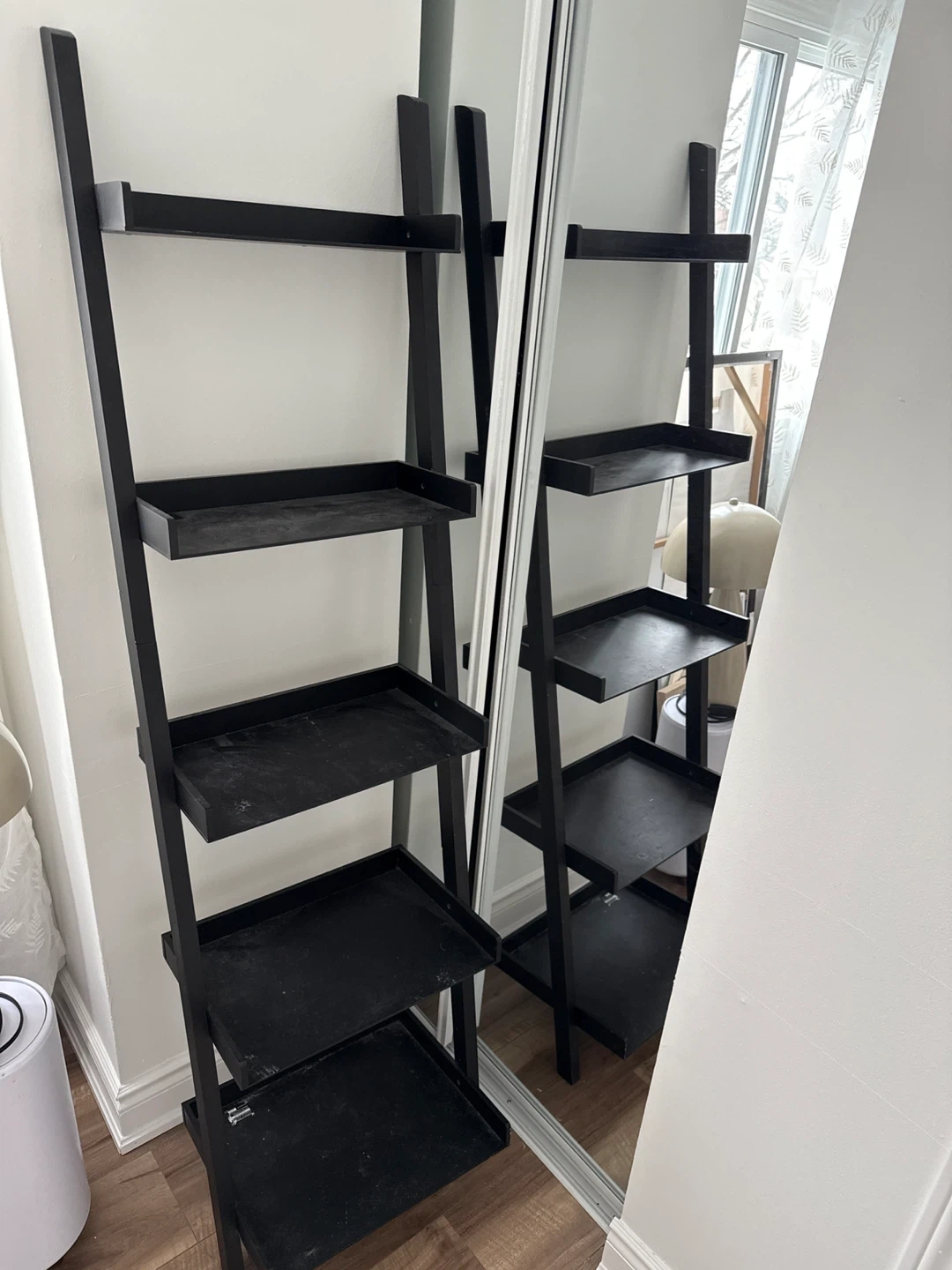 Selling a black ladder shelf. It's in great condition and perfect for adding some storage and style to any room! The shelf has multiple tiers, providing ample space for displaying plants, books, or other decorative items