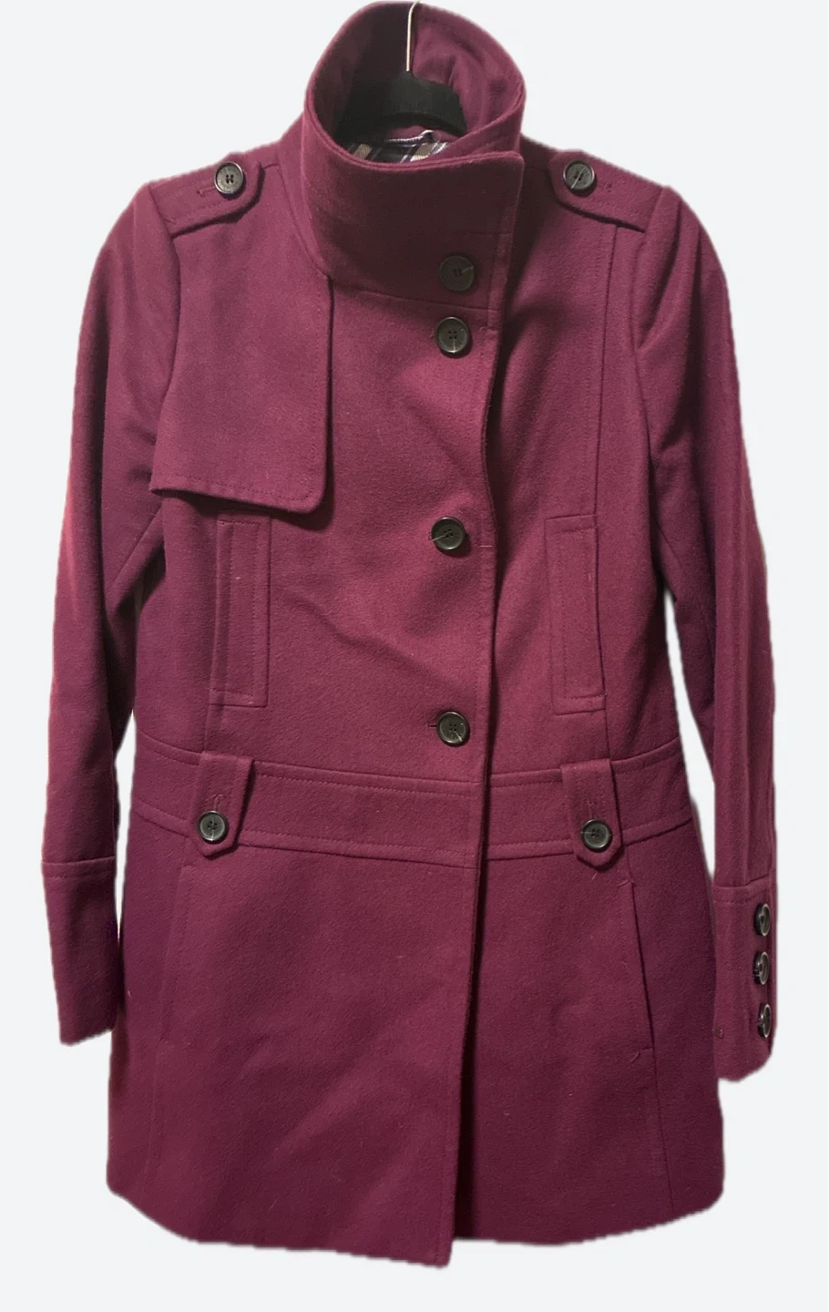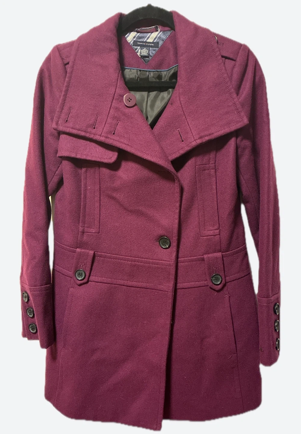 A stylish Tommy Hilfiger coat in a lovely burgundy colour! This wool blend coat is perfect for cooler weather and is in great condition. It features a unique design with button details and a tailored fit. A great addition to any wardrobe!