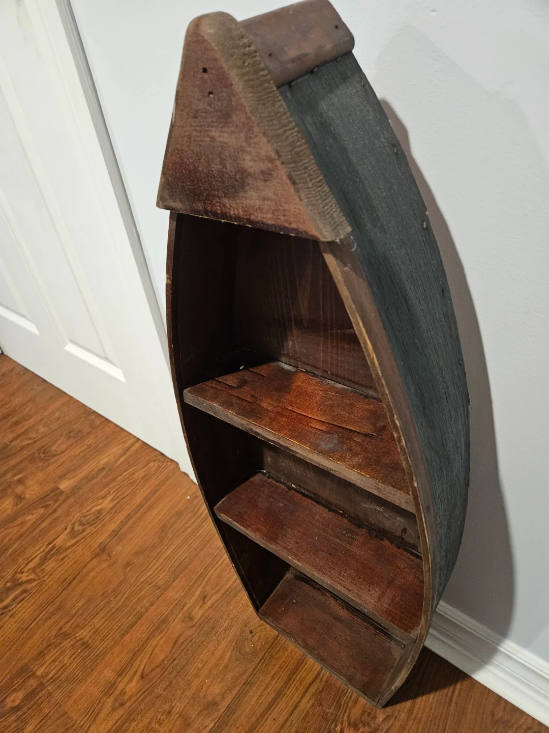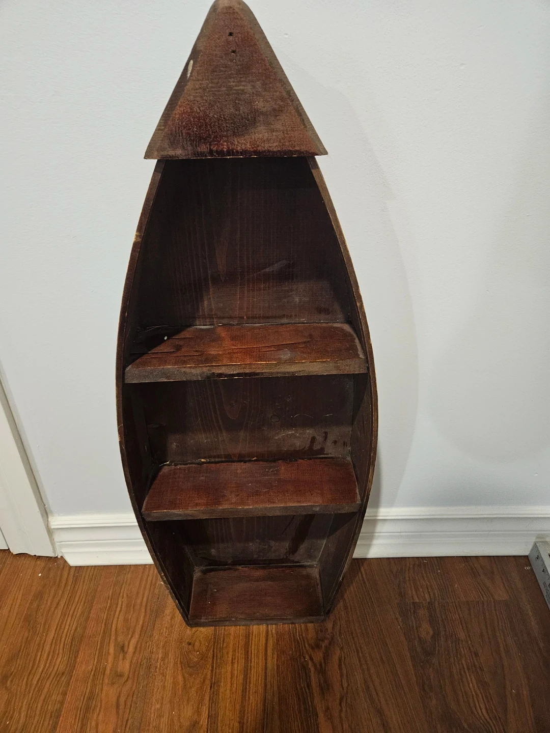 Selling a unique wooden boat-shaped shelf! It has three shelves inside, perfect for displaying small items or books. It's a charming piece that would add character to any room