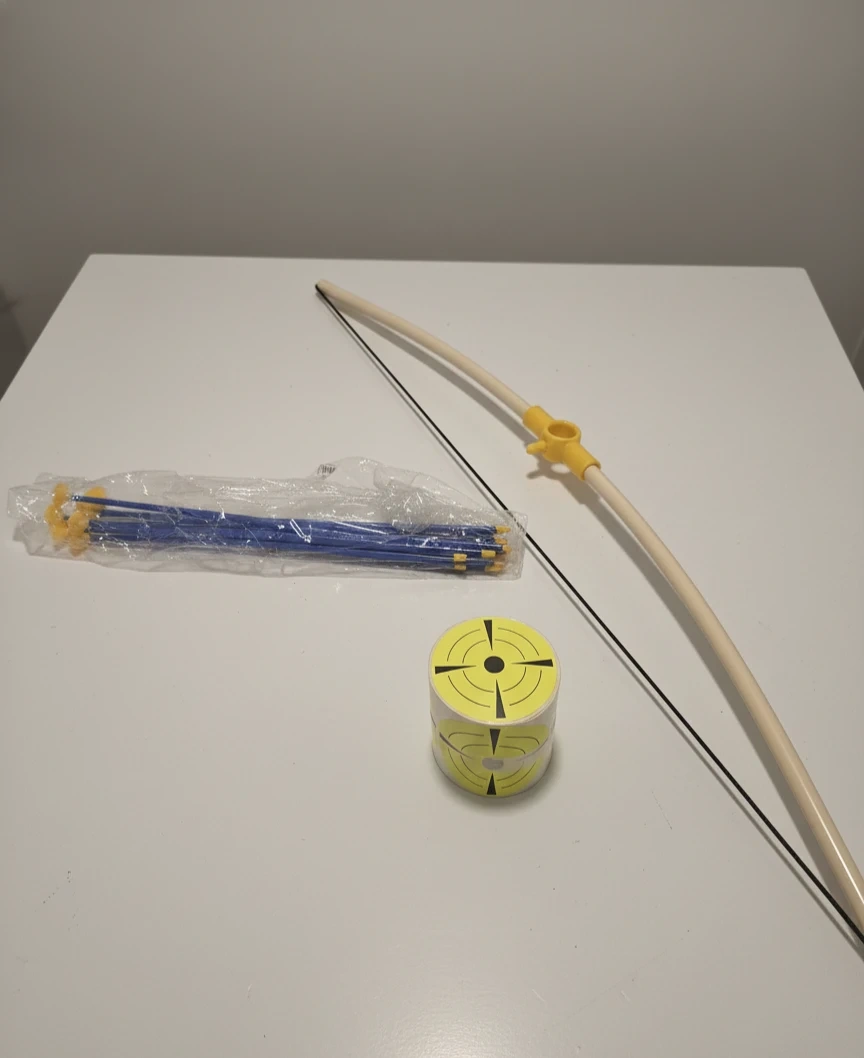 Selling a kids archery set. It comes with the bow, a set of arrows still in their packaging, and a target. Perfect for some outdoor fun!
