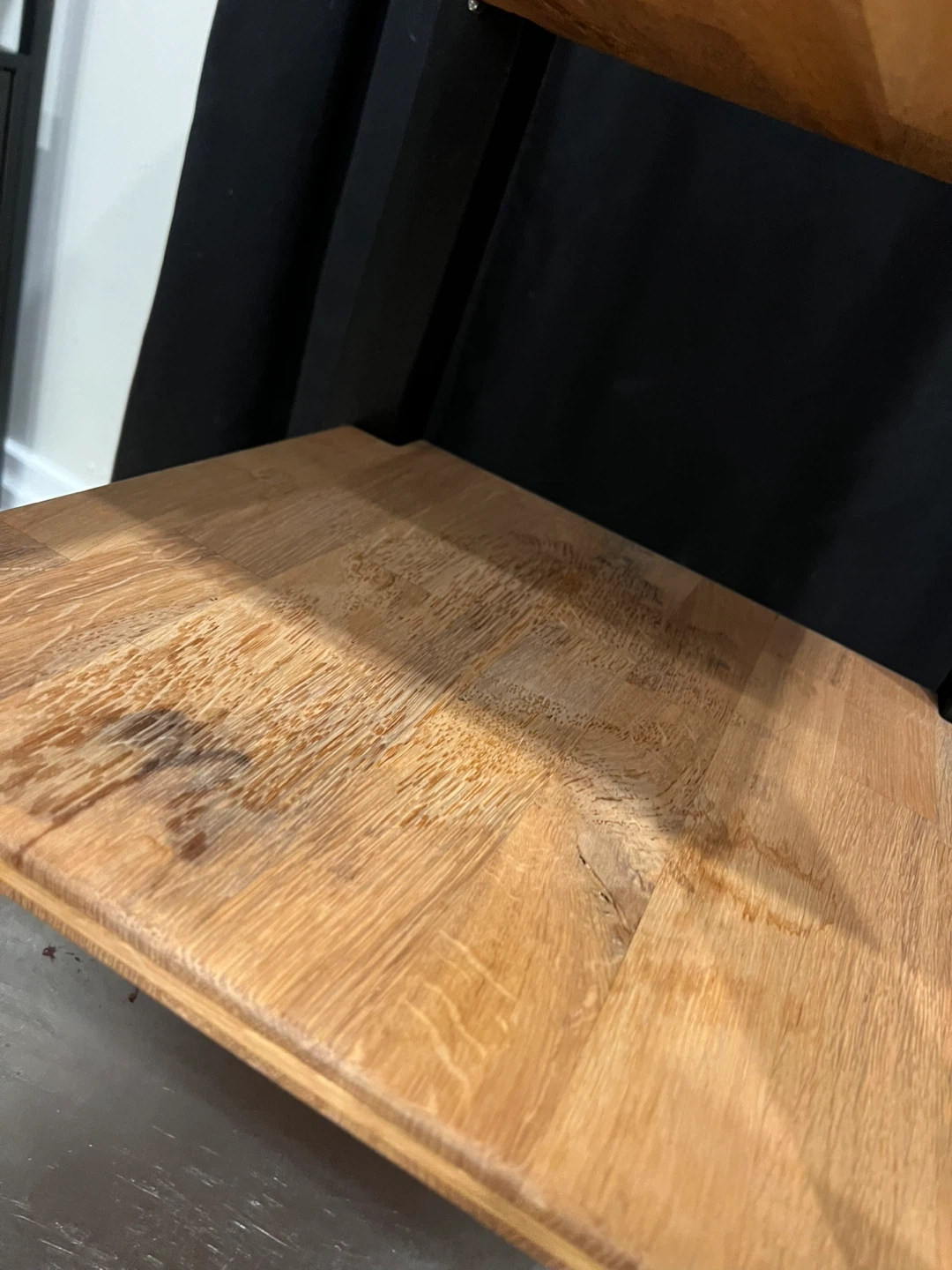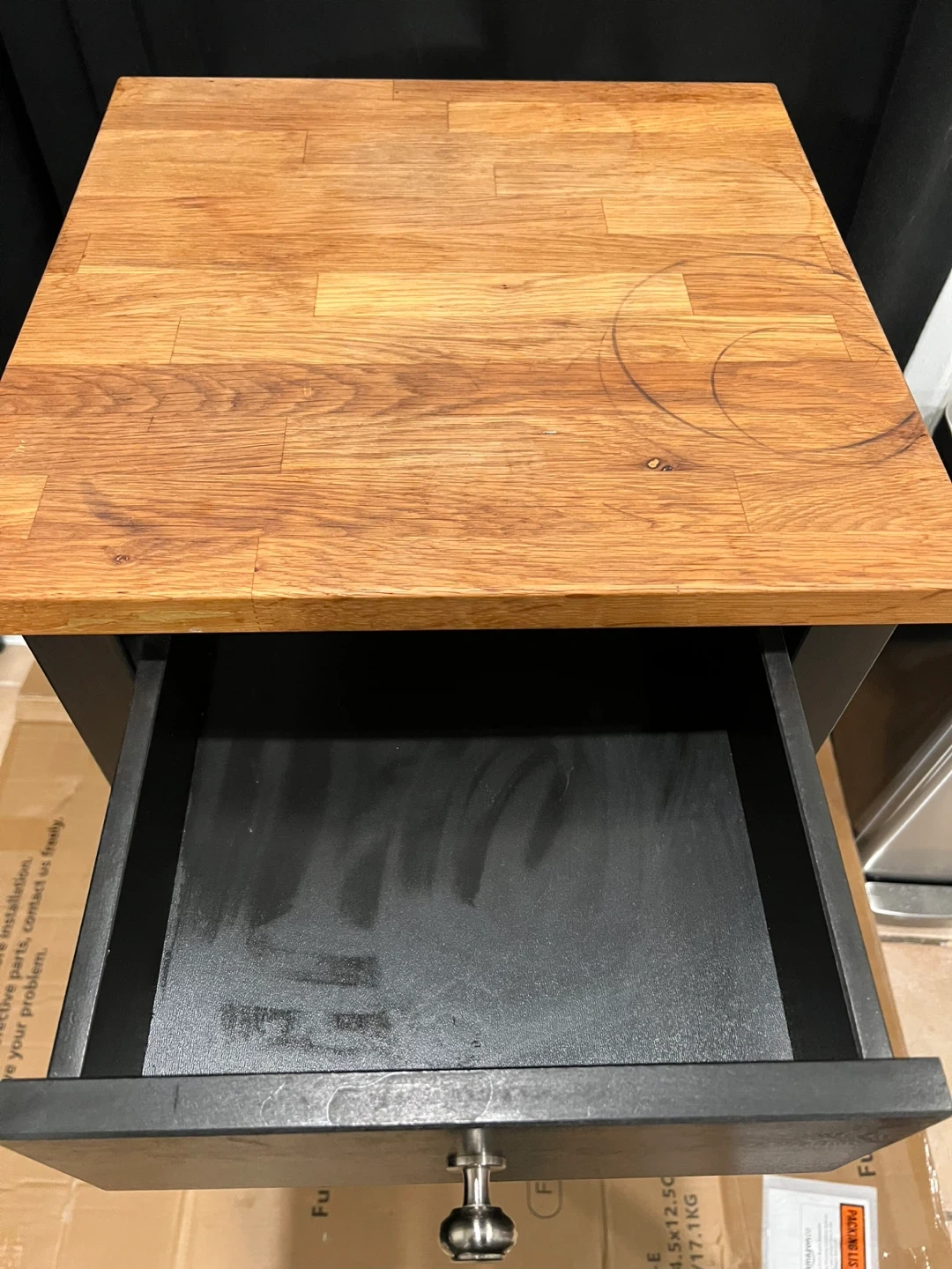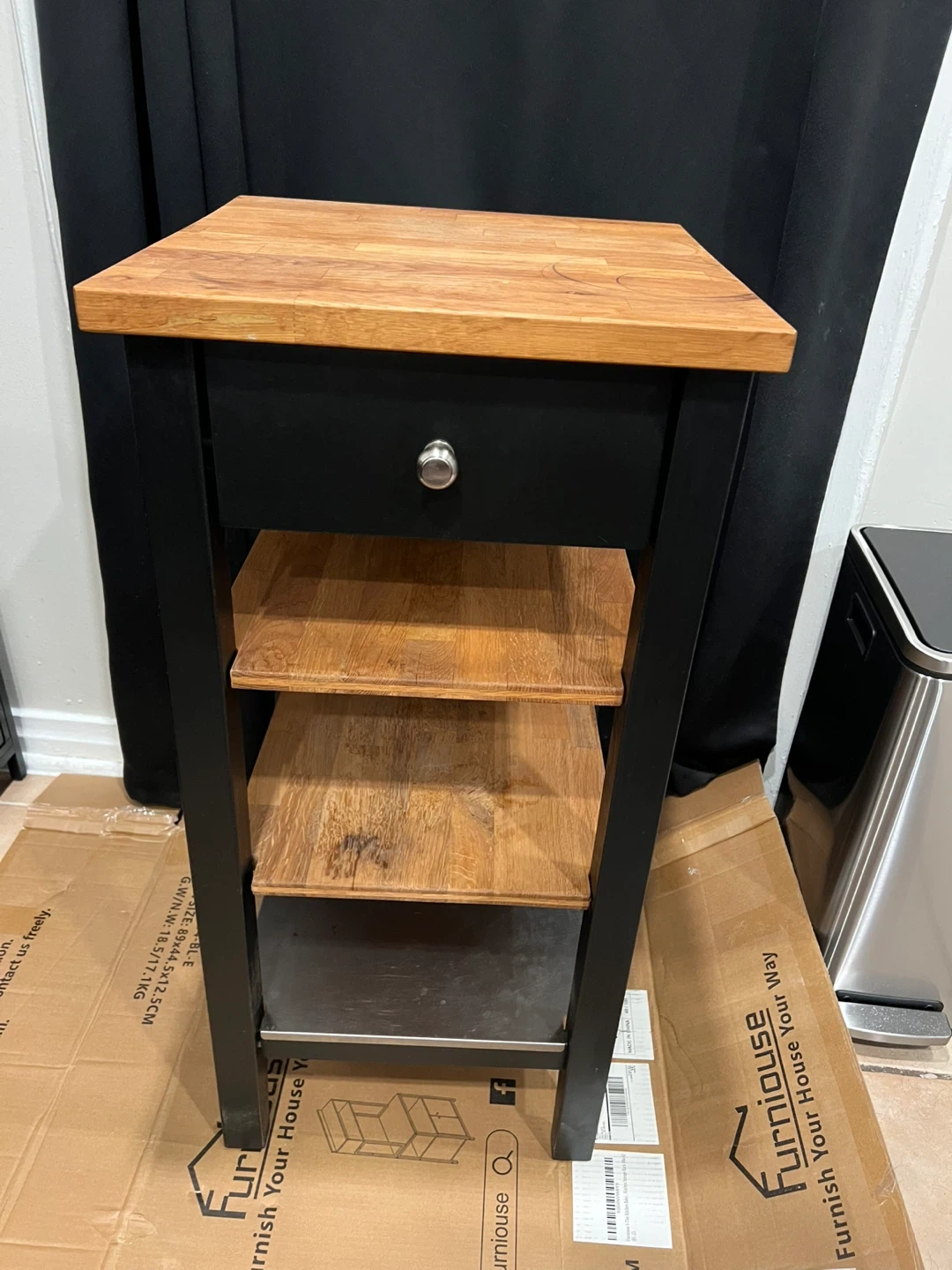 Kitchen island cart with a wooden top and black frame. It has a drawer and shelving for storage. It has been used in a garage, has many marks / signs of wear