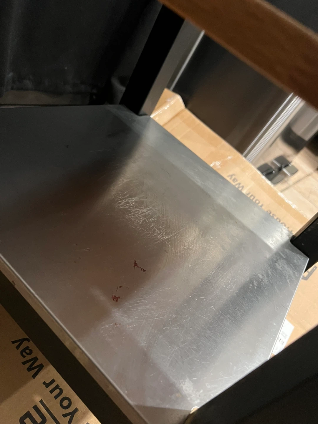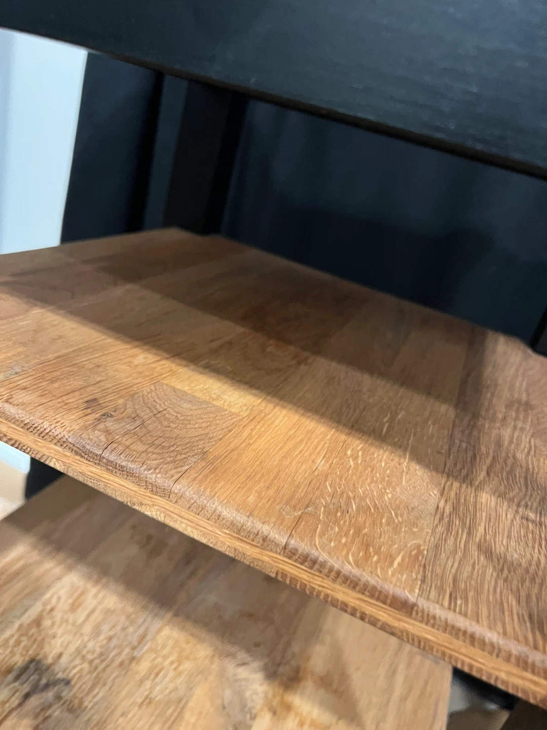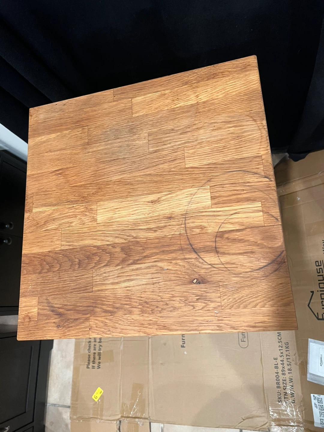 Kitchen island cart with a wooden top and black frame. It has a drawer and shelving for storage. It has been used in a garage, has many marks / signs of wear