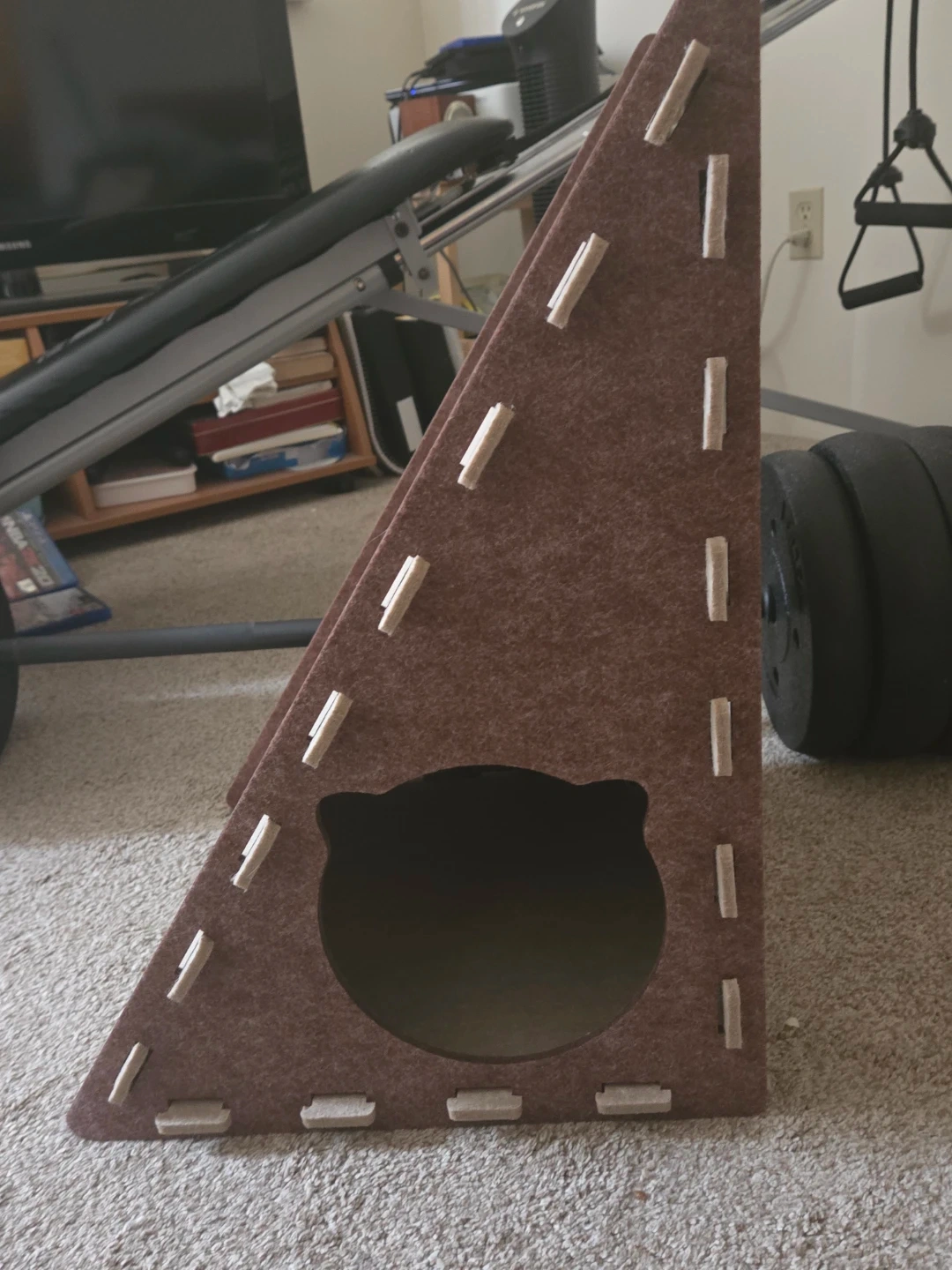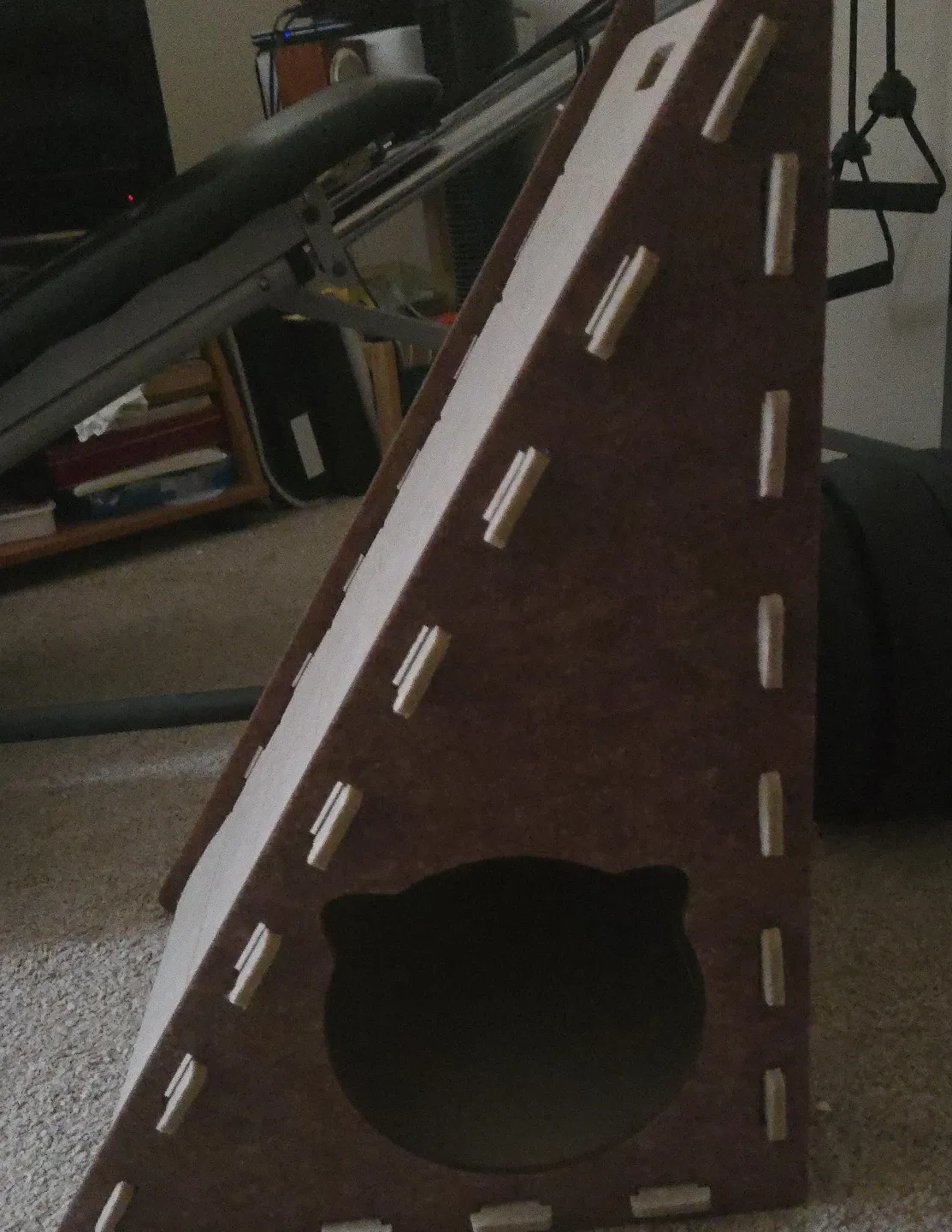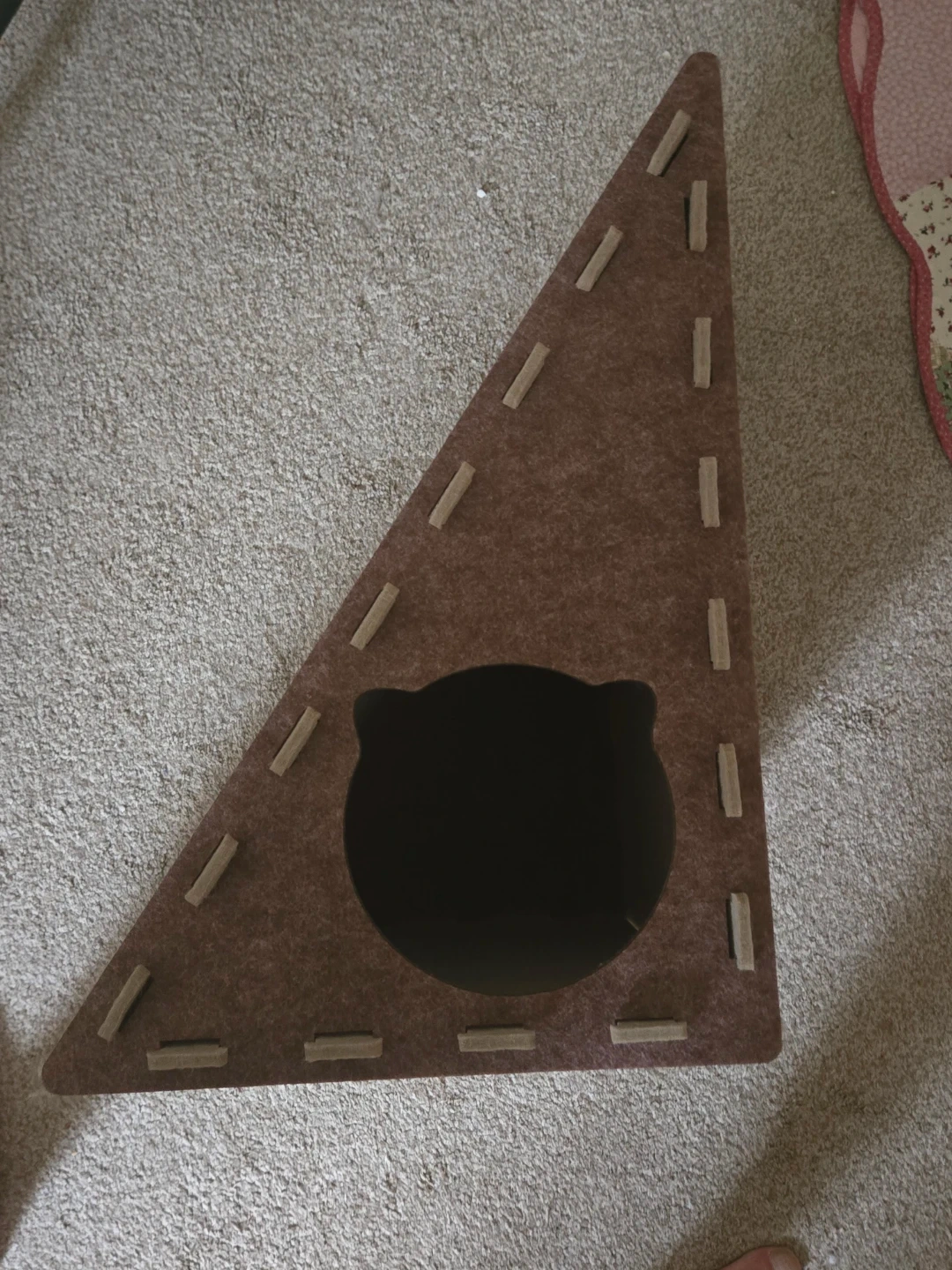 Looking to give your kitty a fun new place to play and relax? This triangle-shaped cat house could be just the thing! It features a cute cat-shaped entrance and integrated scratching surfaces for your feline friend to enjoy.