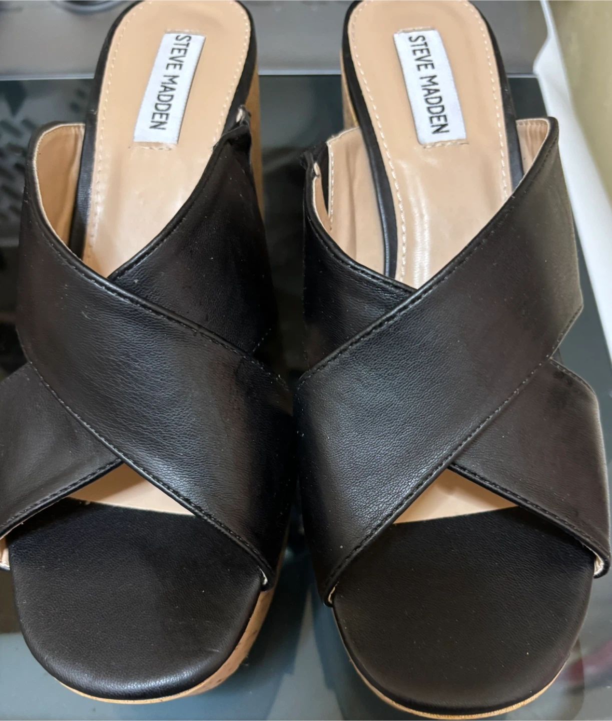 Selling a pair of Steve Madden platform heels in size 10. They feature a stylish black leather upper and a unique cork-style heel. Perfect for adding a touch of elegance to any outfit.
