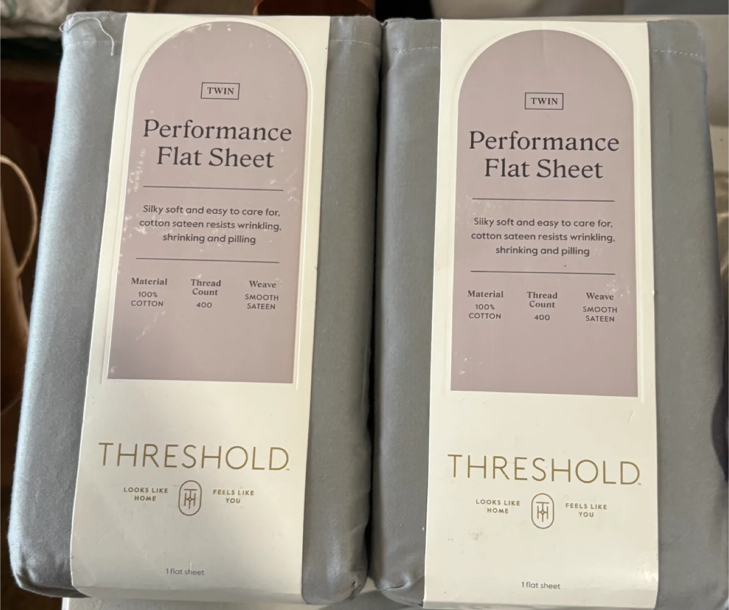 Selling two Threshold Performance Flat Sheets, twin size. They are brand new in the original packaging! These sheets are silky soft, easy to care for, and resist wrinkling, shrinking, and pilling. Made from 100% cotton with a 400 thread count and a smooth sateen weave.