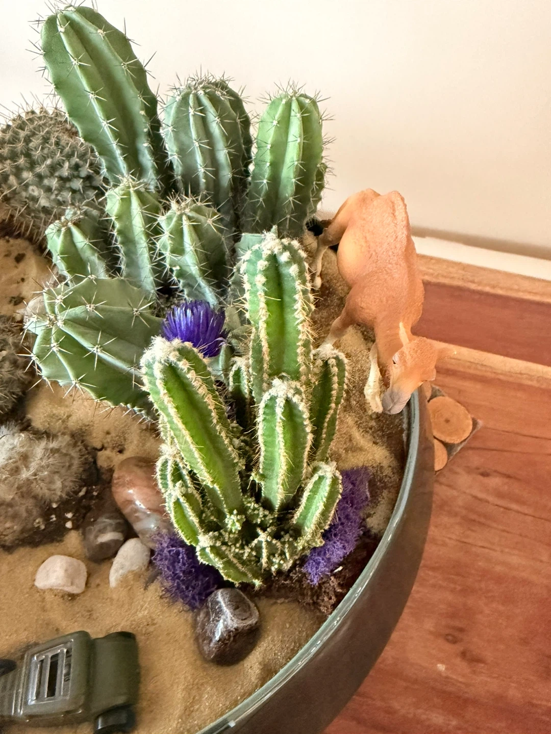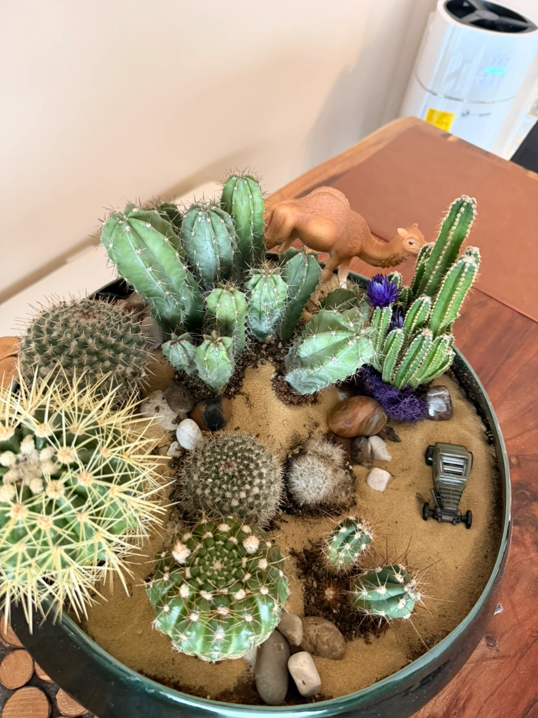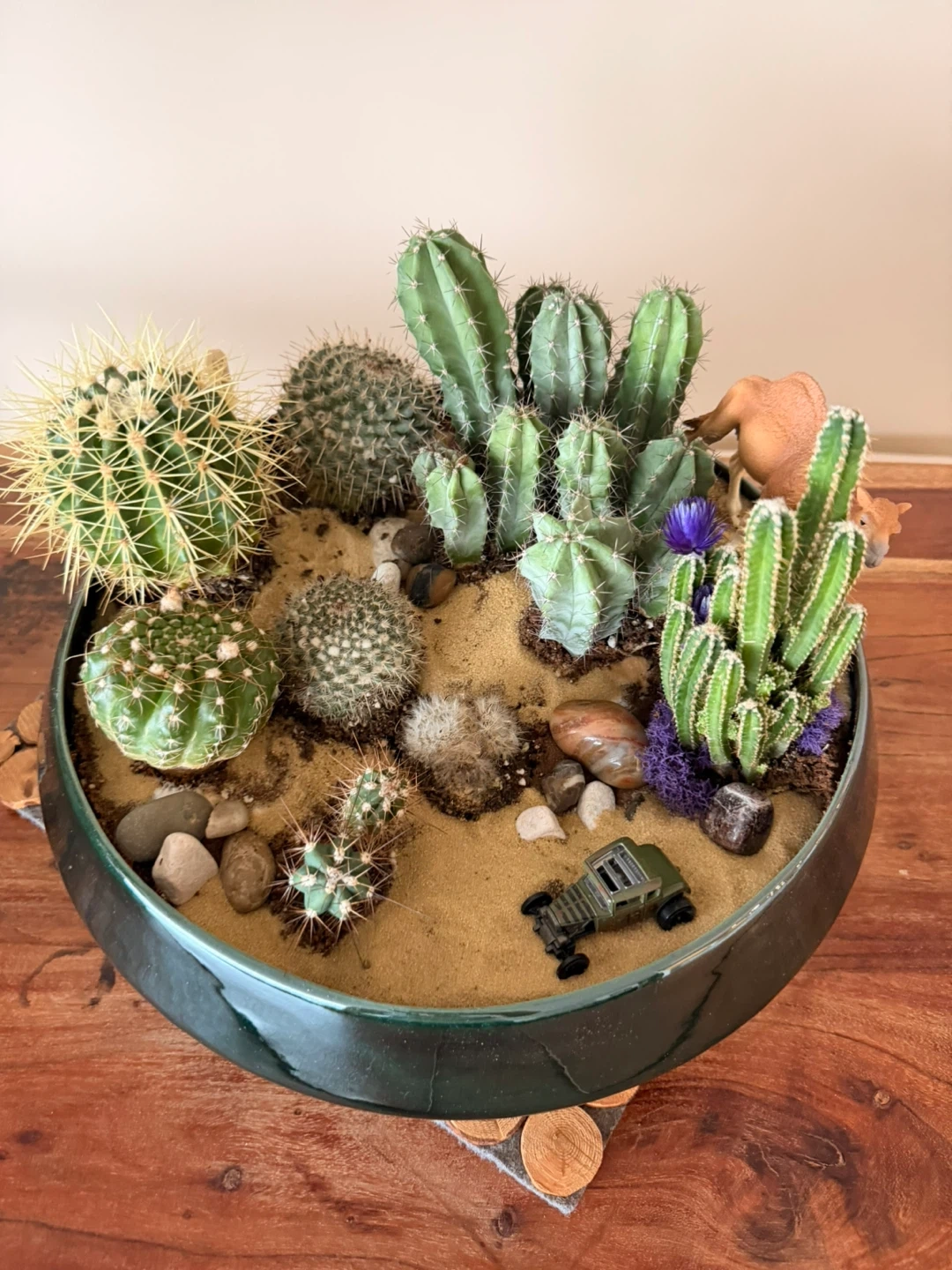 A lovely cactus arrangement in a decorative bowl, perfect for adding a touch of desert charm to your home! It includes a variety of cacti, sand, rocks, and even a little toy car and camel for added whimsy