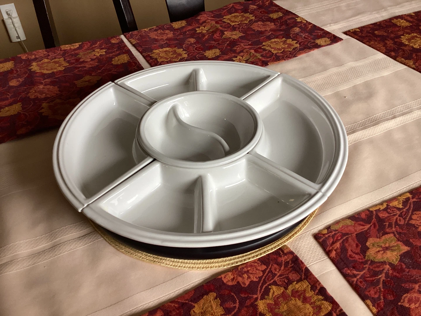 Selling a lovely white ceramic serving dish! It features a divided design, perfect for serving snacks or appetizers on beautiful wooden turntable. The dish is in great condition and ready for its next gathering