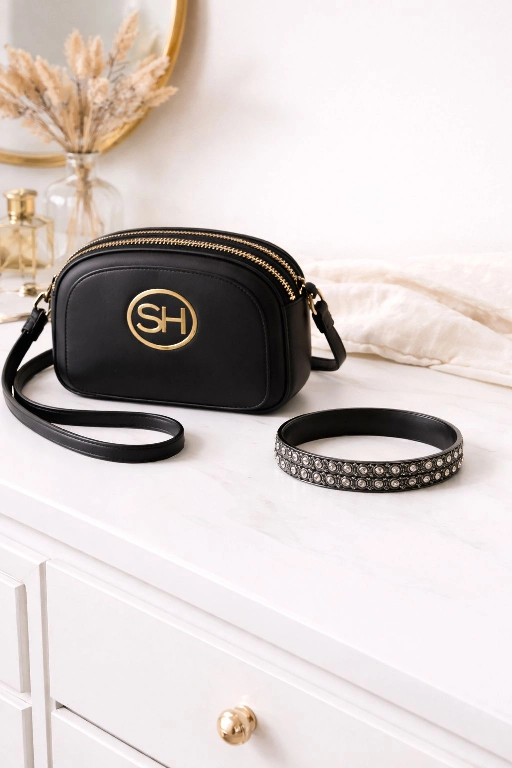 !Stylish black accessory bundle featuring a brand new black crossbody bag paired with a brand new black bangle bracelet with rhinestone-style accents. A sleek, coordinated set that transitions effortlessly from day to night.