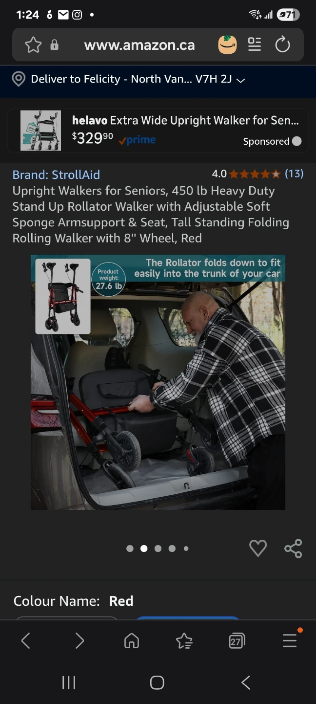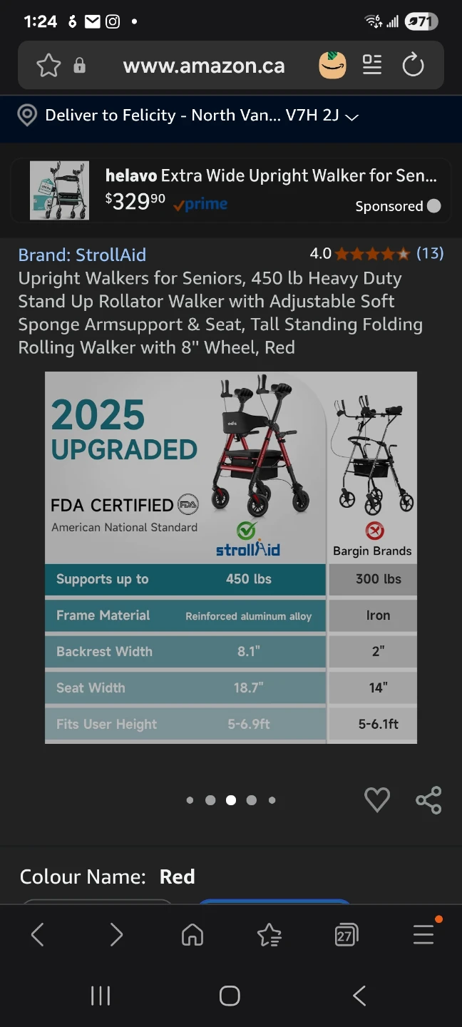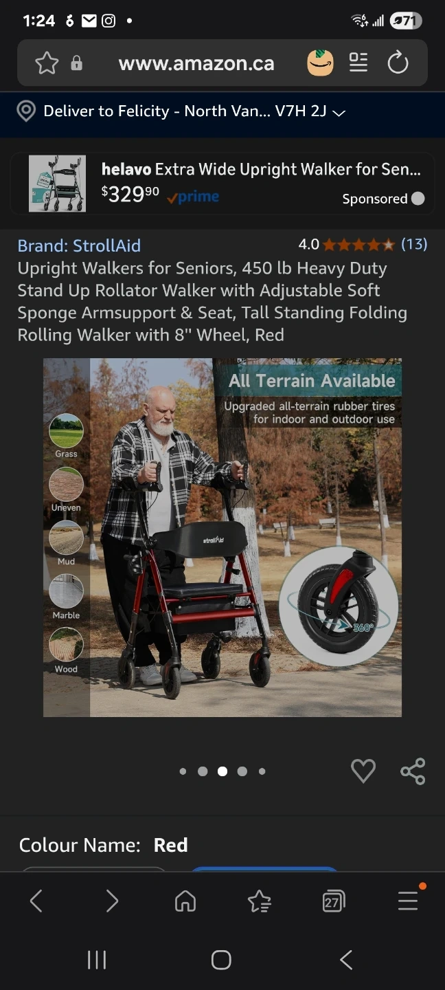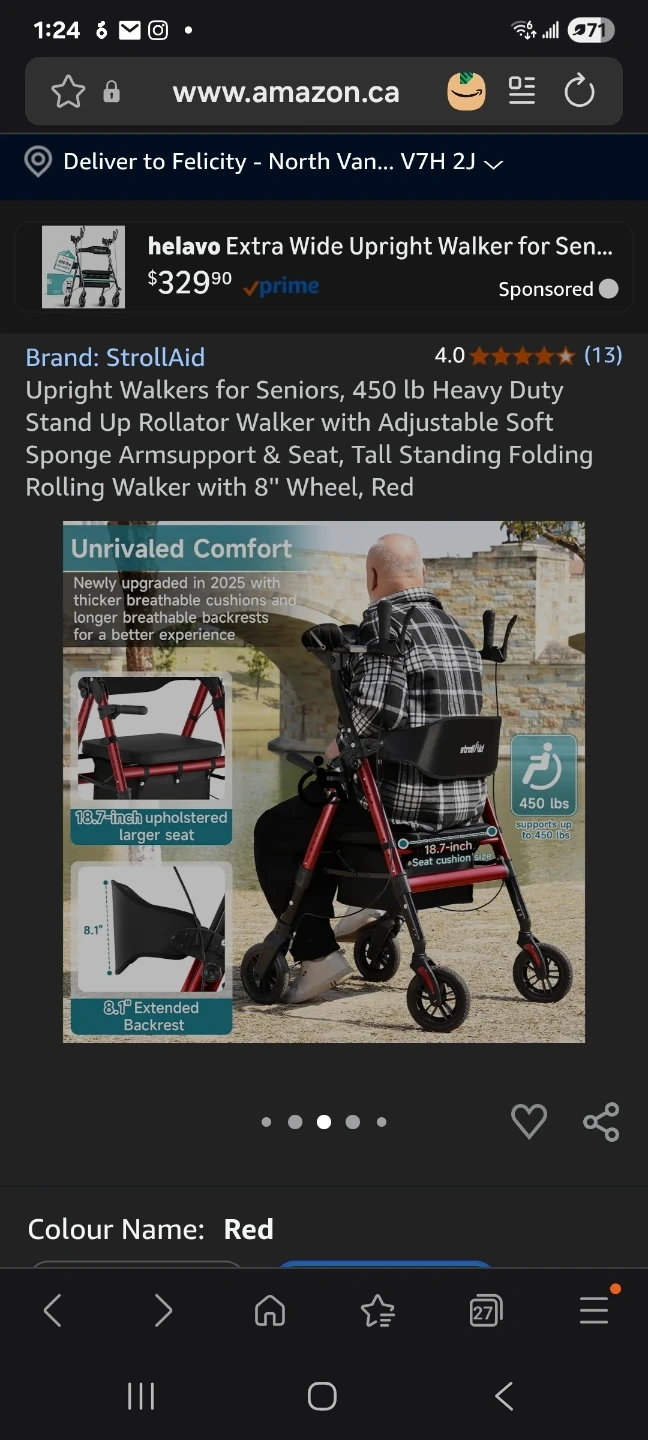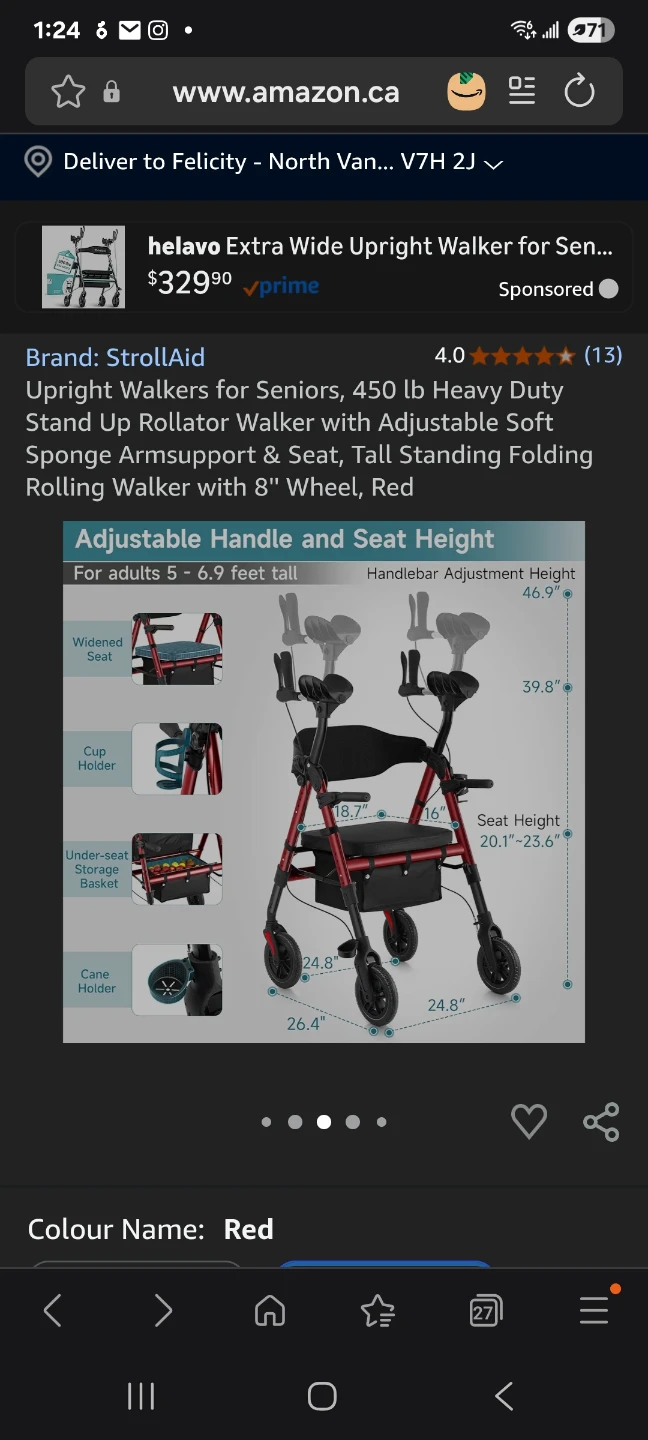 Upright Walkers for Seniors, 450 lb Heavy Duty Stand Up Rollator Walker with Adjustable Soft Sponge Armsupport & Seat, Tall Standing Folding Rolling Walker with 8'' Wheel, Red