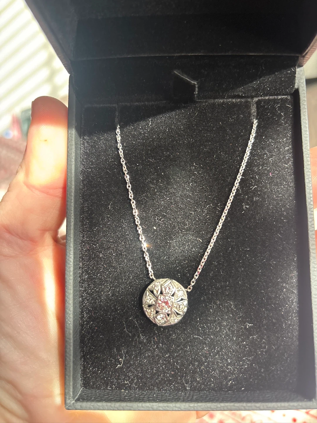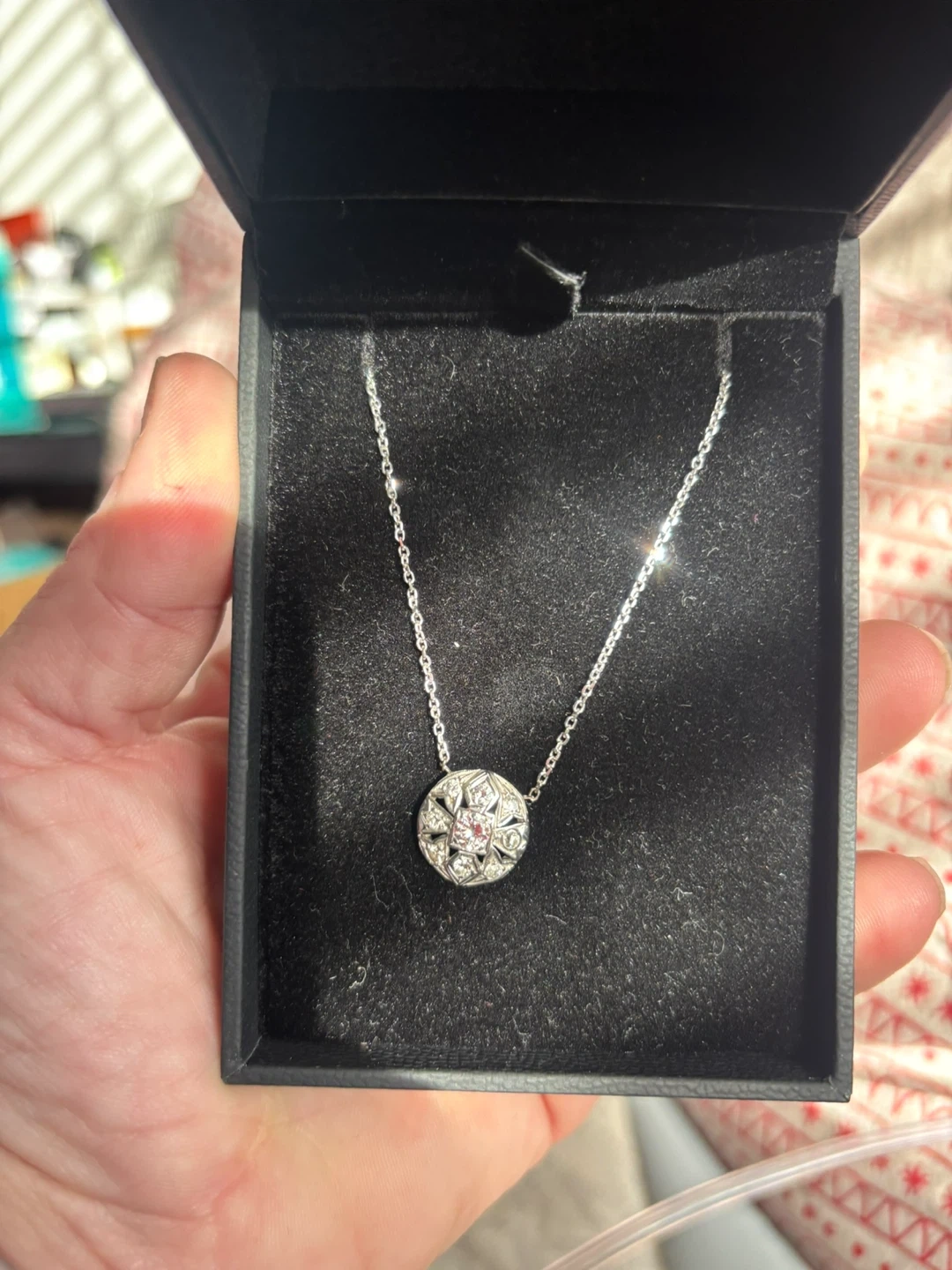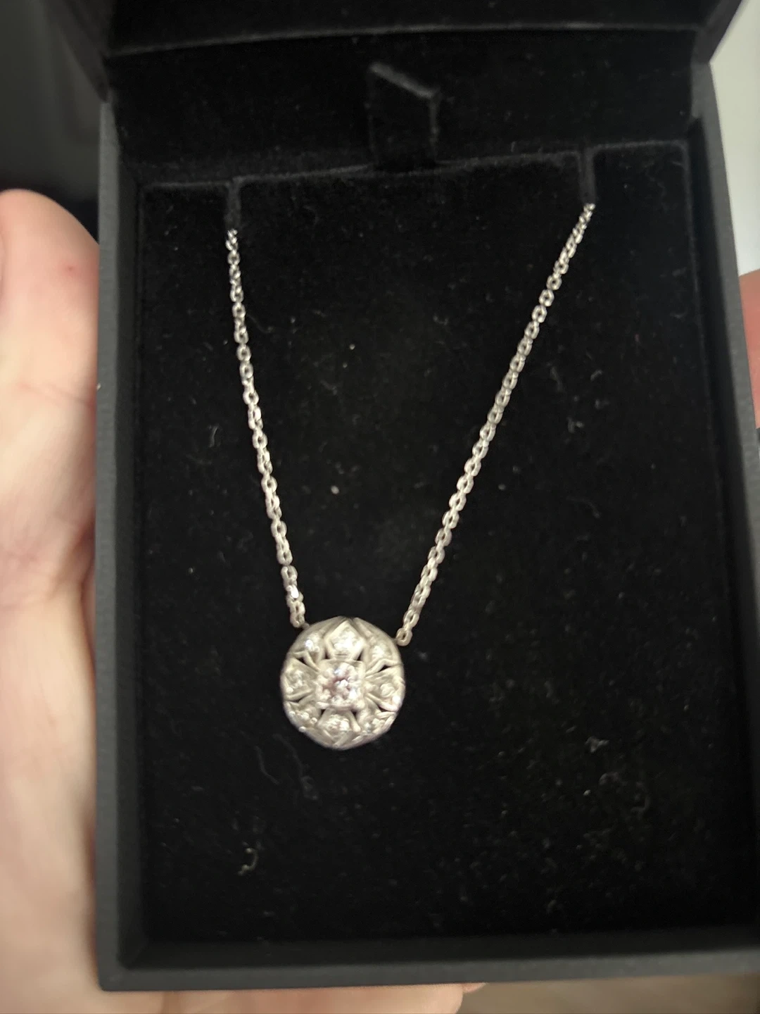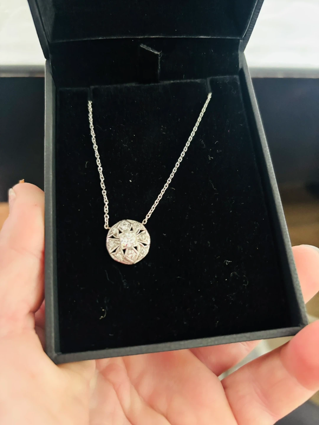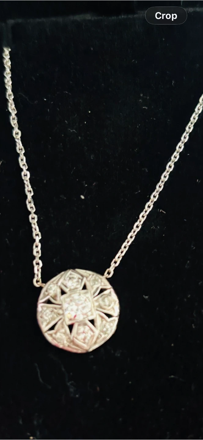 Selling a beautiful white gold necklace featuring a unique round pendant. It comes in a box, perfect for gifting or safekeeping. The necklace is in excellent condition and ready to add a touch of elegance to any outfit from the early 1900s