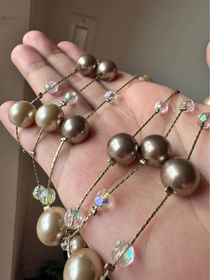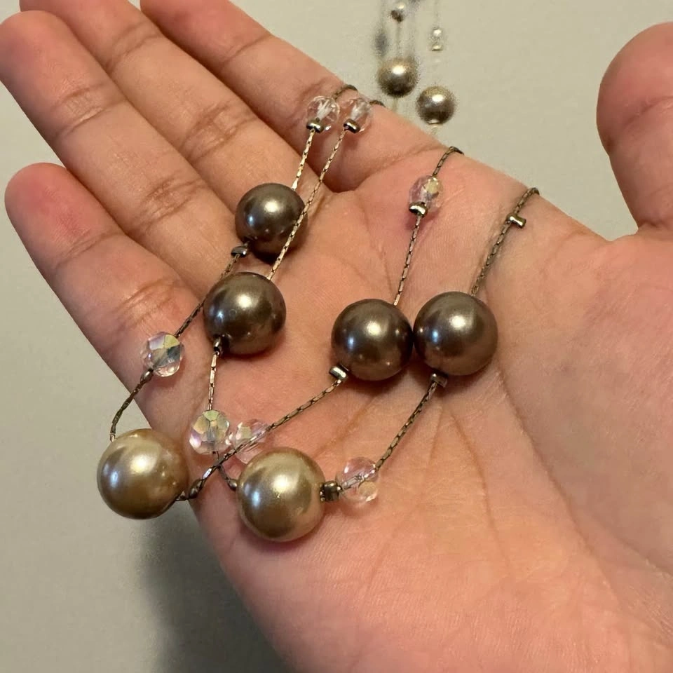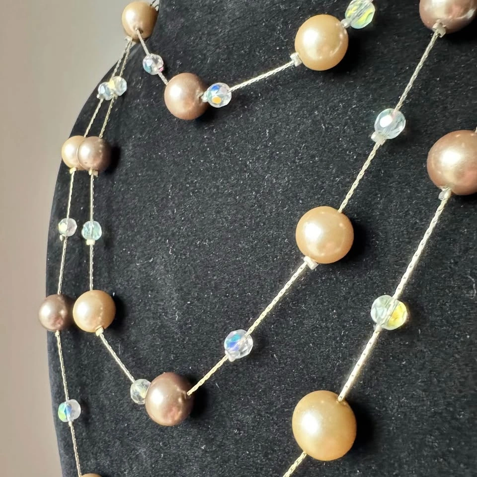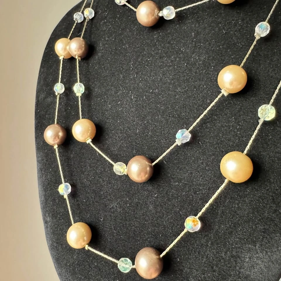 This exquisite Lia Sophia necklace showcases a sophisticated blend of gold, beige and brown hues. Long station necklace with clasp that can be worn long or doubled or tripled around the neck. Looks beautiful when worn layered. Lovely neutral tones that will elevate any outfit without overwhelming your ensemble—simple yet classy! The necklace is adorned with spherical glass pearls and contrasting smaller faceted iridescent spacer beads, creating a harmonious and elegant design.