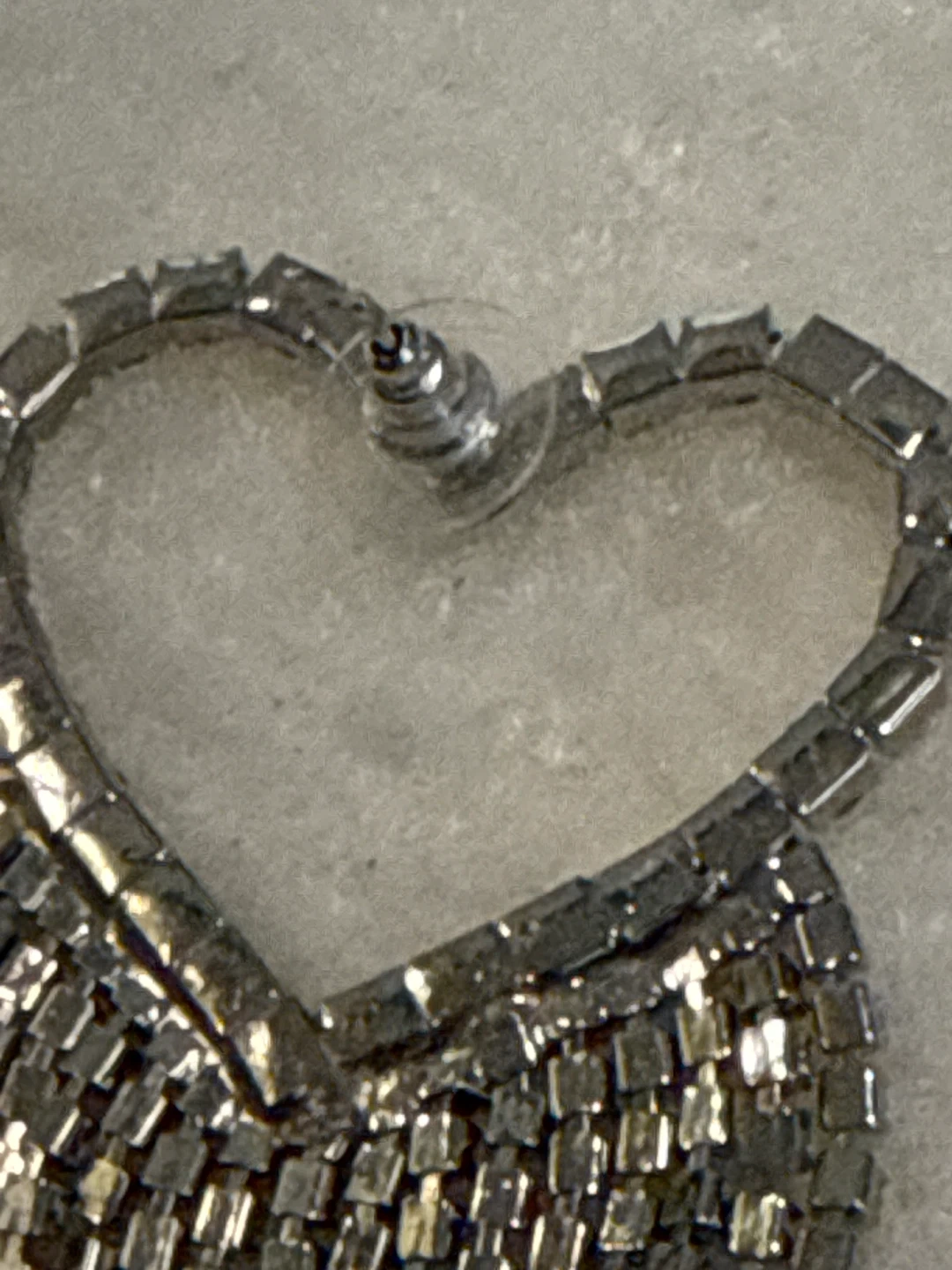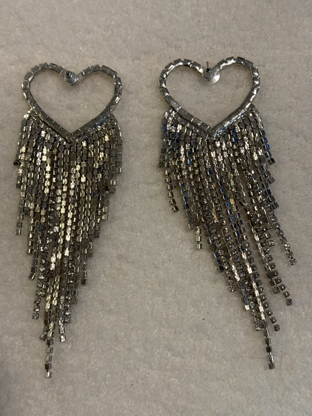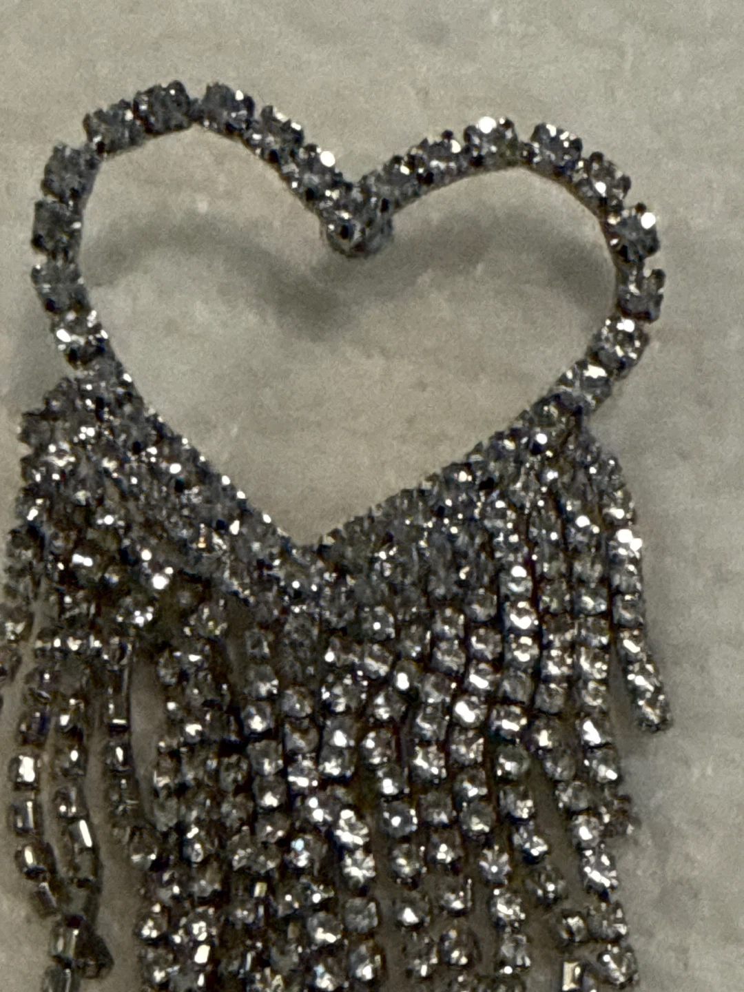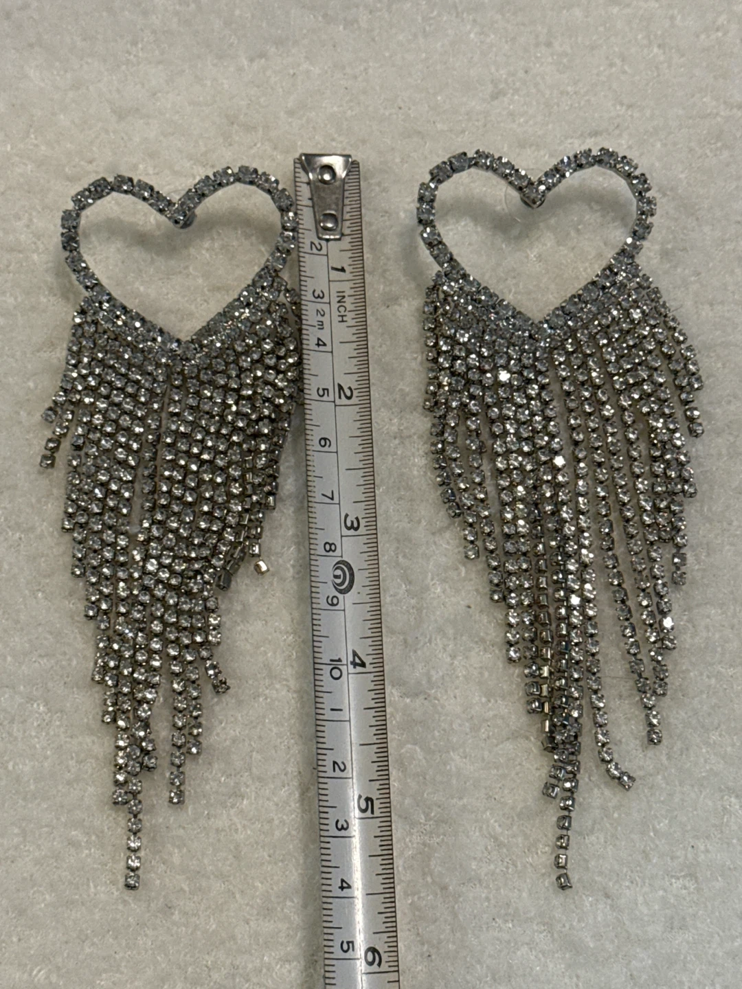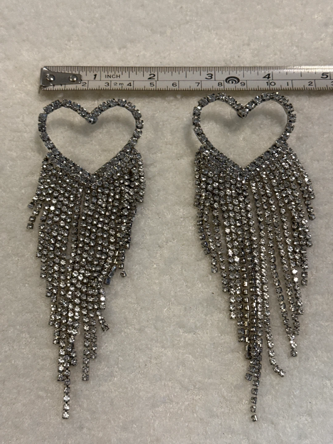 These are a pair of heart-shaped dangle earrings. They feature a heart outline with rhinestone detailing and a long, dangling rhinestone fringe. They measure approximately 5 inches in length.