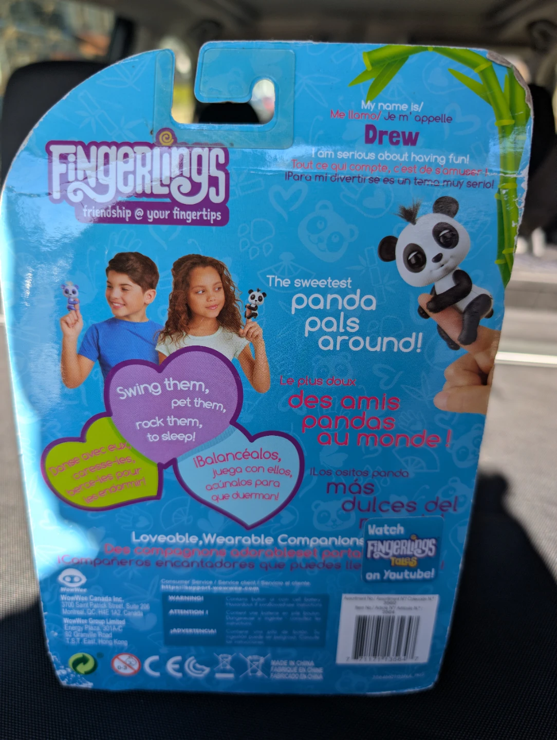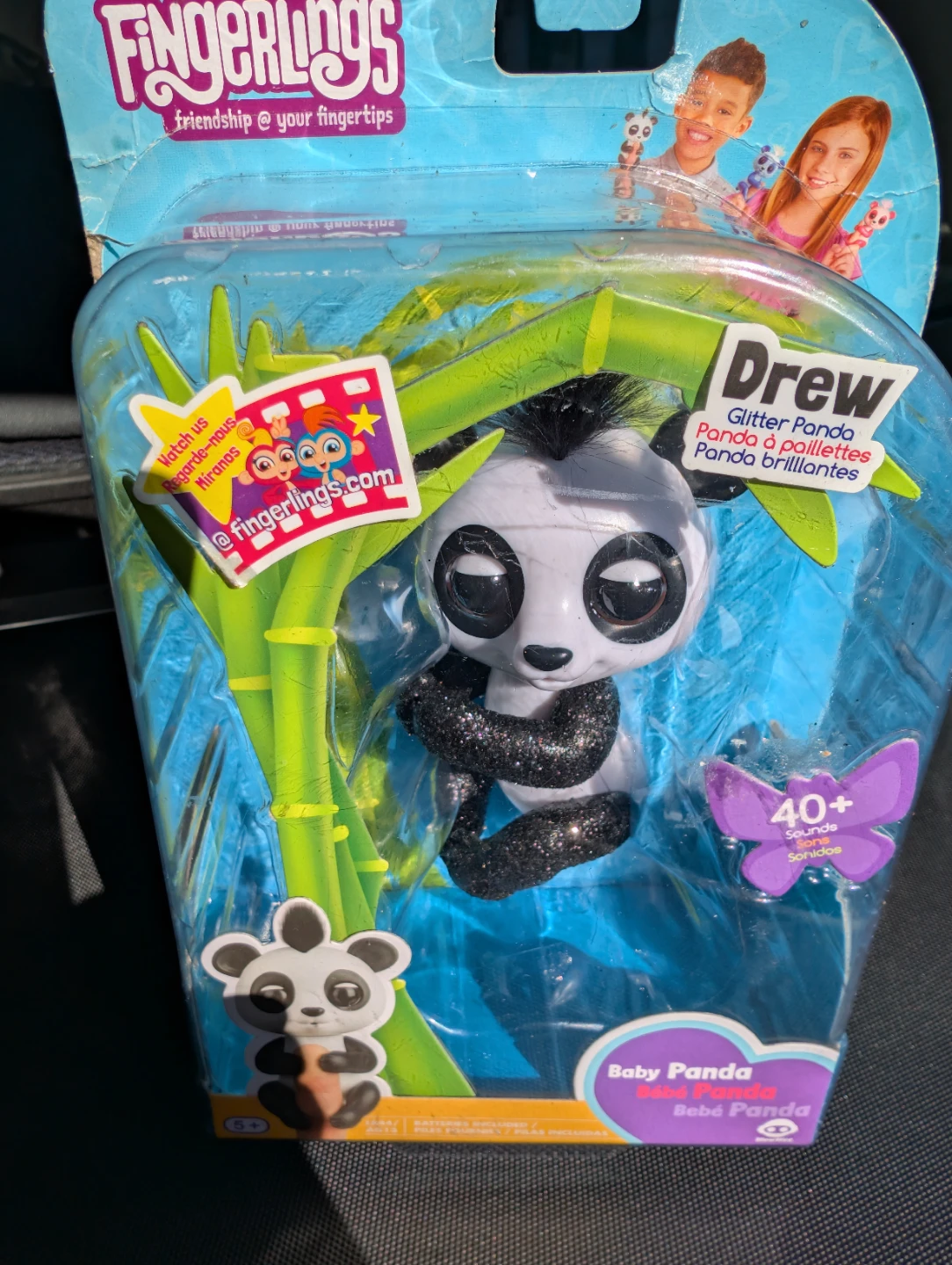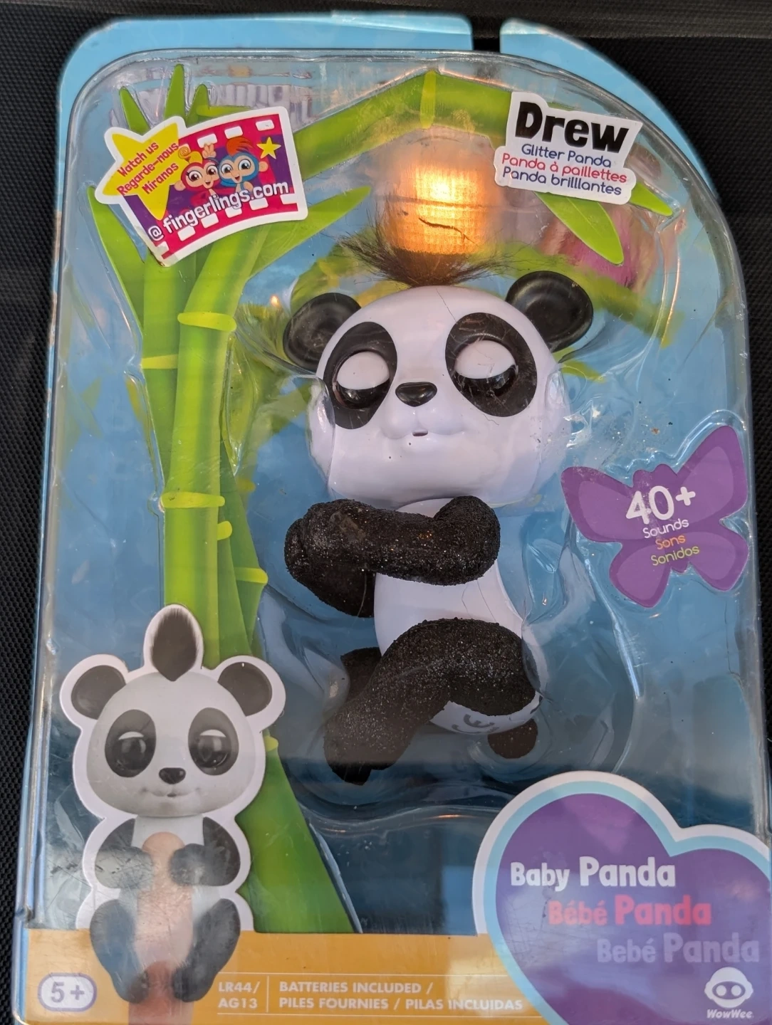 Selling a brand new Fingerlings Drew Glitter Panda! This adorable baby panda is ready to swing, pet, and rock to sleep. It's a loveable and wearable companion that makes over 40 sounds! Batteries are included, so it's ready to play right out of the box