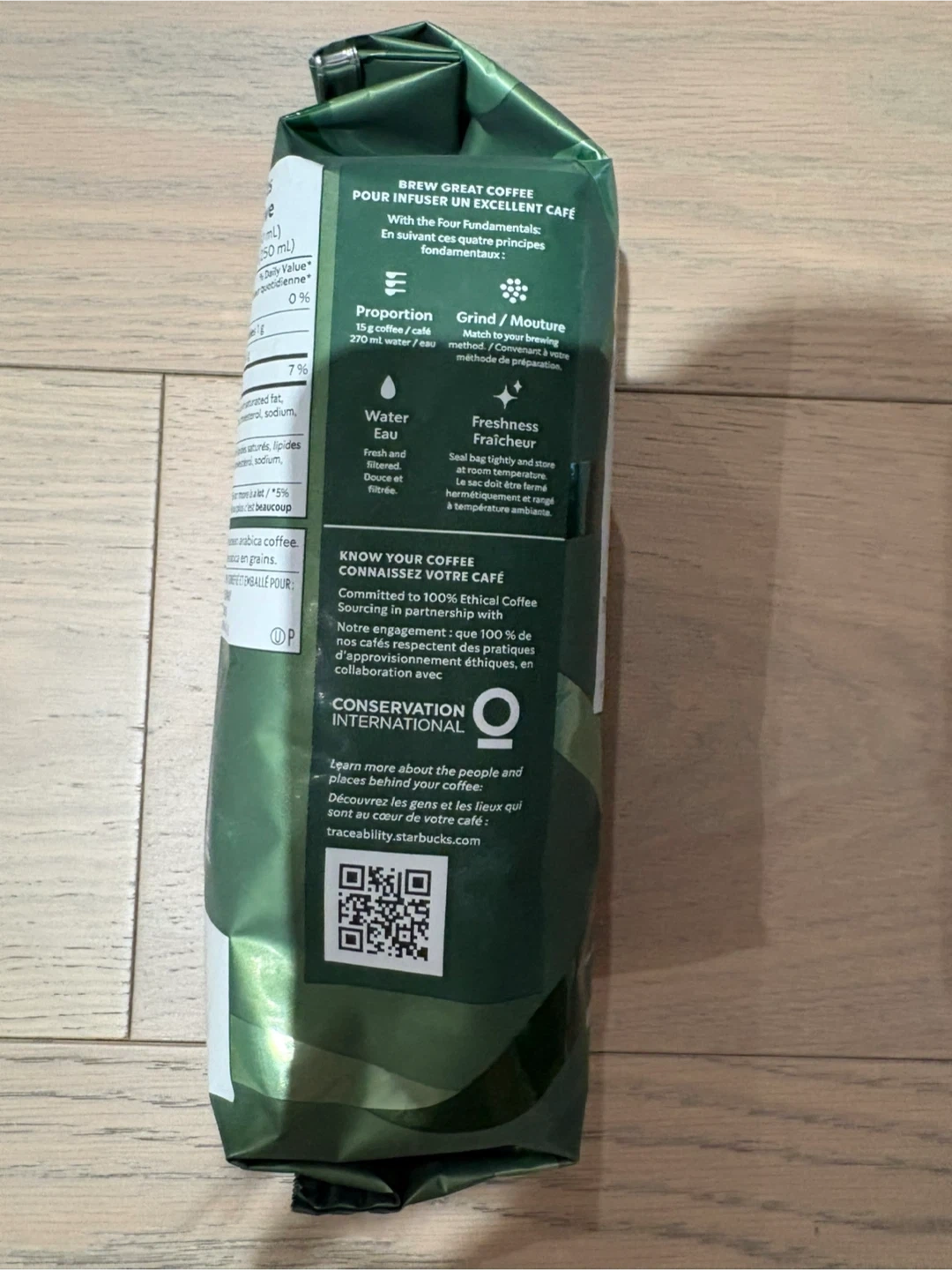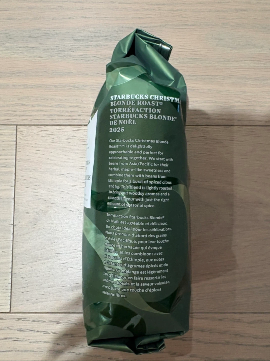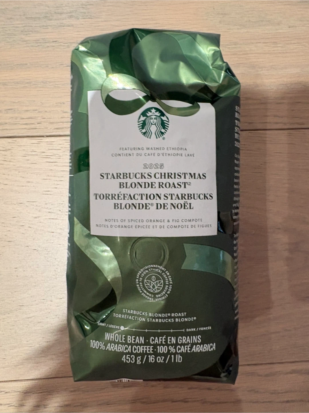 Selling a bag of Starbucks Christmas Blonde Roast coffee. It's a whole bean coffee in a 453g (16 oz / 1 lb) bag.