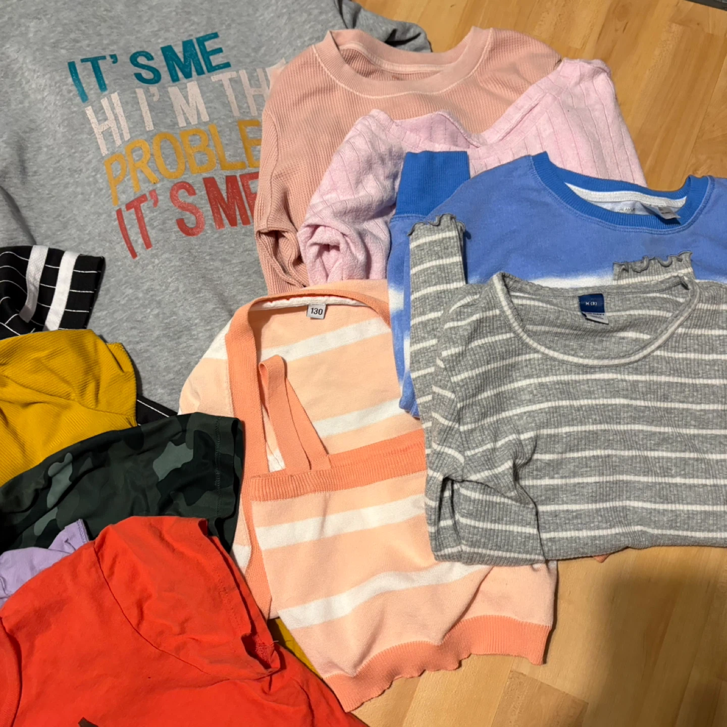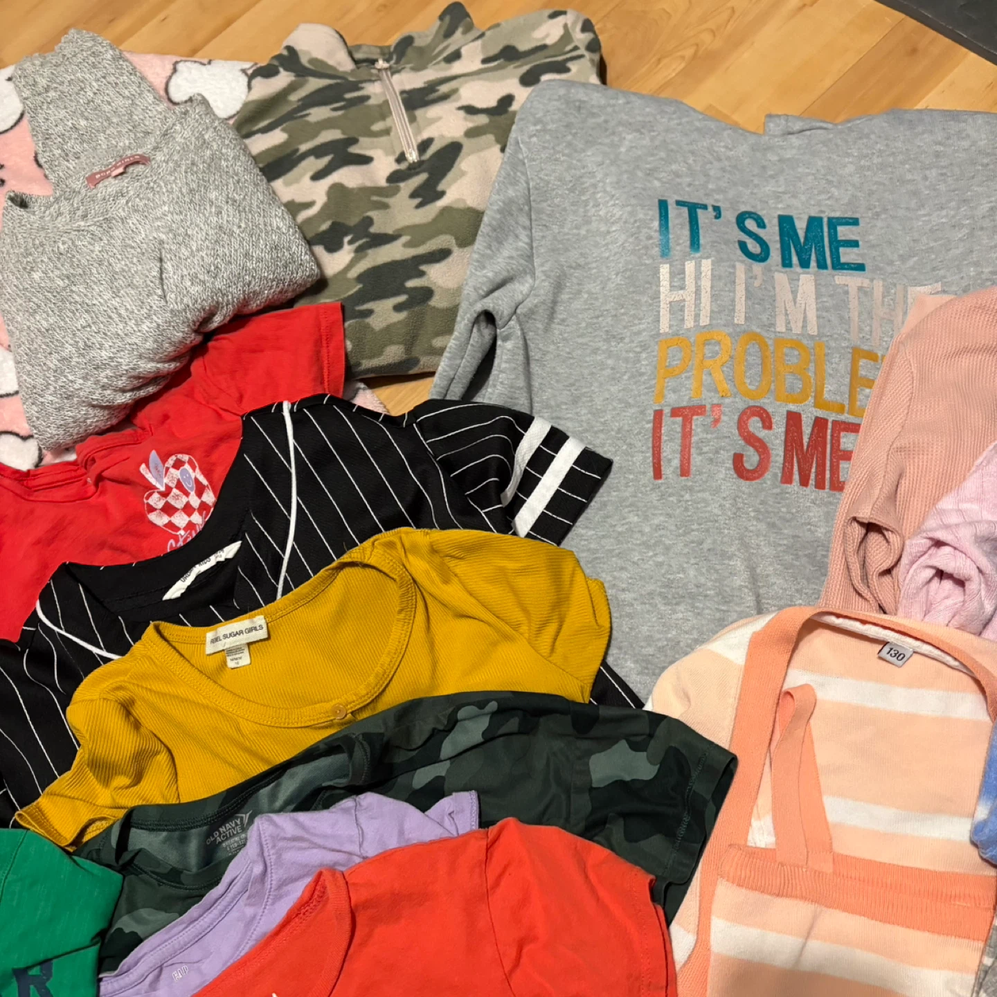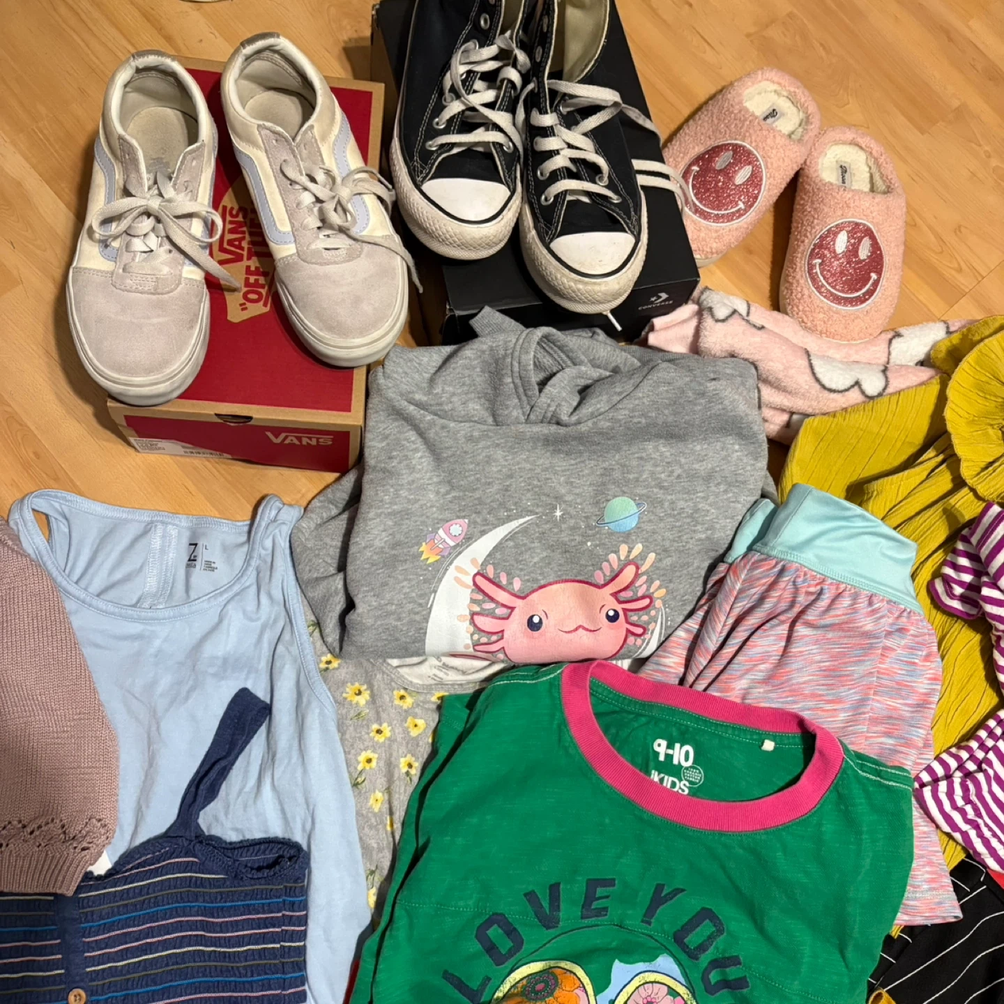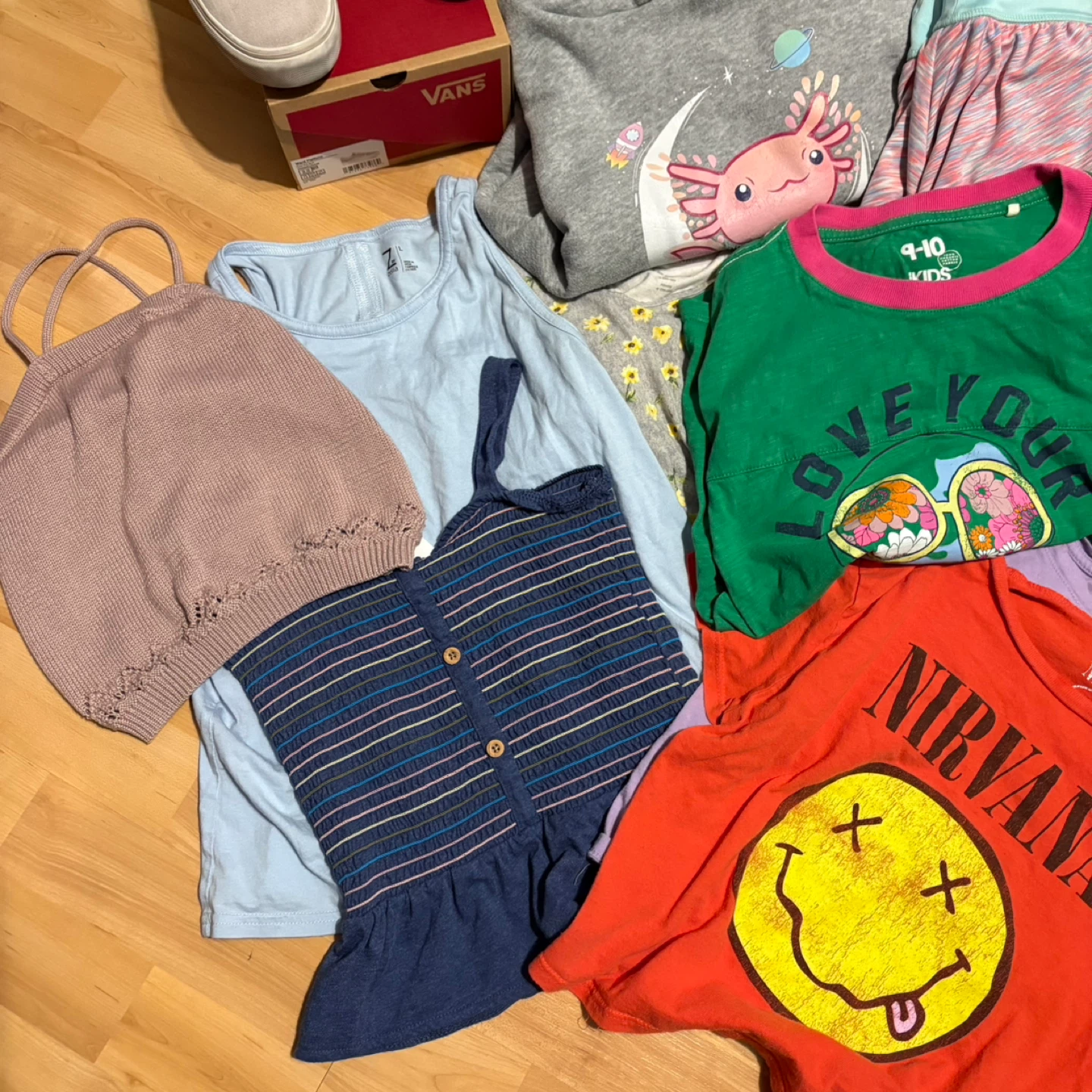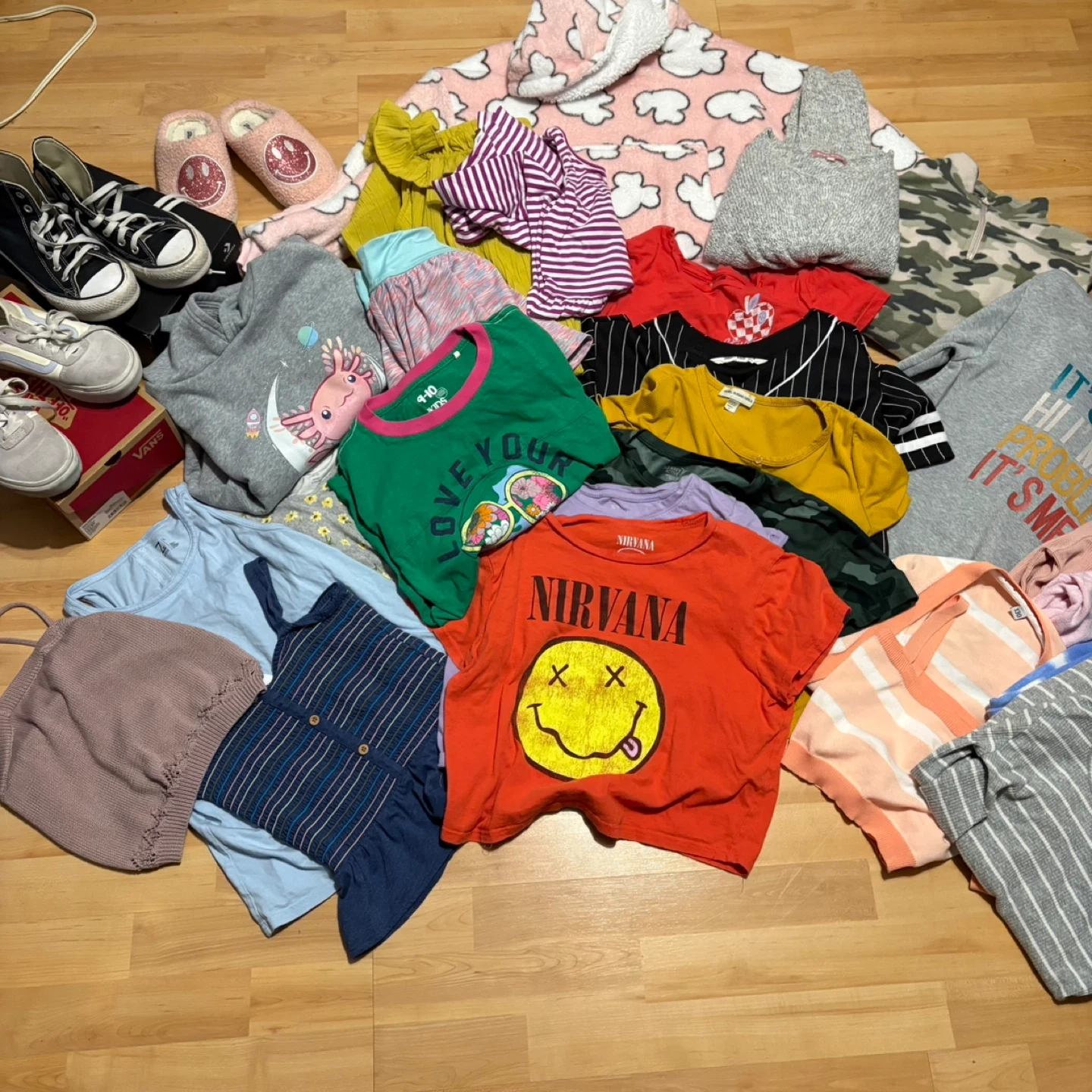I'm offering a huge 29 item mixed bundle of kids' clothing! There's a variety of brands and sizes included, perfect for stocking up their wardrobe. You'll find tops, bottoms, and more in this lot. All items are in good, used condition and ready for a new home! Fit approx 8-10 yrs, a couple bigger. Shoes are converse size 1, vans size 2. Must take all. Pick up only.