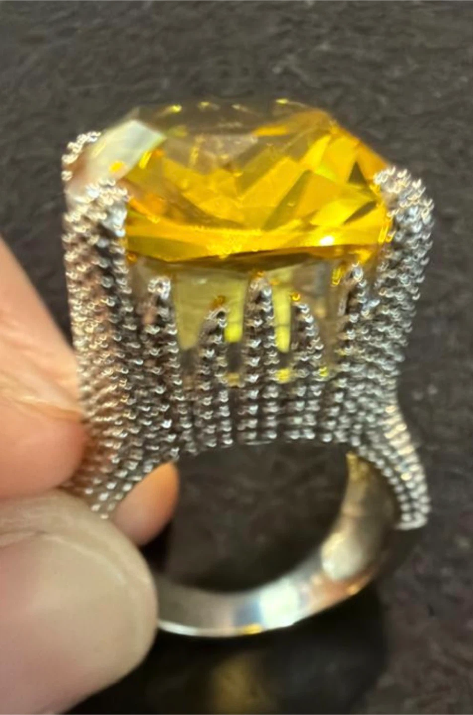 A beautiful ring featuring a large yellow gemstone. It has a unique and eye-catching design, perfect for adding a touch of elegance to any outfit