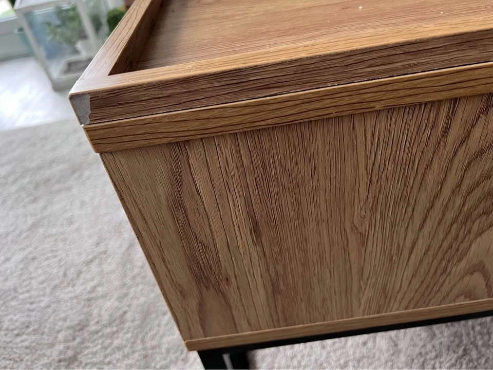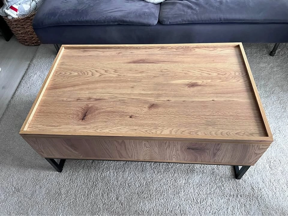 Beautiful modern coffee table with a lift-top design and hidden storage. The top lifts smoothly to create a convenient surface for working, eating, or gaming, while revealing a spacious storage compartment underneath.