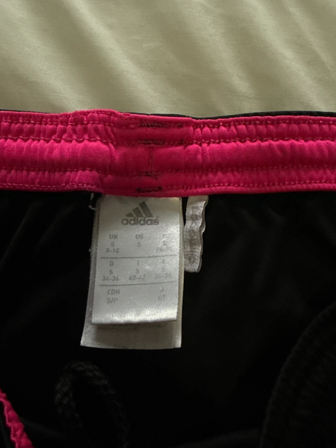 Selling a pair of Adidas athletic shorts. They're black with pink trim and the classic three stripes down the sides. The size is S.
