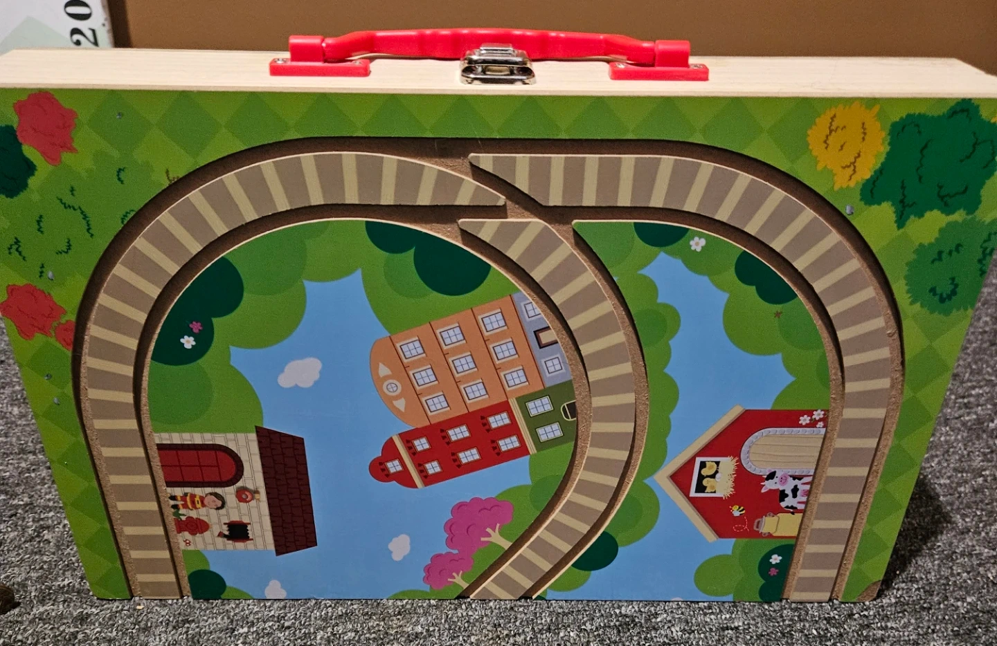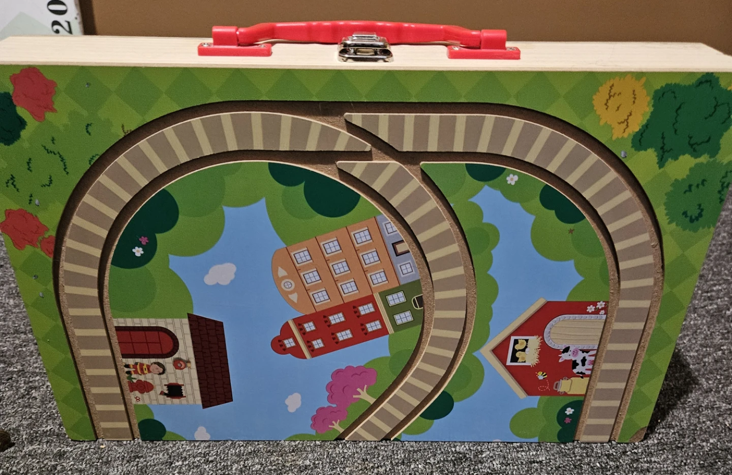This is a cute wooden train set that comes in its own carry case! It's perfect for little conductors and imaginative play. The case itself is decorated with a charming town scene, and the set includes several colourful train cars and track piece. Includes 17 pieces.