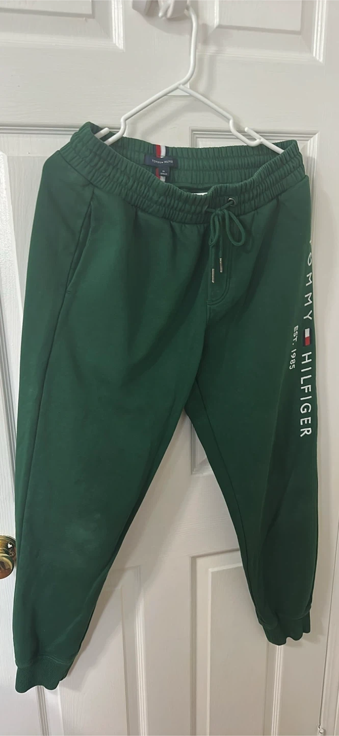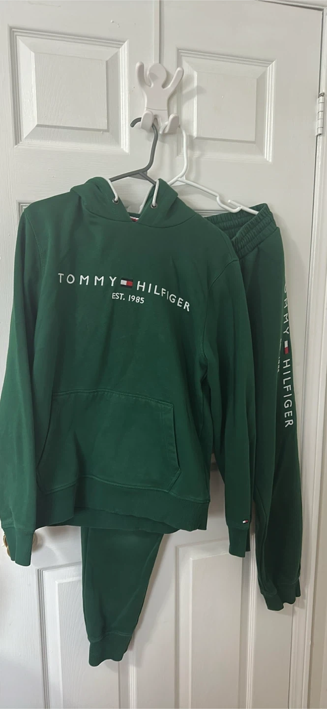 Selling a Tommy Hilfiger jogger set in green! The set includes a hoodie and matching joggers. It's in great condition and perfect for lounging or casual wear! The joggers have the Tommy Hilfiger logo down the leg.