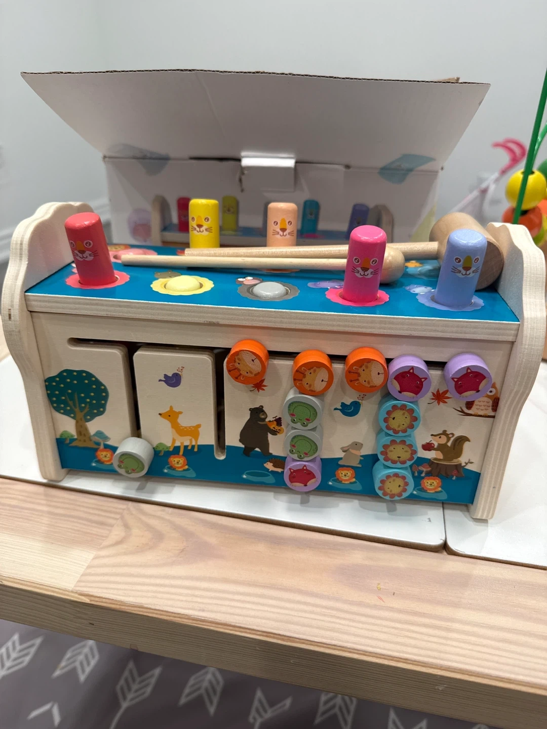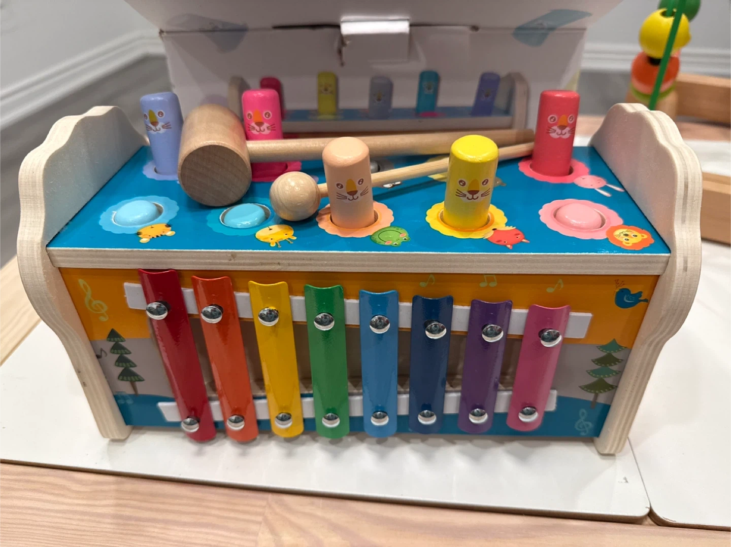 Selling a 4 in 1 wooden hammer toy that also includes a xylophone! It's in great condition and ready for a new home. The box is included!
