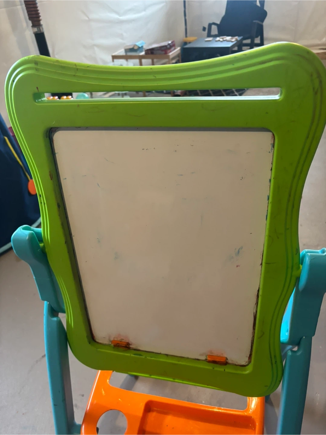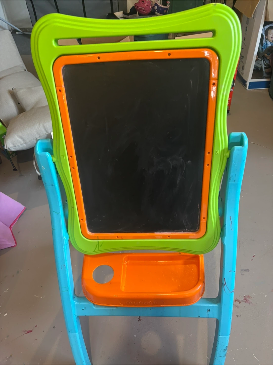 This Little Tikes double easel is perfect for your little artist! It features both a chalkboard and a whiteboard, so your child can explore different mediums. The easel is in good condition and ready for a new home filled with creativity and fun. It has some markers markings on the side but is fine otherwise.