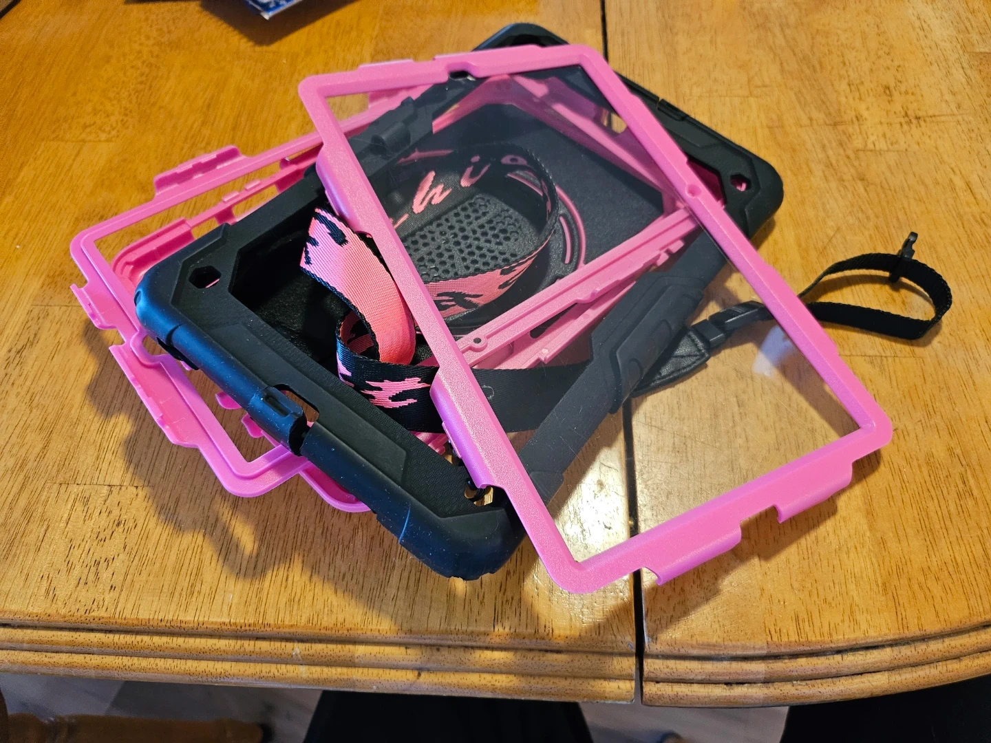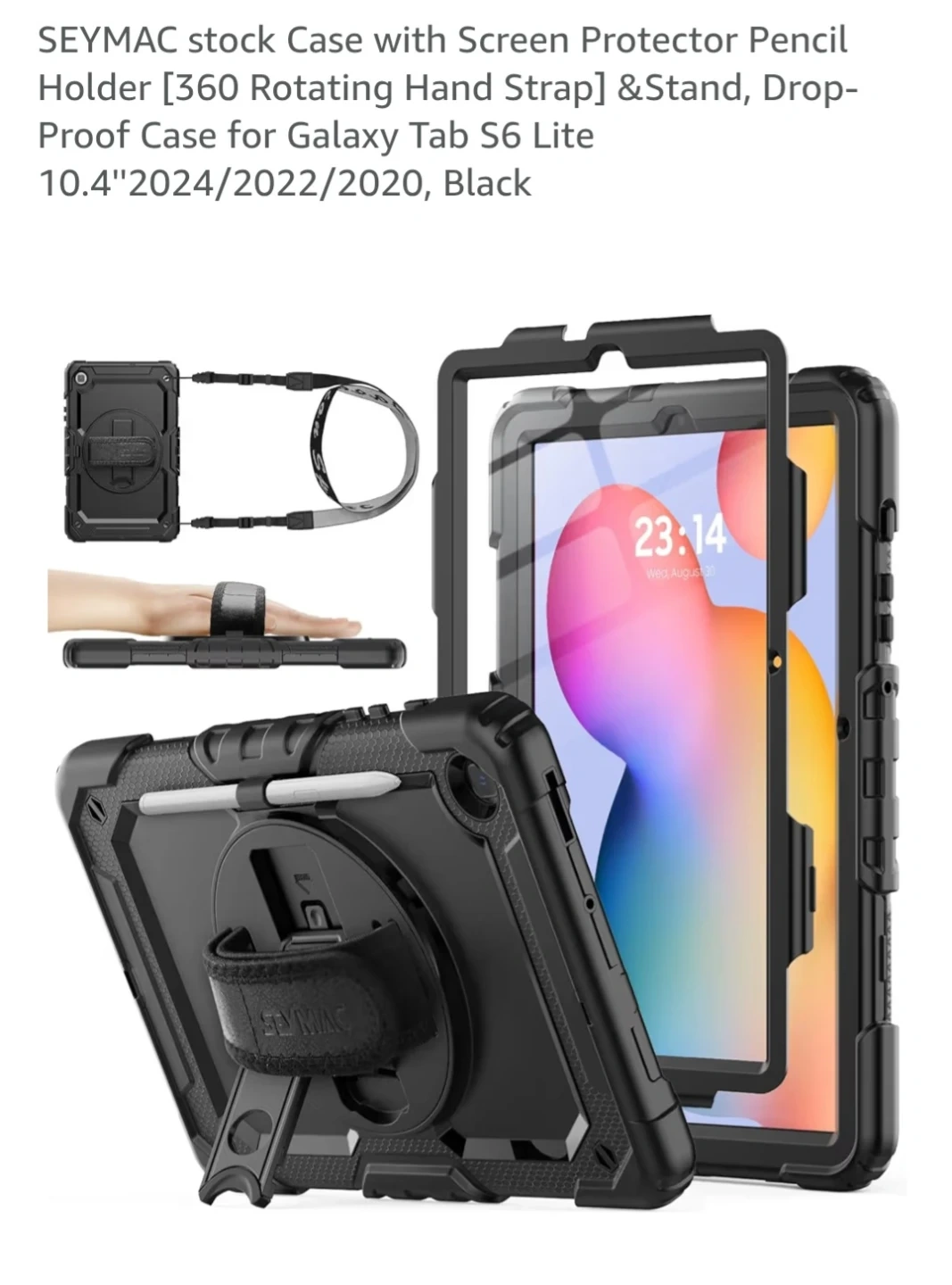 Fully enclosed case with screen protector, pencil holder, and a 360 rotating hand strap and stand. Designed for the 10.4" version of the Galaxy Tab S6 Lite (2024/2022/2020). Does not come with pencil. Check page for compatible tablet availability. Was wiped down quickly.