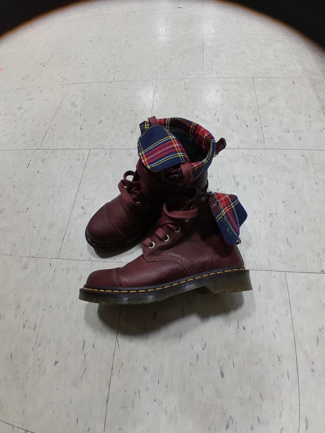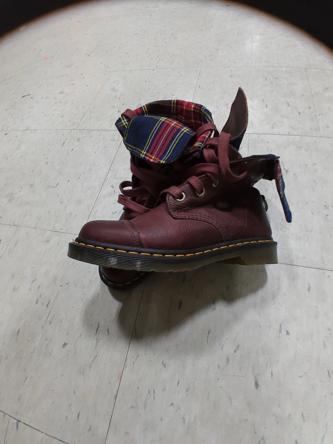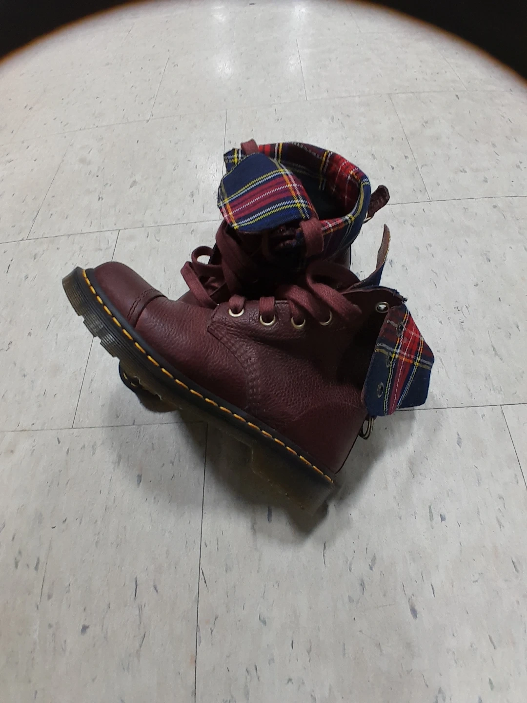Dr. Martens boots in a lovely burgundy colour. They feature a unique plaid lining. Great for adding a bit of edge to your look! Original leather they are 💯 authentic excellent condition used like new women's size 9