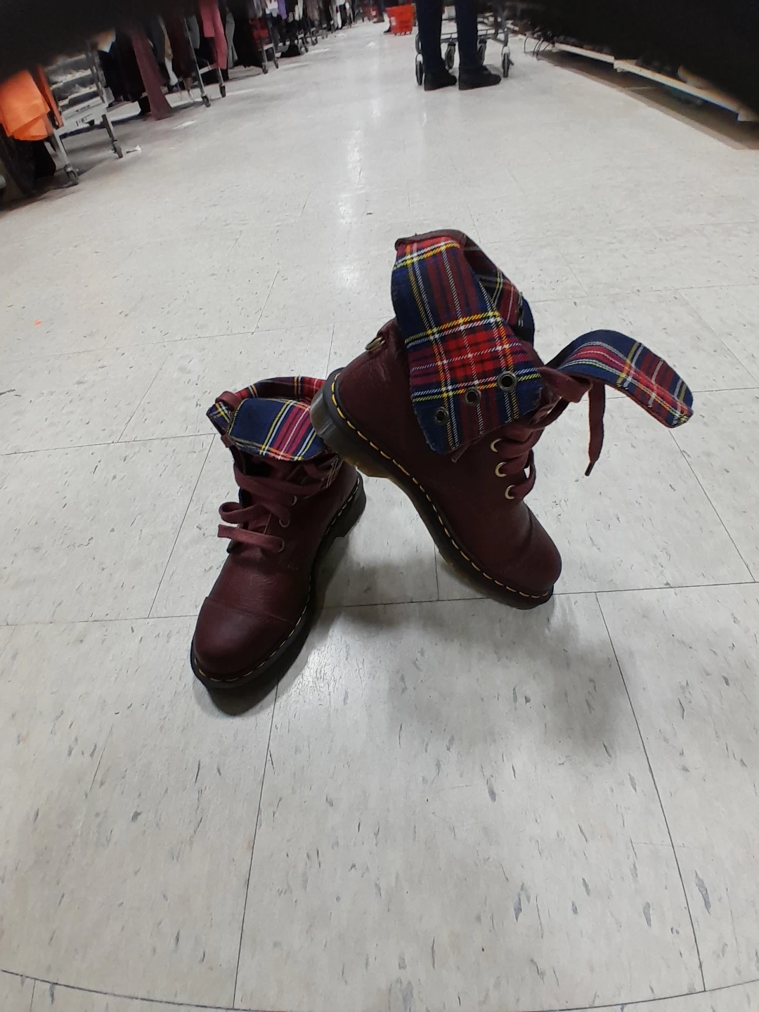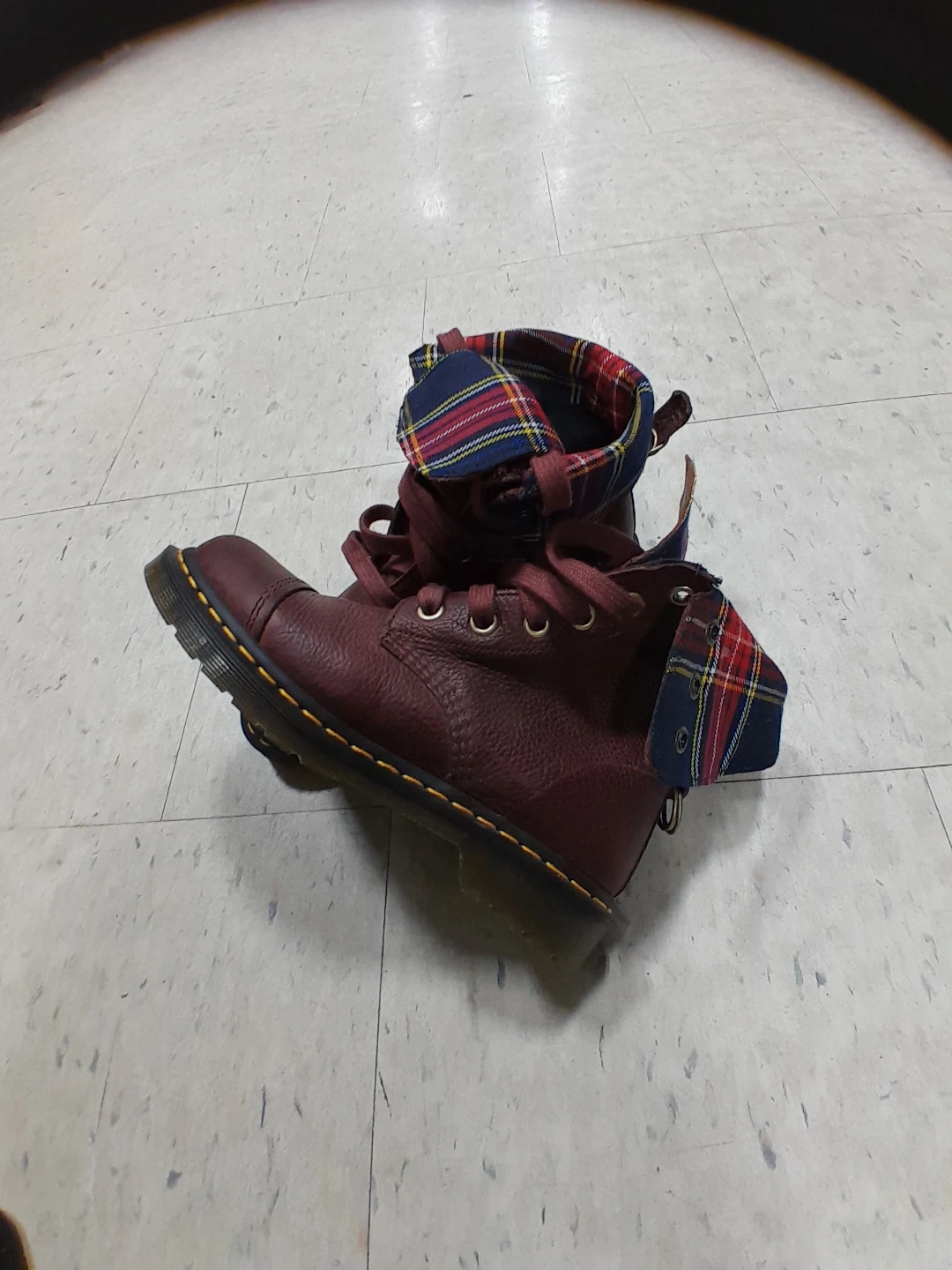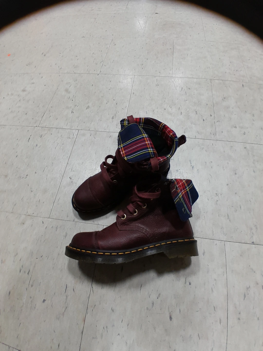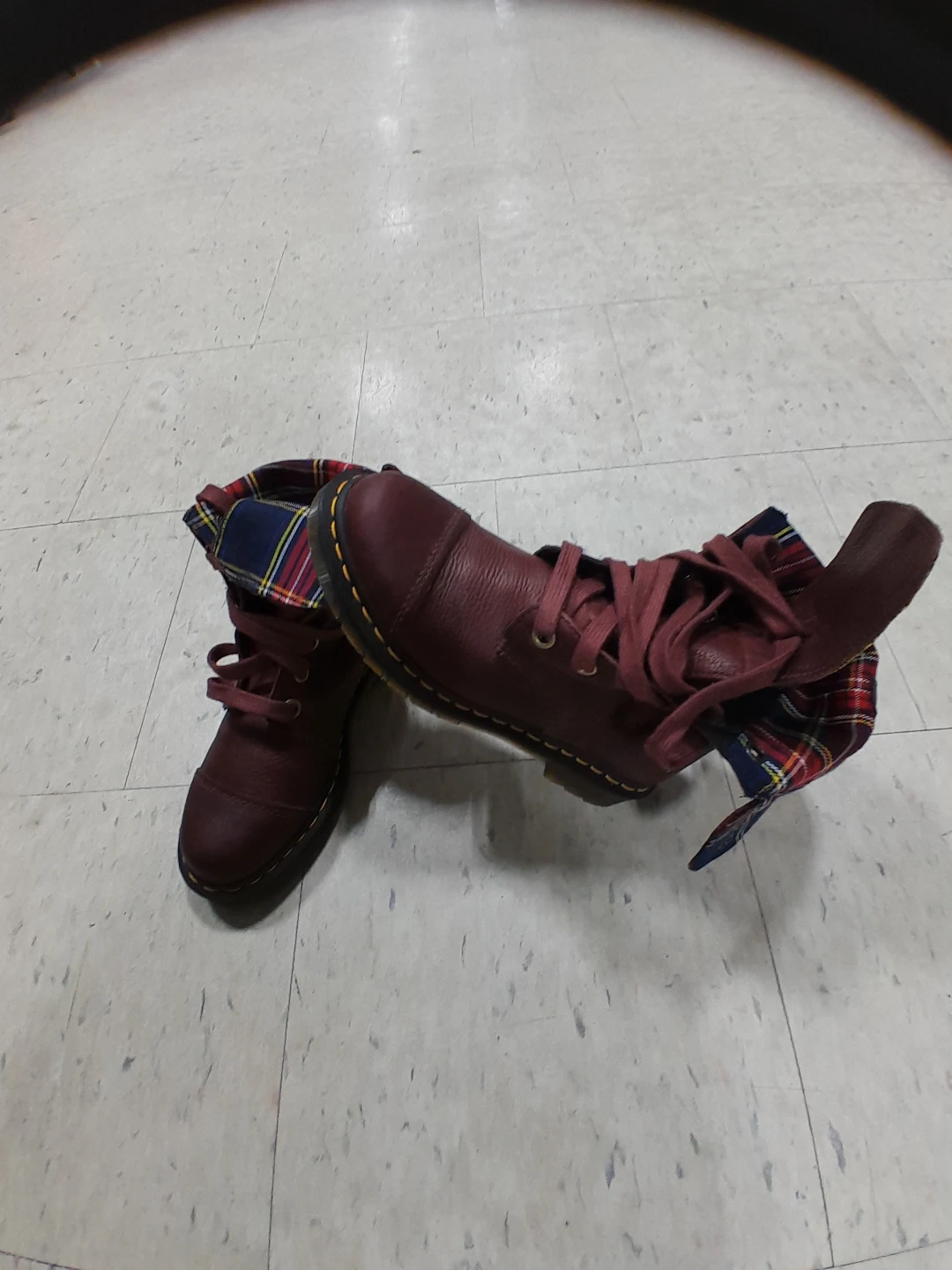 Dr. Martens boots in a lovely burgundy colour. They feature a unique plaid lining. Great for adding a bit of edge to your look! Original leather they are 💯 authentic excellent condition used like new women's size 9