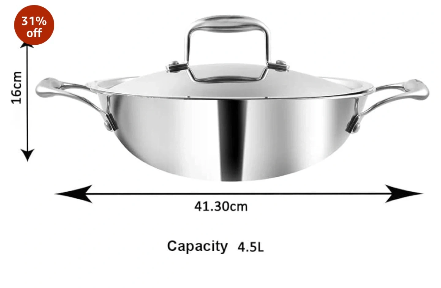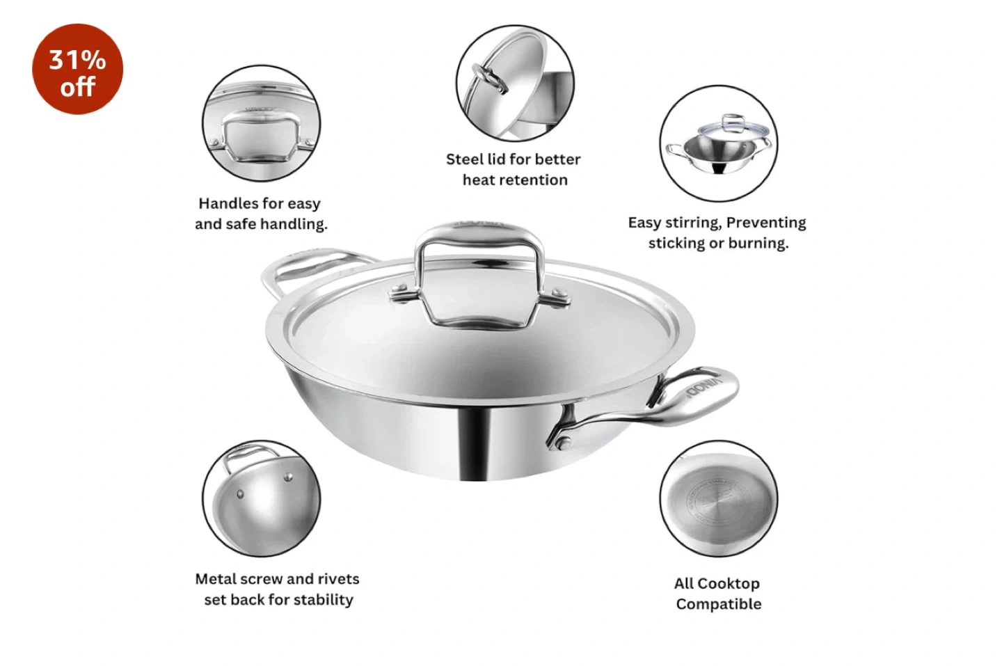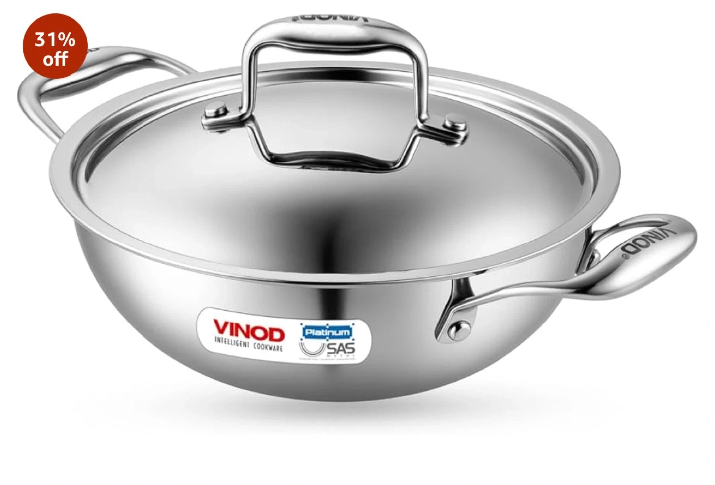 This Vinod Platinum Triply wok is perfect for easy stirring, preventing sticking or burning! The steel lid helps with better heat retention. It has handles for easy and safe handling.