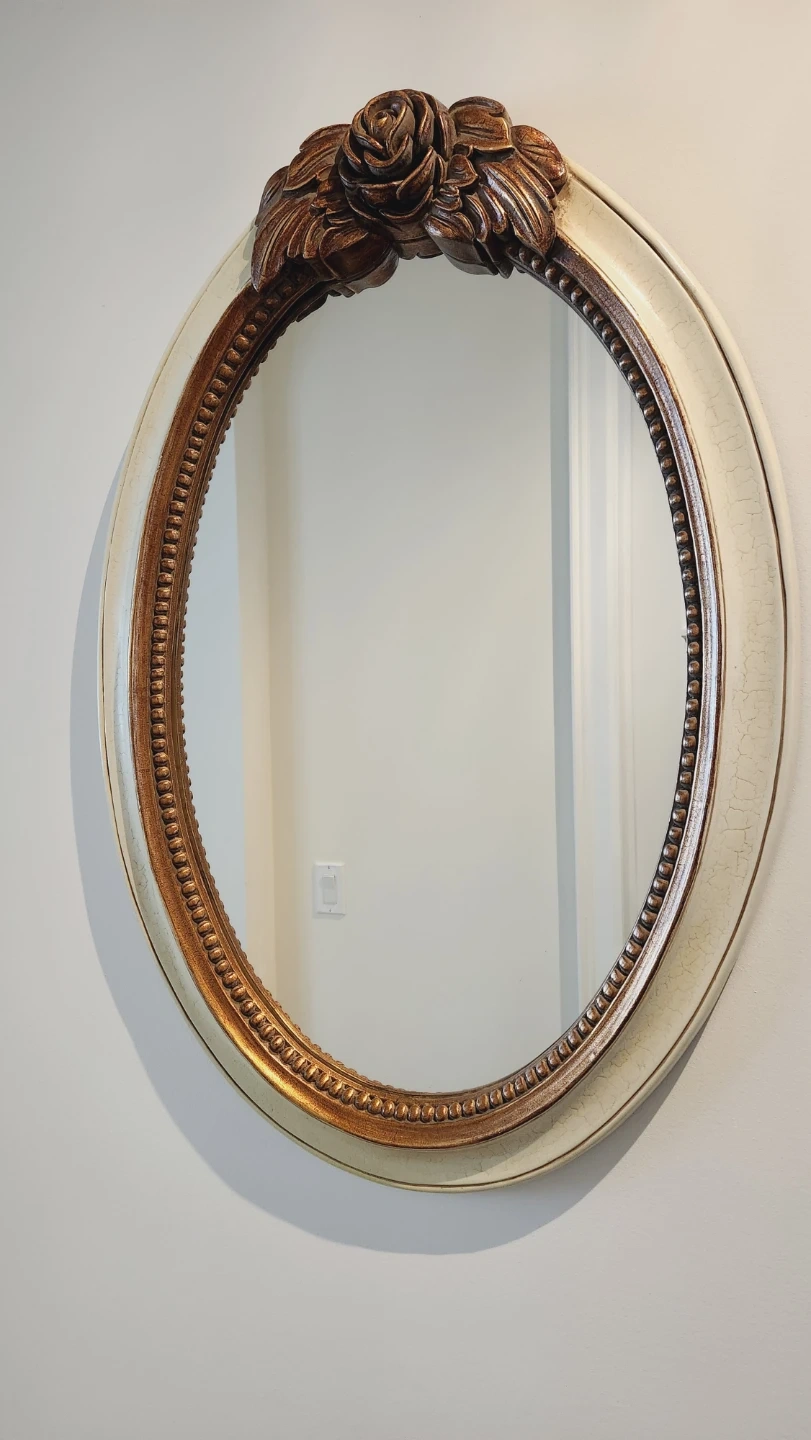 Here's a lovely oval wall mirror with a decorative frame! It features a rose detail at the top and an antique white and gold finish. It's in great condition and ready to add a touch of elegance to your home