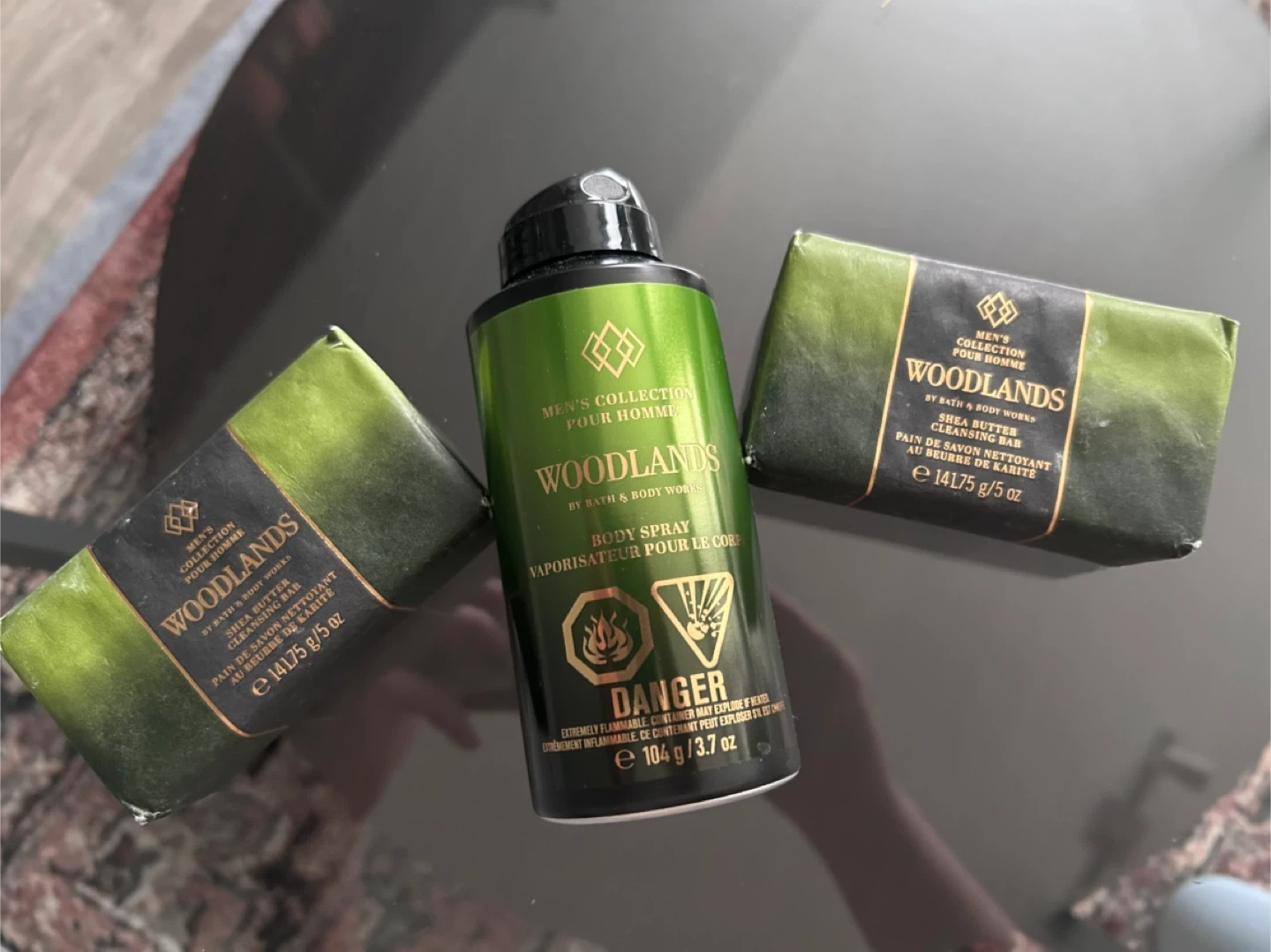 Selling a Bath & Body Works Woodlands set, perfect for the man in your life! The set includes a body spray and two shea butter cleansing bars. The scent profile features woody, aromatic, citrus, herbal, and soft spicy notes, making it ideal for both day and night wear. Enjoy the cedar, sage, and citrus hints in this fragrance.