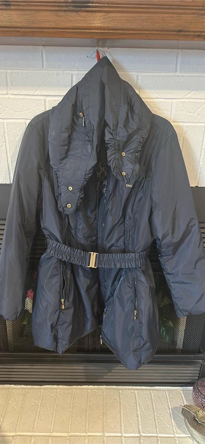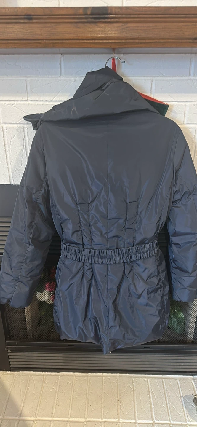 Dark blue down-filled puffer jacket! It's in great condition and perfect for staying warm during the colder months. Features a flattering belted waist and unique collar design.