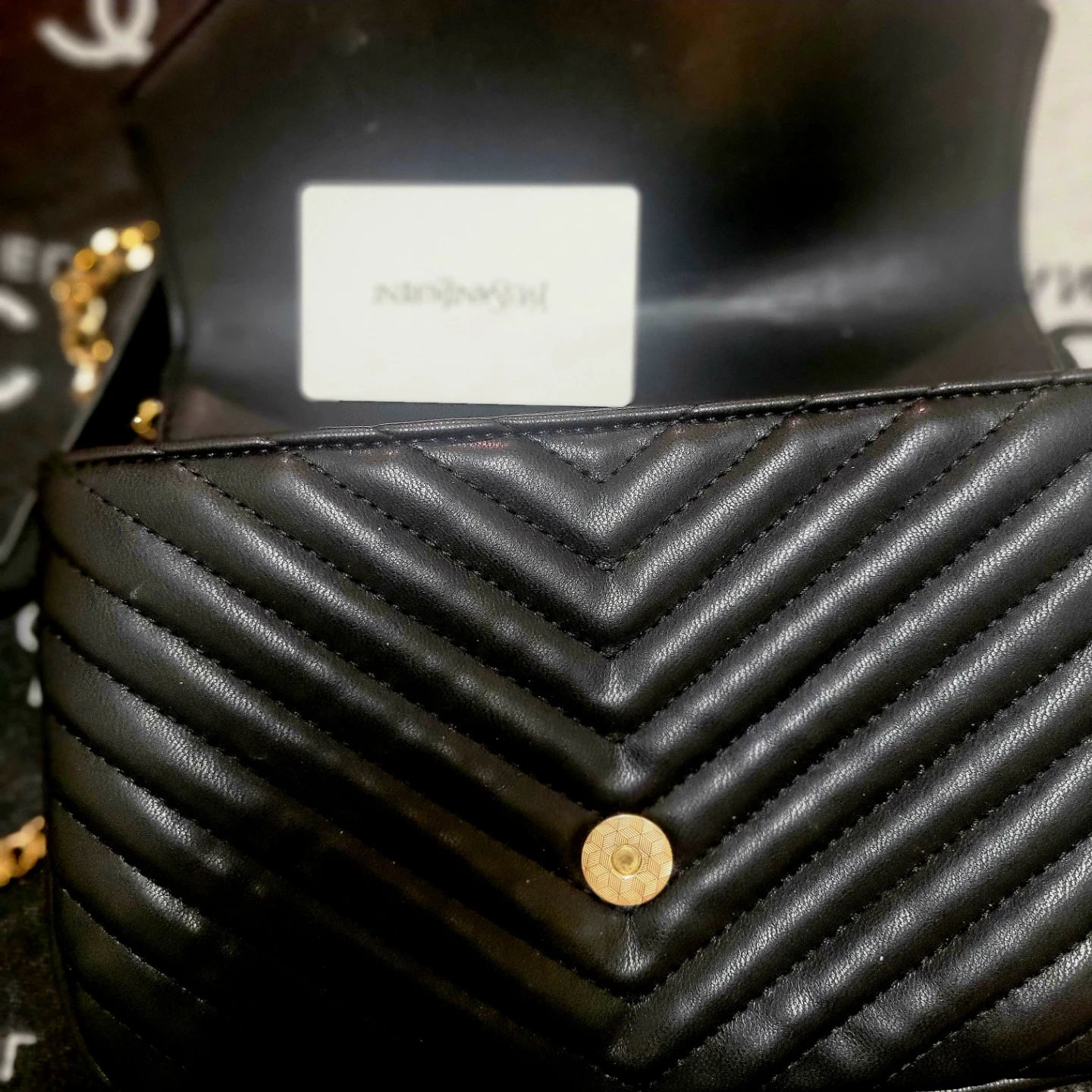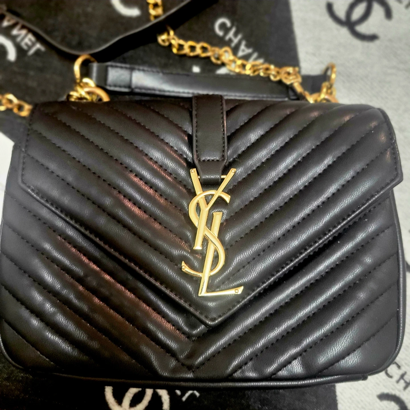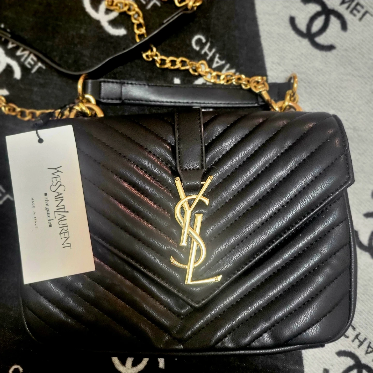 This is a crossbody bag in black leather. It features a gold chain strap and the iconic YSL logo. Perfect for adding a touch of luxury to any outfit