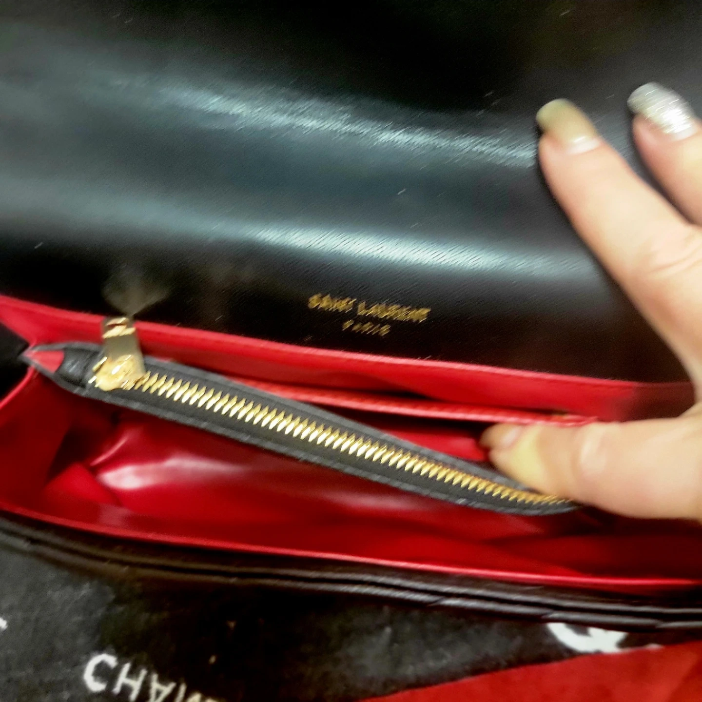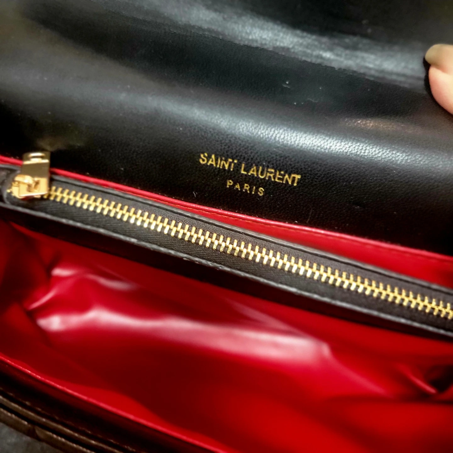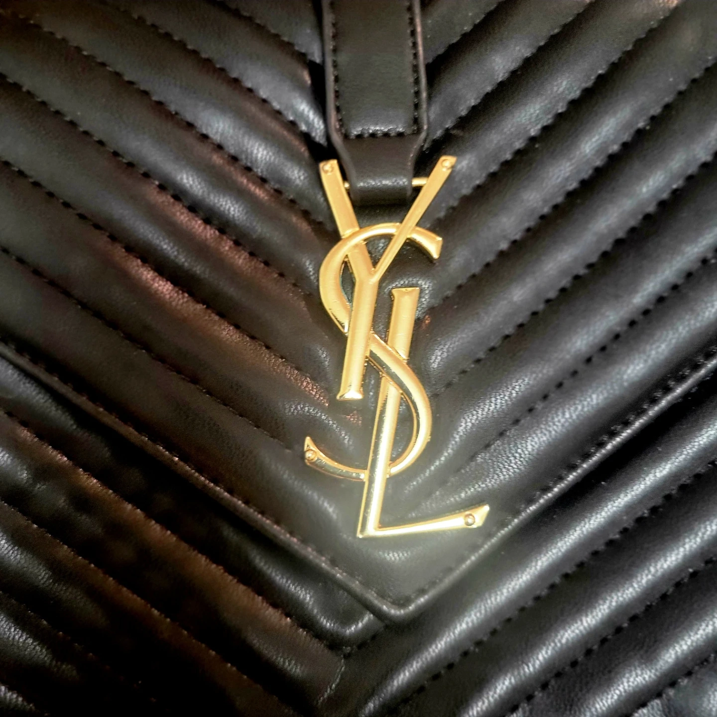 This is a crossbody bag in black leather. It features a gold chain strap and the iconic YSL logo. Perfect for adding a touch of luxury to any outfit