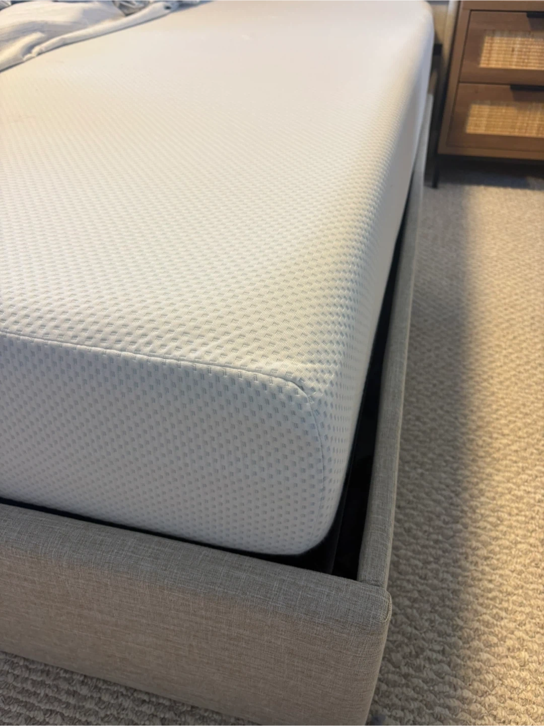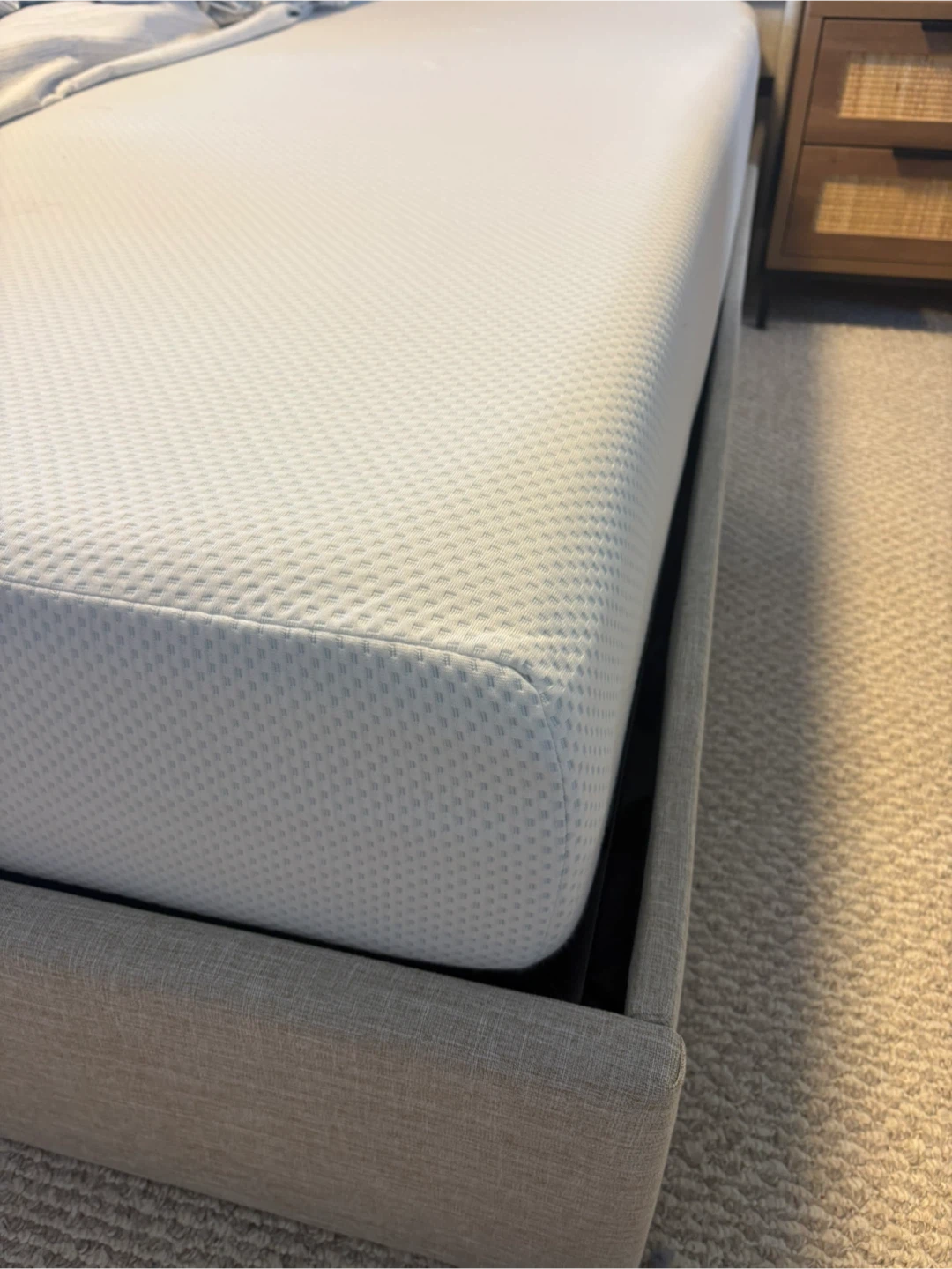 Mattress is memory 10” like brand new both bed and mattress used for six months and as good as new. Seeing is believing!