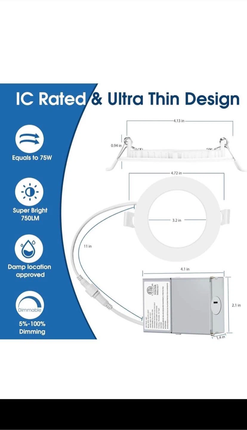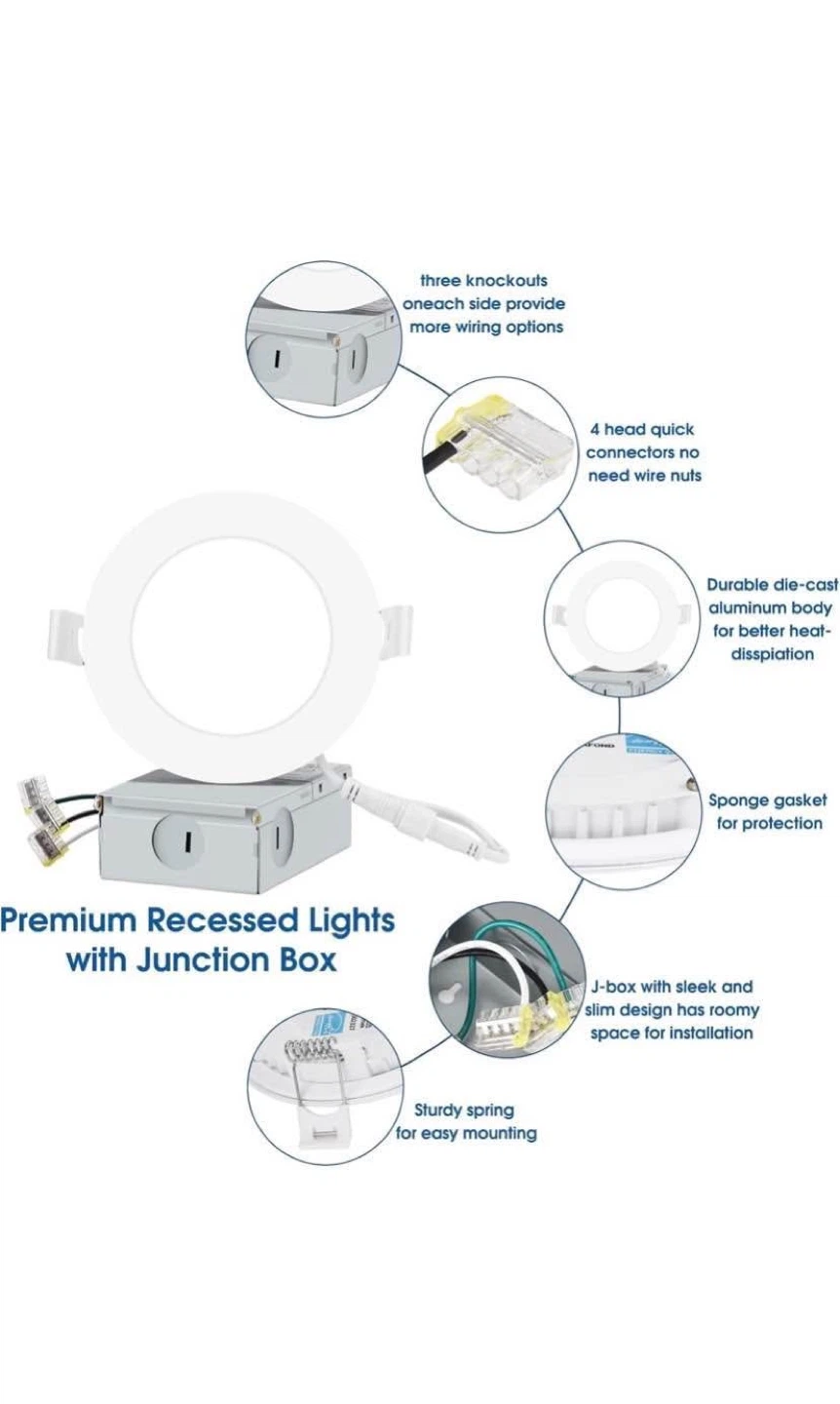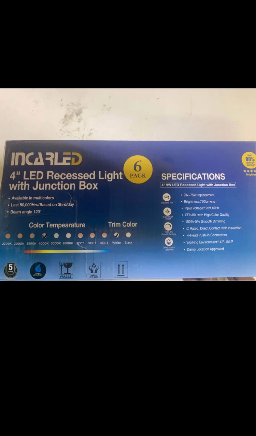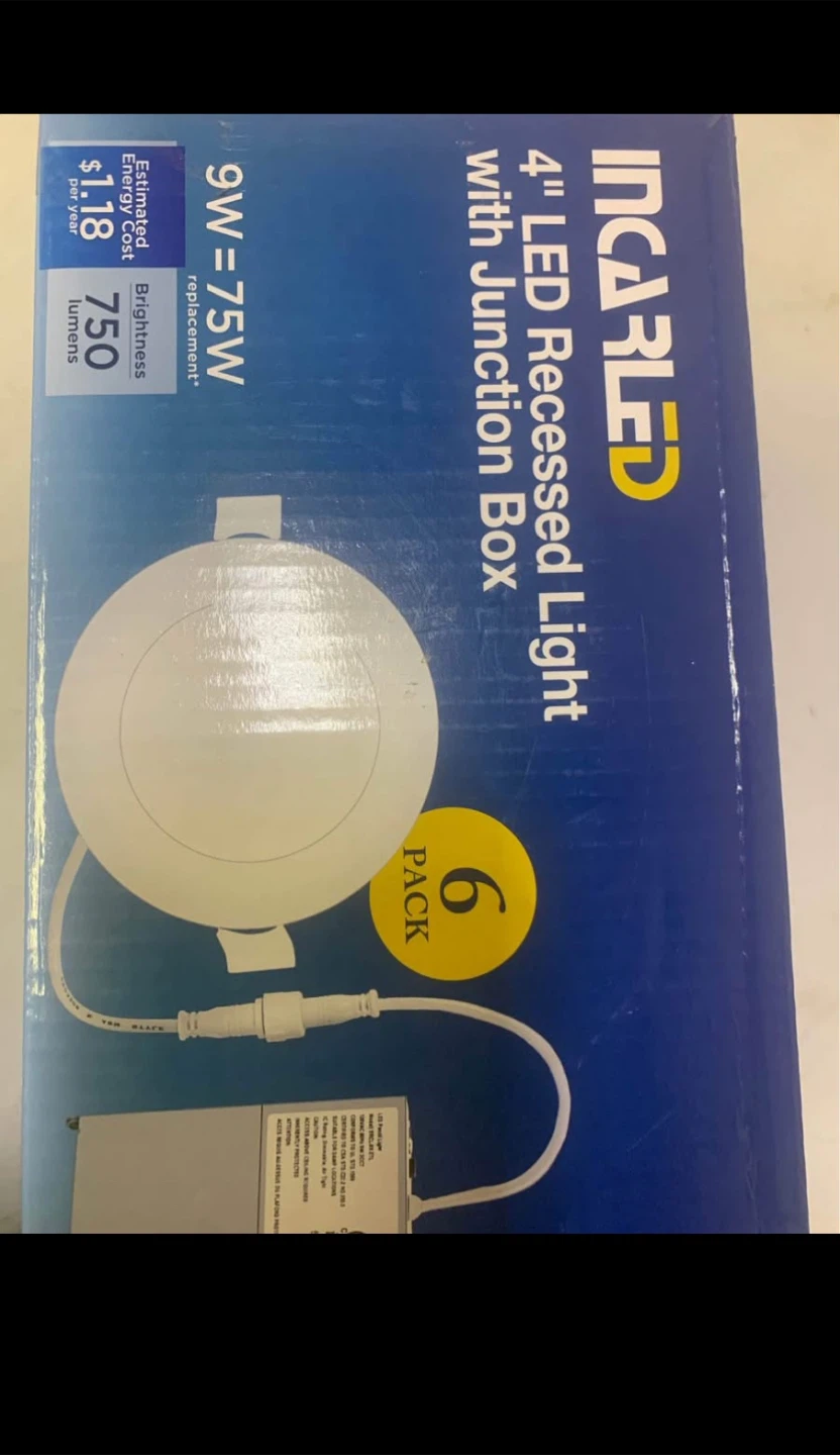 Selling a 6-pack of INCARLED 4" LED Recessed Lights with Junction Boxes! These lights are 9W=75W replacements and provide 750 lumens of brightness. They are available in multicolors and last approximately 50,000 hours based on 3 hours of use per day. They are damp location approved and have a CRI-80, with High Color Quality