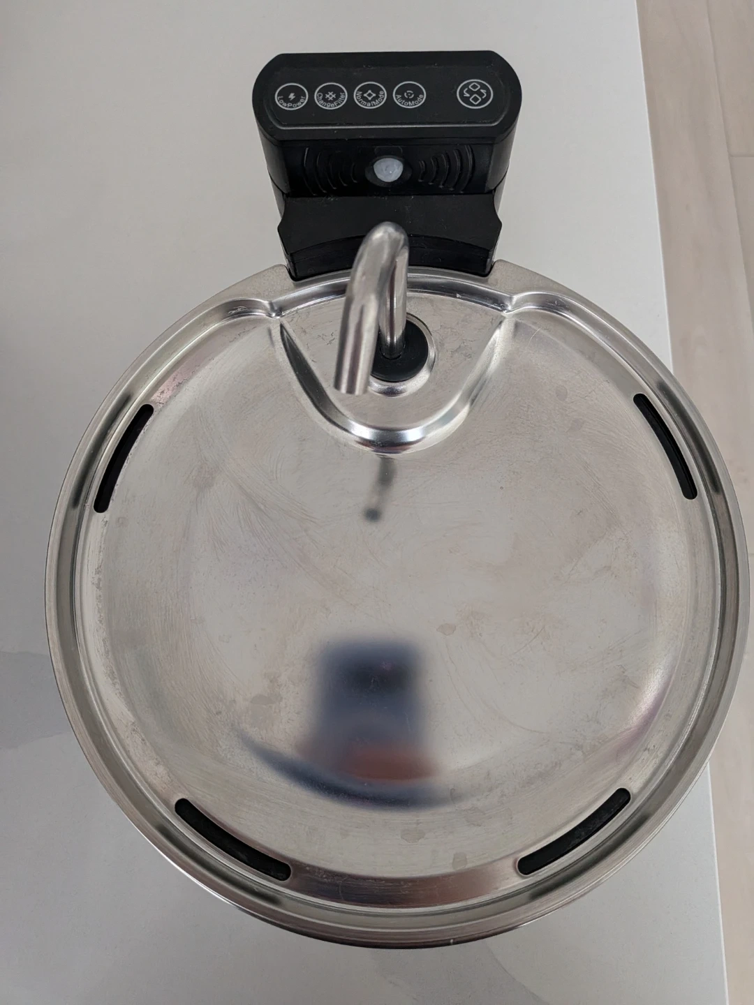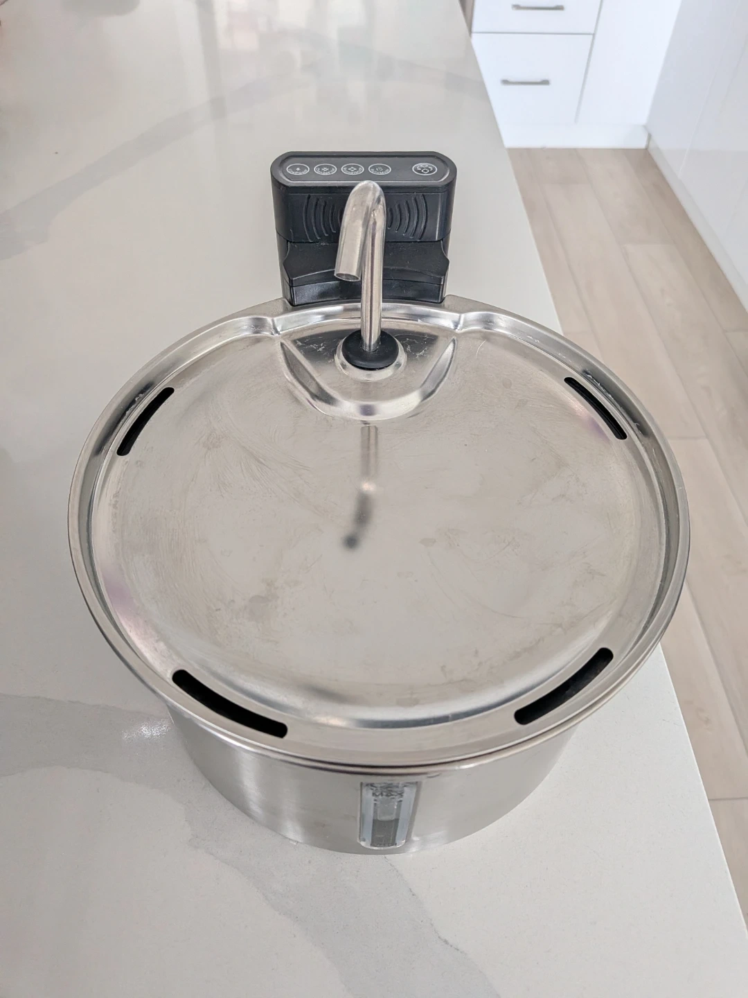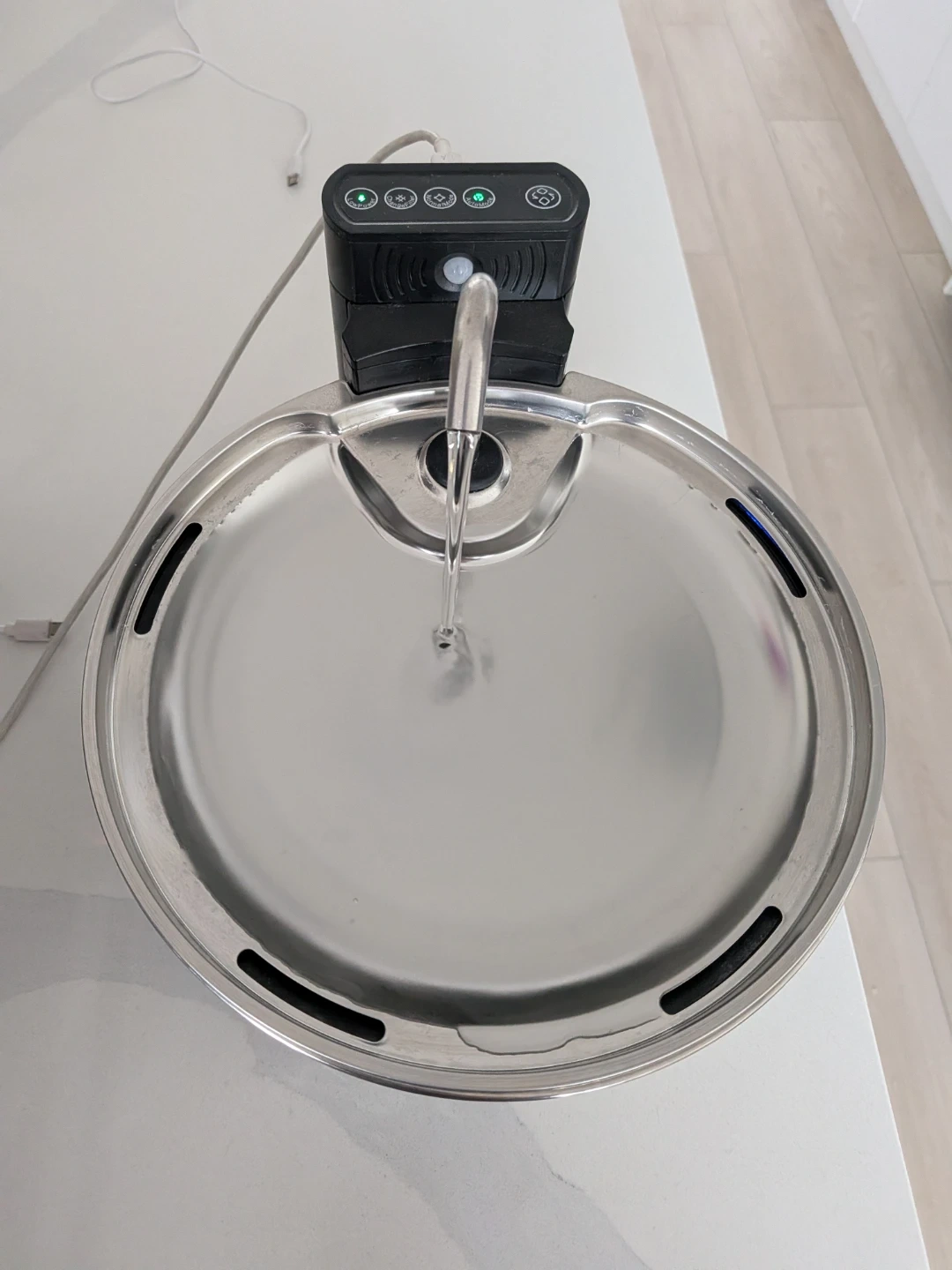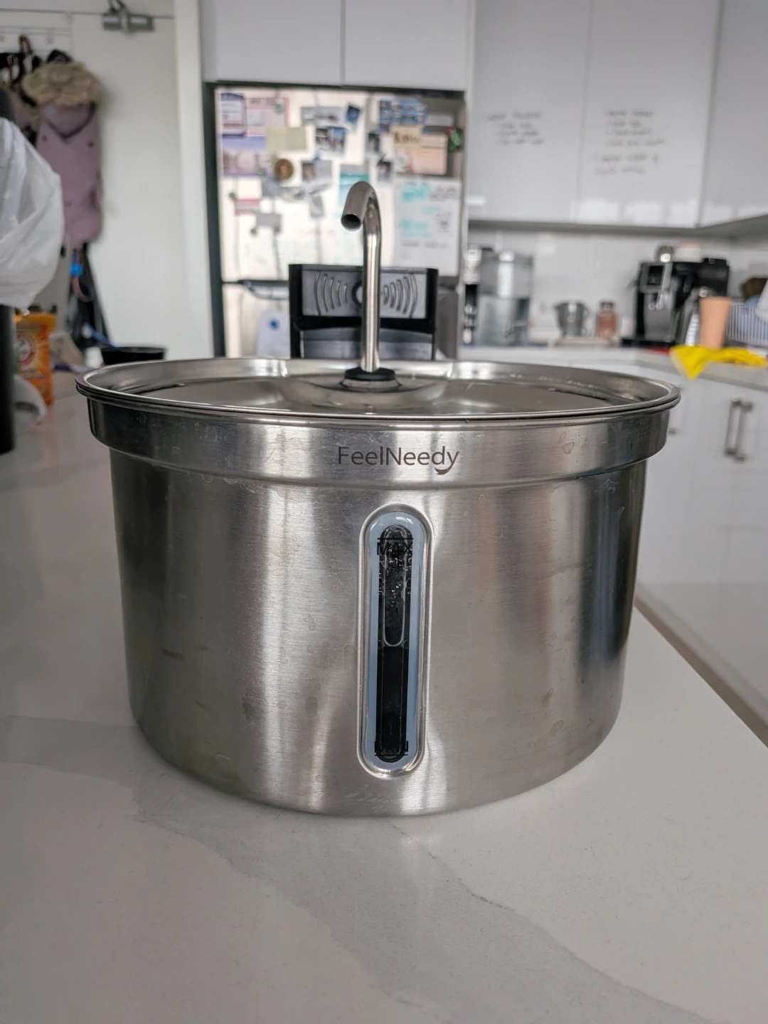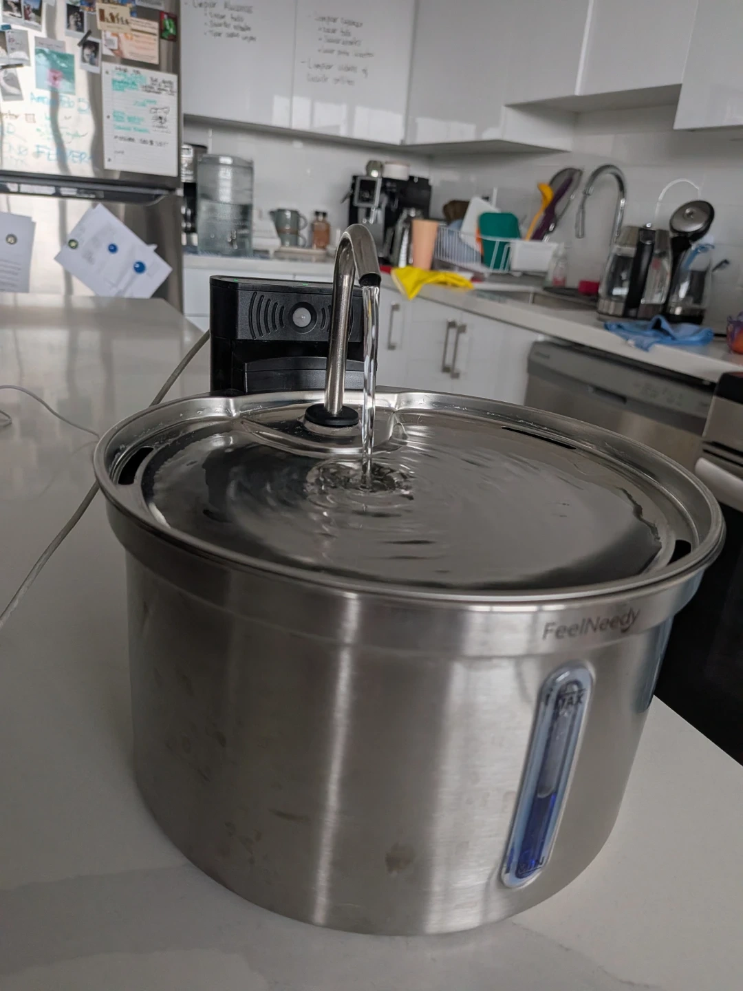 Selling a FeelNeedy wireless pet water fountain. It provides a continuous flow of fresh, filtered water for your furry friends. The stainless steel design is easy to clean and maintain. Great for keeping your pets hydrated! Holds up to 3.5L.