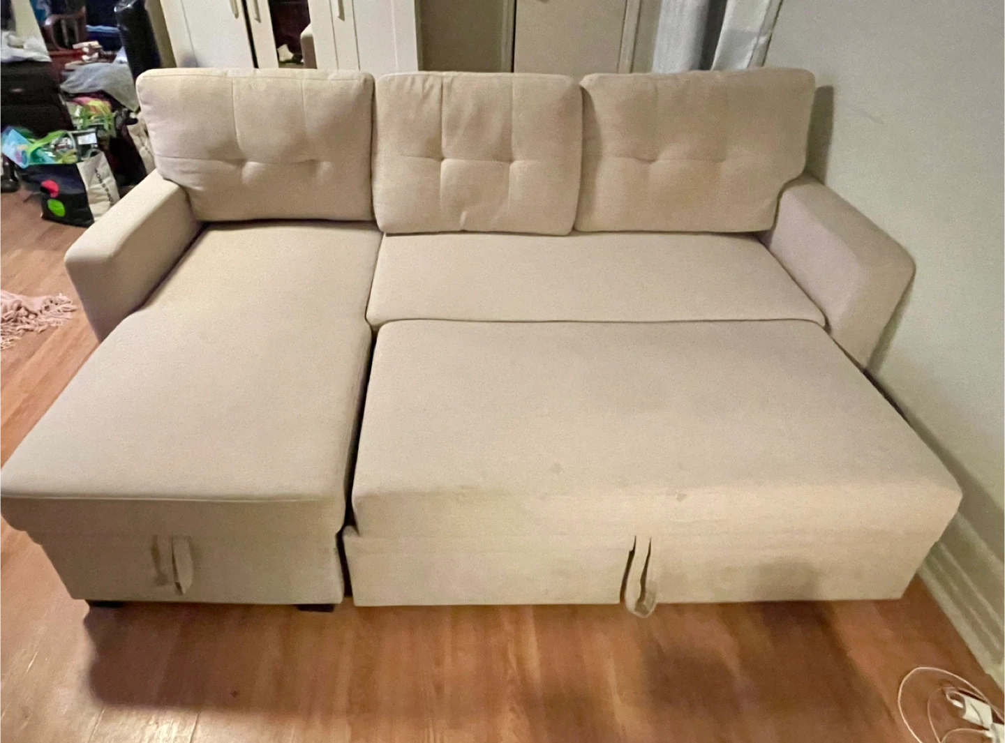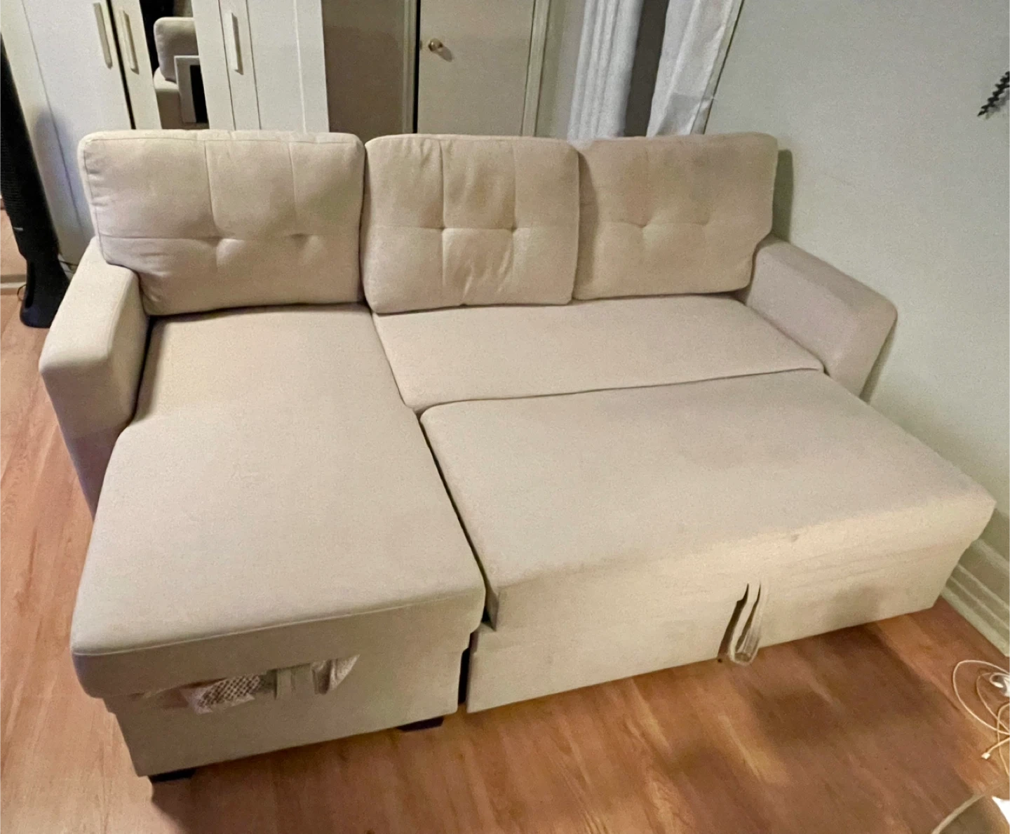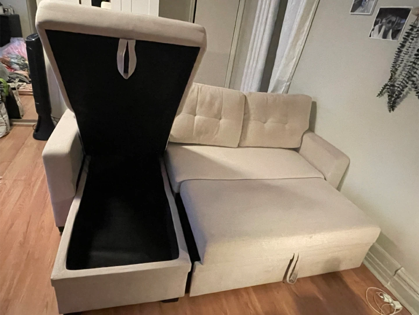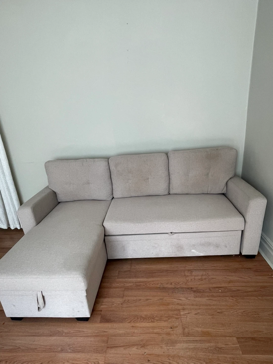 Selling a comfortable beige sectional sofa! It features convenient storage compartments, perfect for keeping your living space tidy. The sofa is in great condition and ready for a new home. It's a stylish and functional addition to any living room