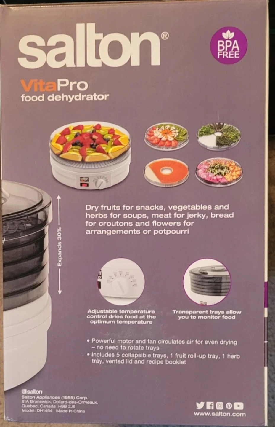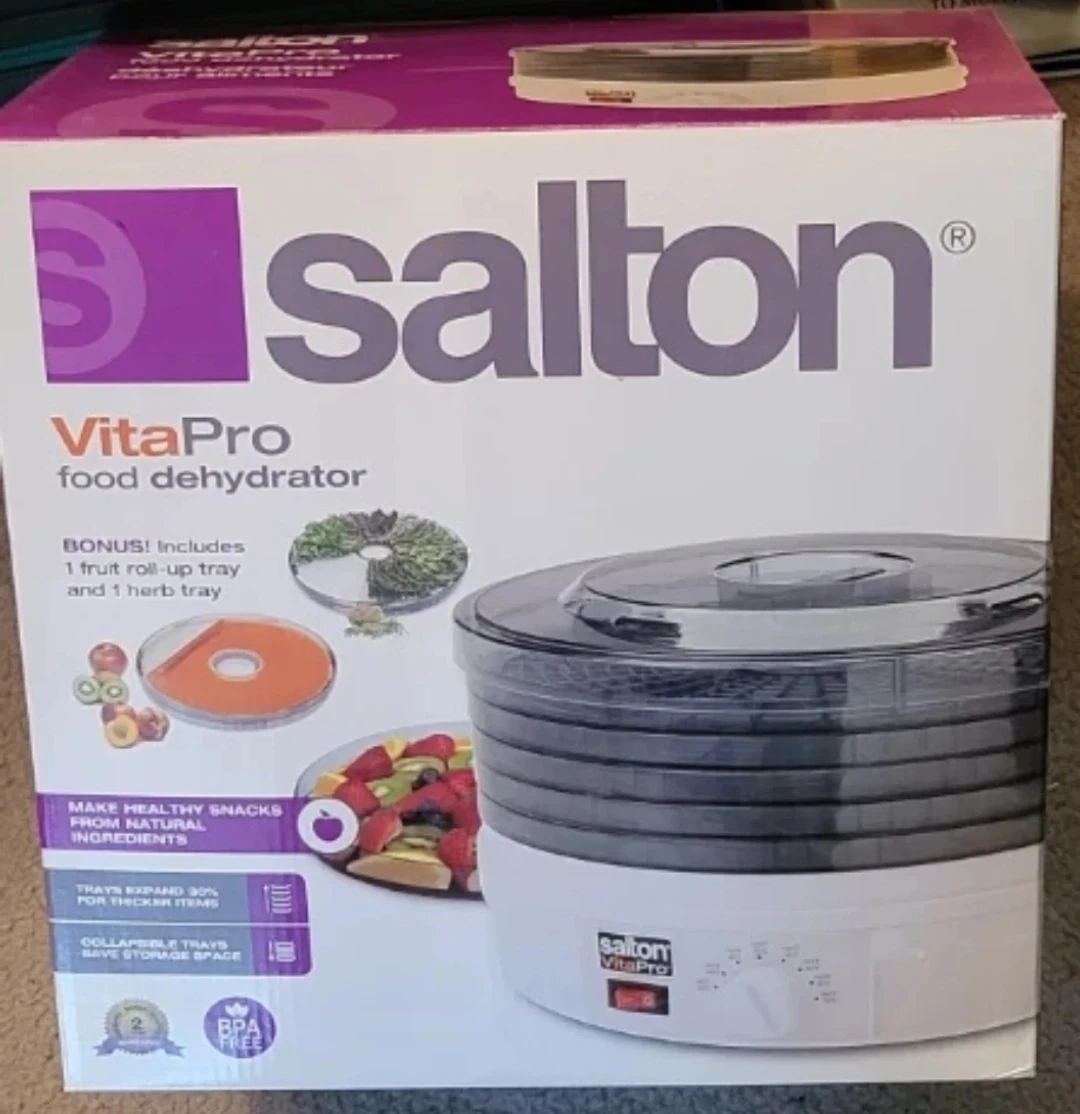 Selling a brand new Salton VitaPro food dehydrator, still in its original box! It's perfect for making healthy snacks from fruits, vegetables, herbs, and more. The dehydrator features adjustable temperature control and transparent trays to easily monitor your food.