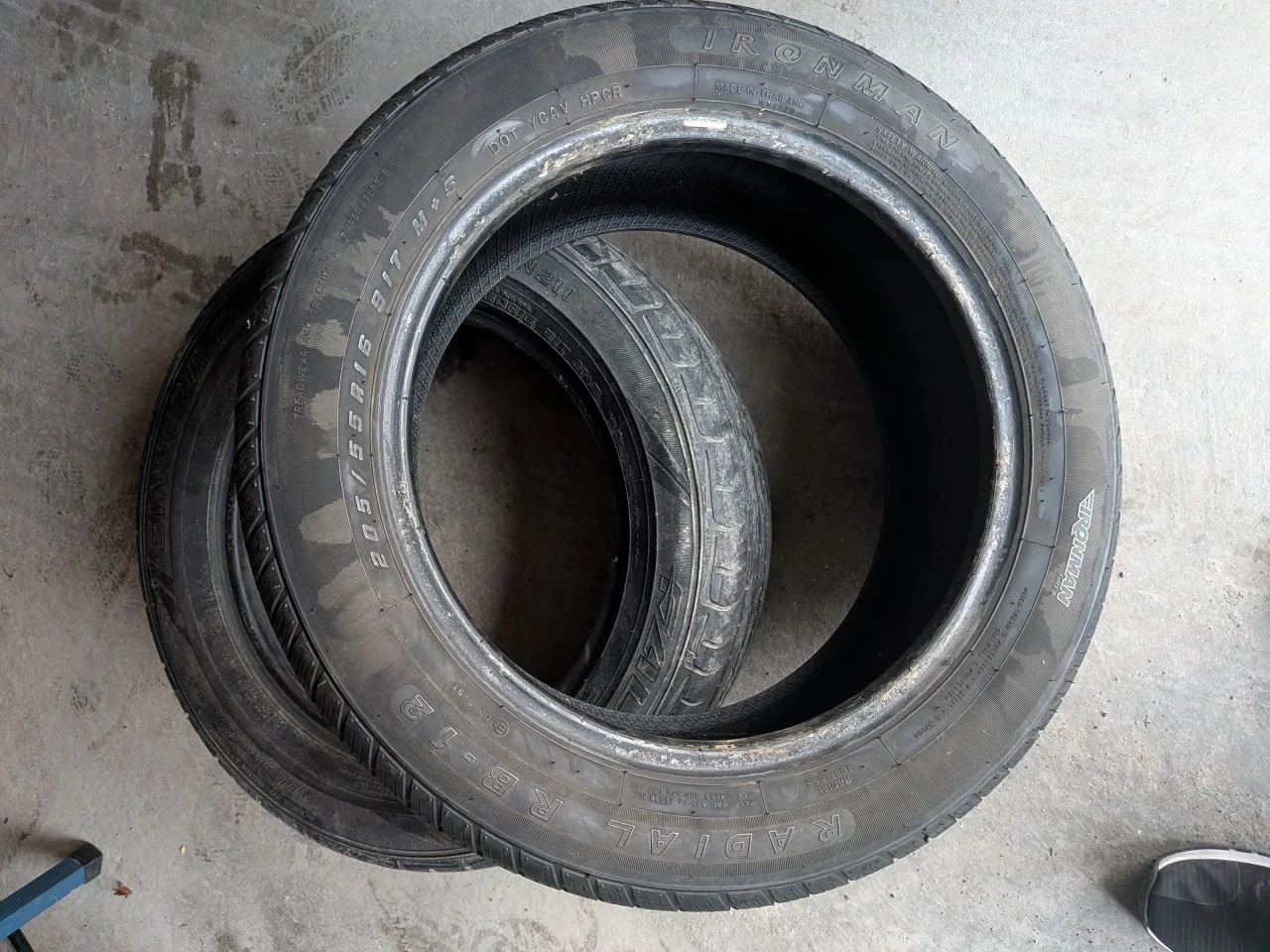 Selling a set of Ironman Radial RB-12 tires, size 205/55R16. They're in used condition, so please check the photos for tread wear and overall condition