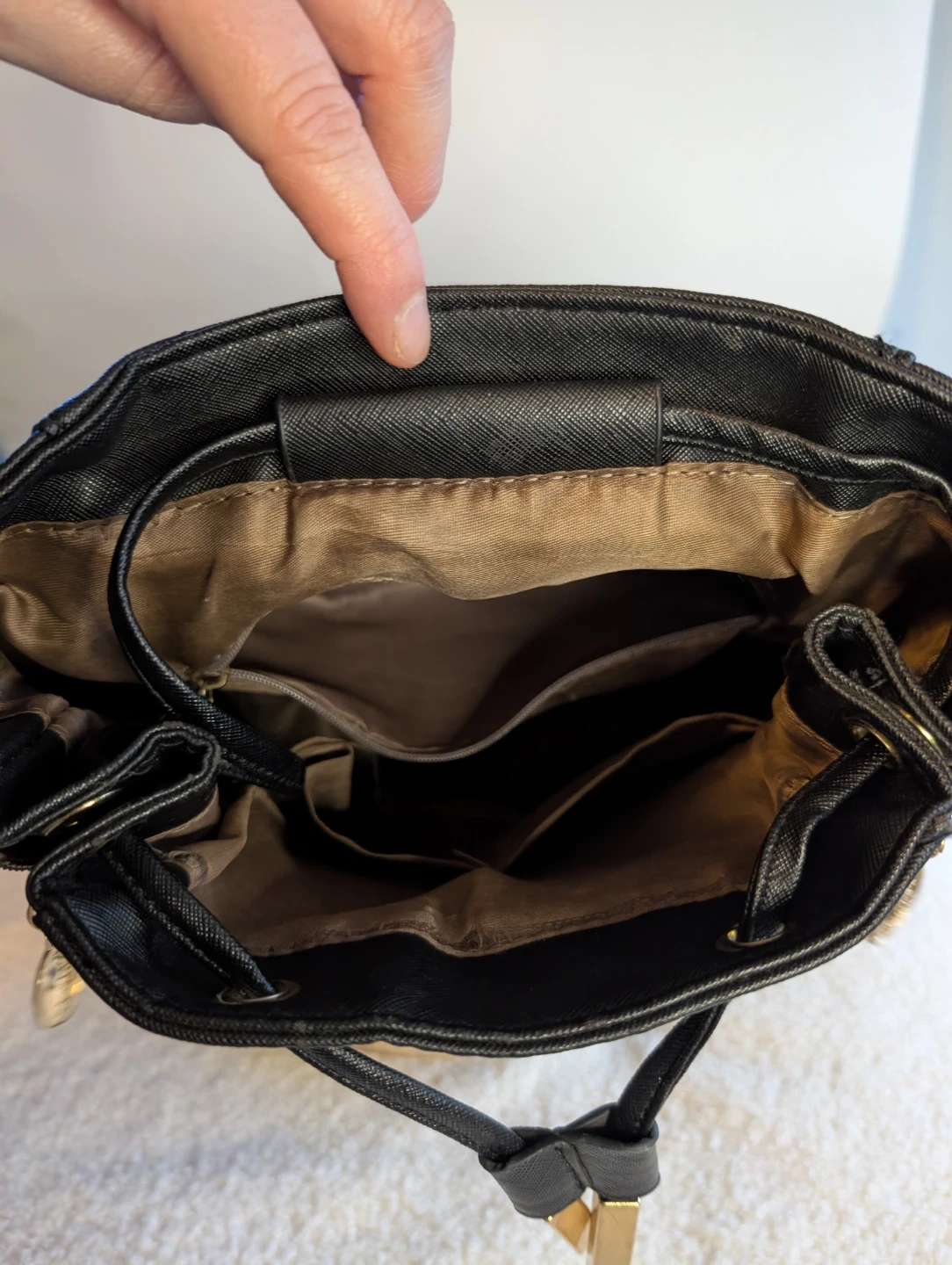 This is a cute black mini backpack! It's in great condition and ready for a new home. It features a top handle and adjustable shoulder straps, and two front zippers allow for it to expand out. There's also a zippered pocket on the back and a couple of interior pockets