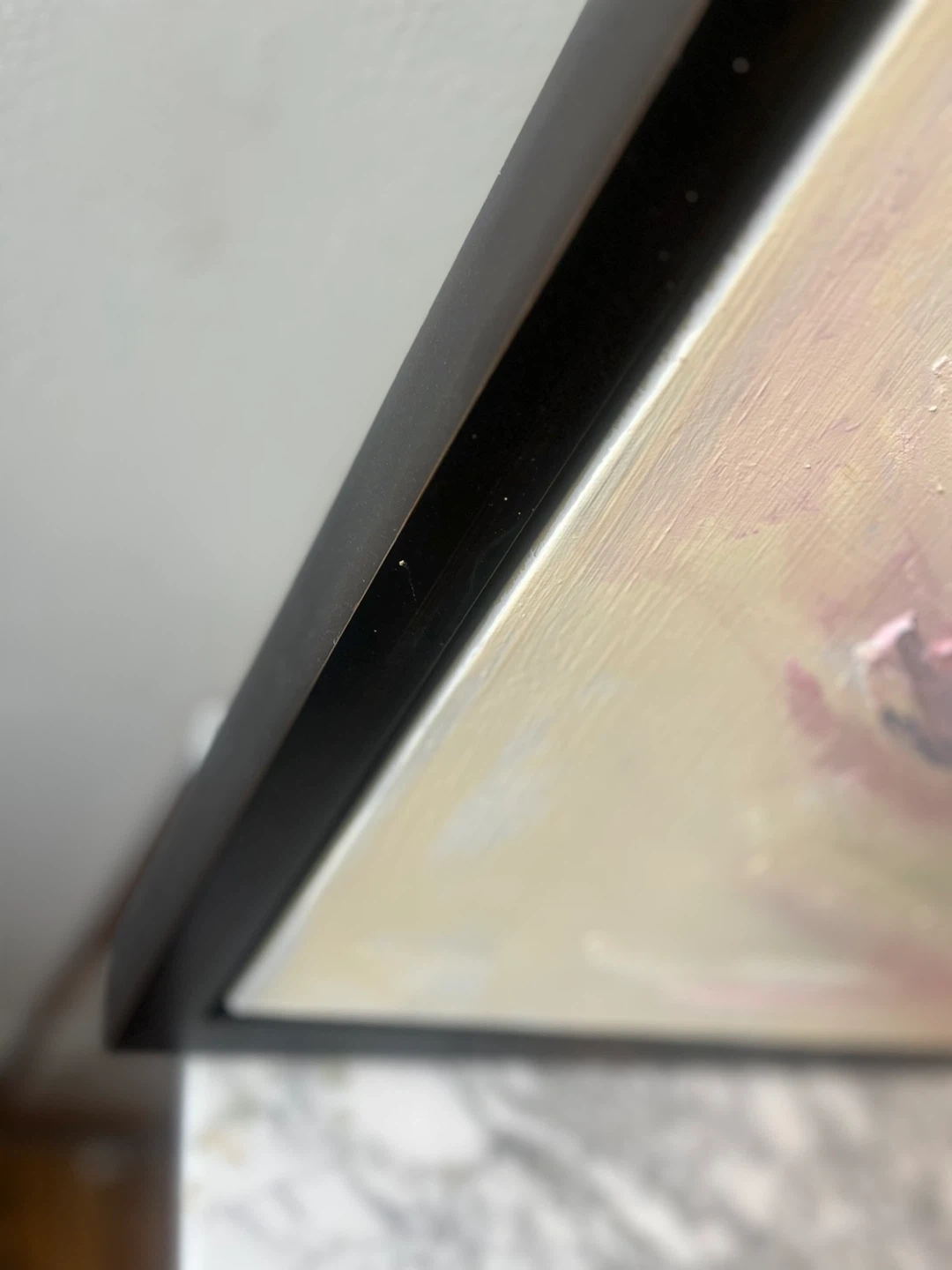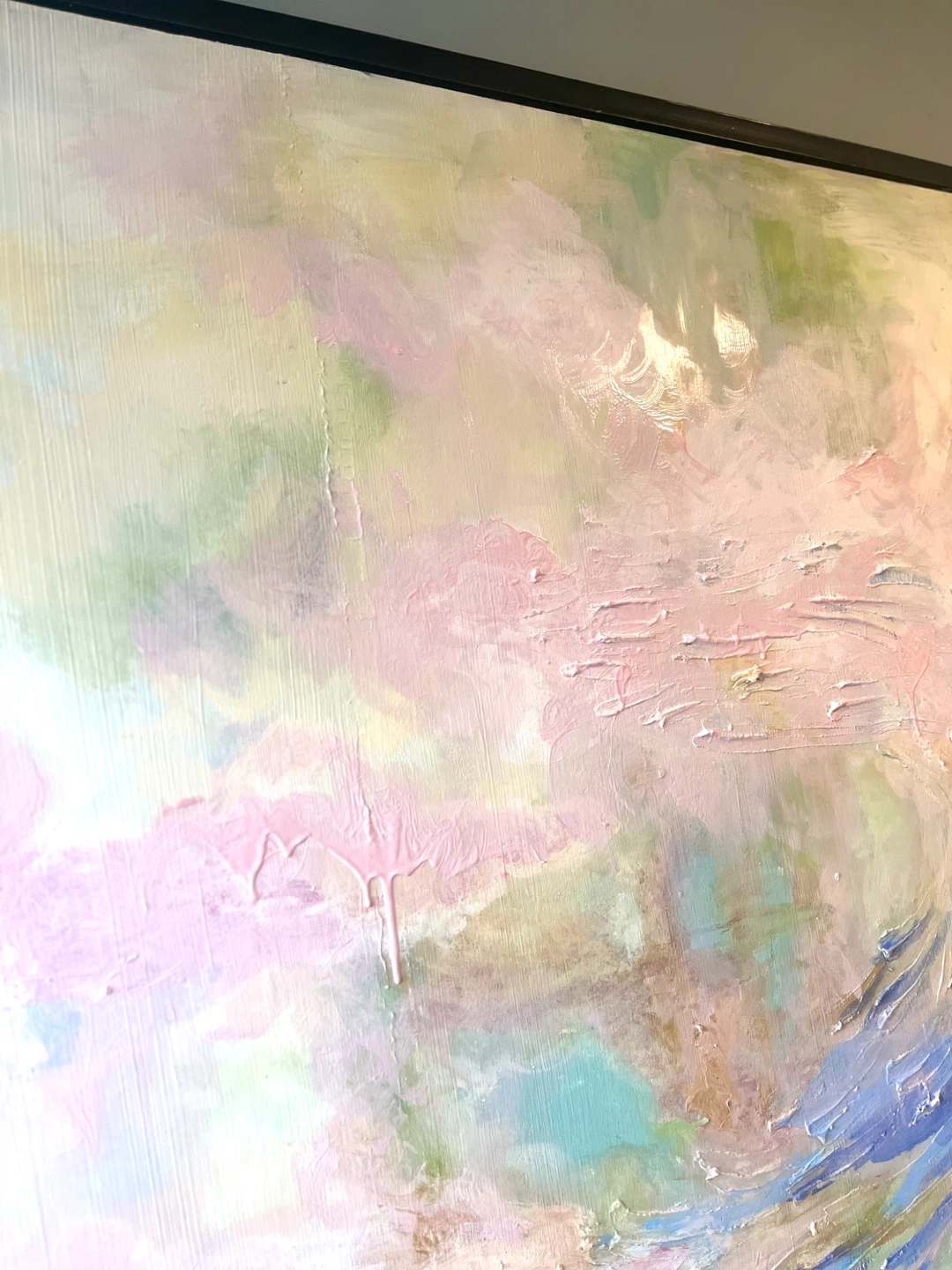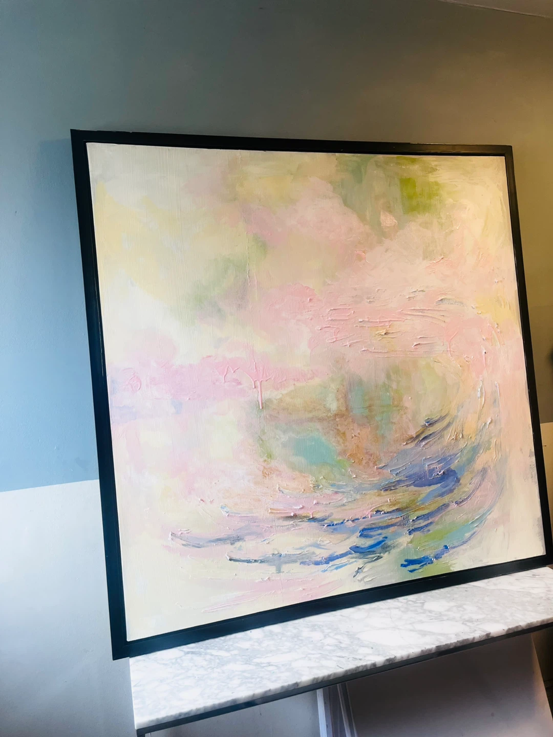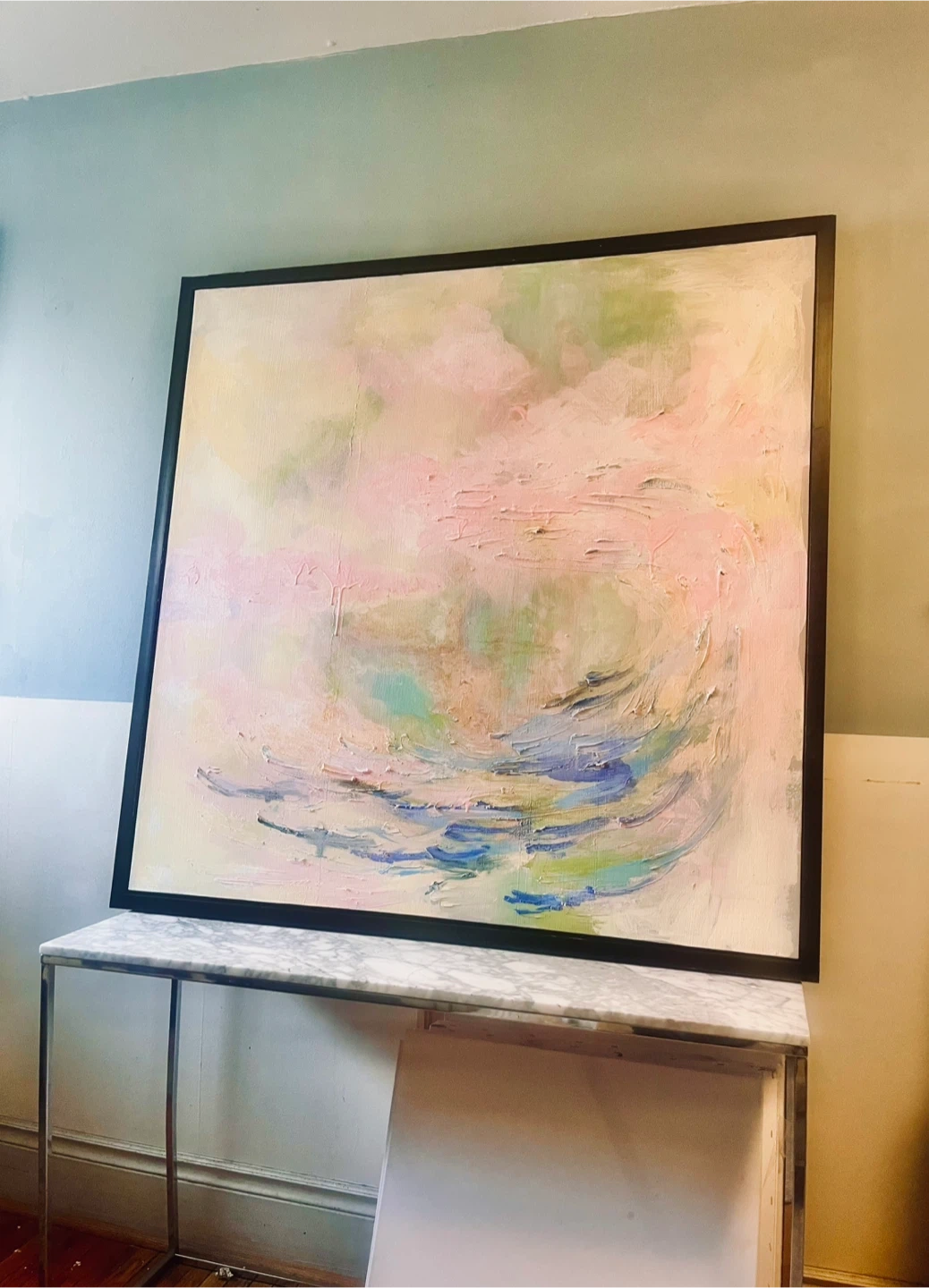 Selling a beautiful abstract painting with a sleek black frame! The colours are soft and calming, with hints of pink, green, and blue. It would look great in any room and add a touch of elegance